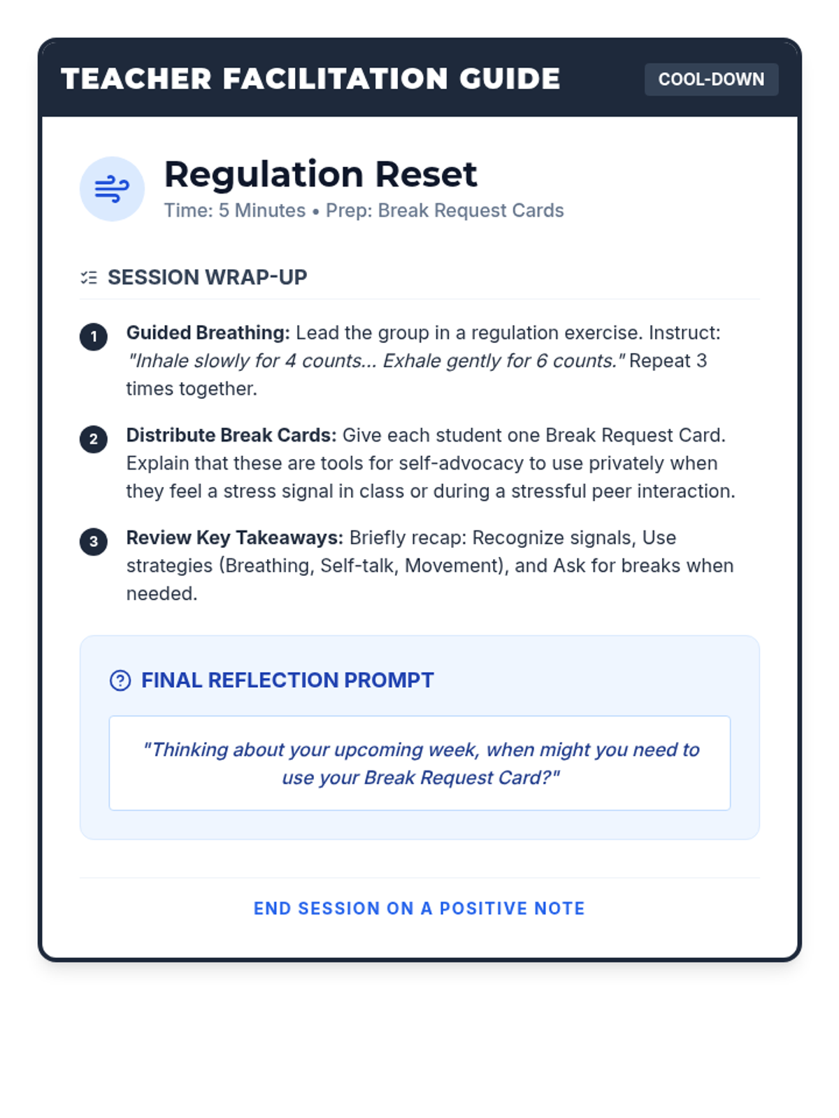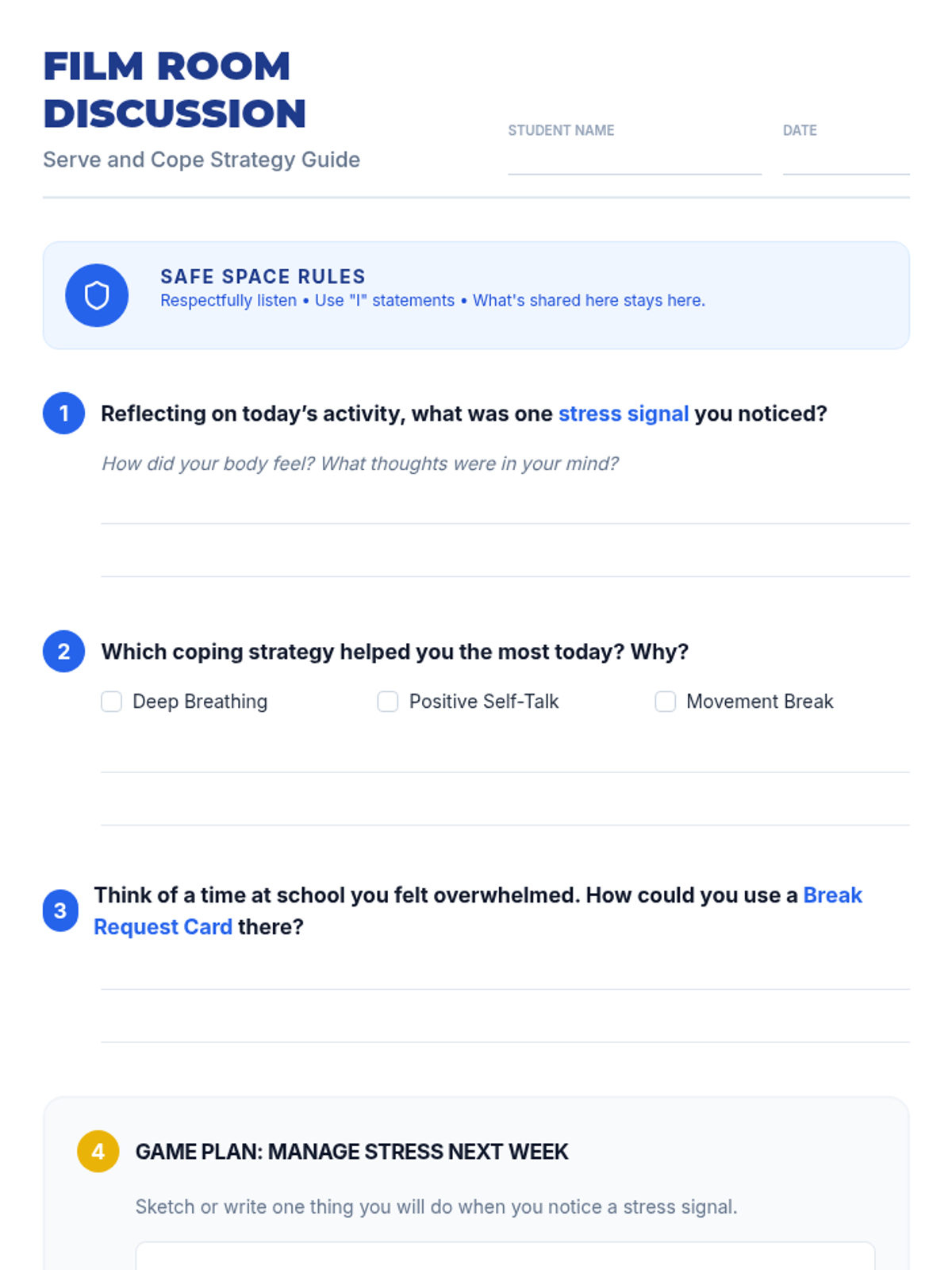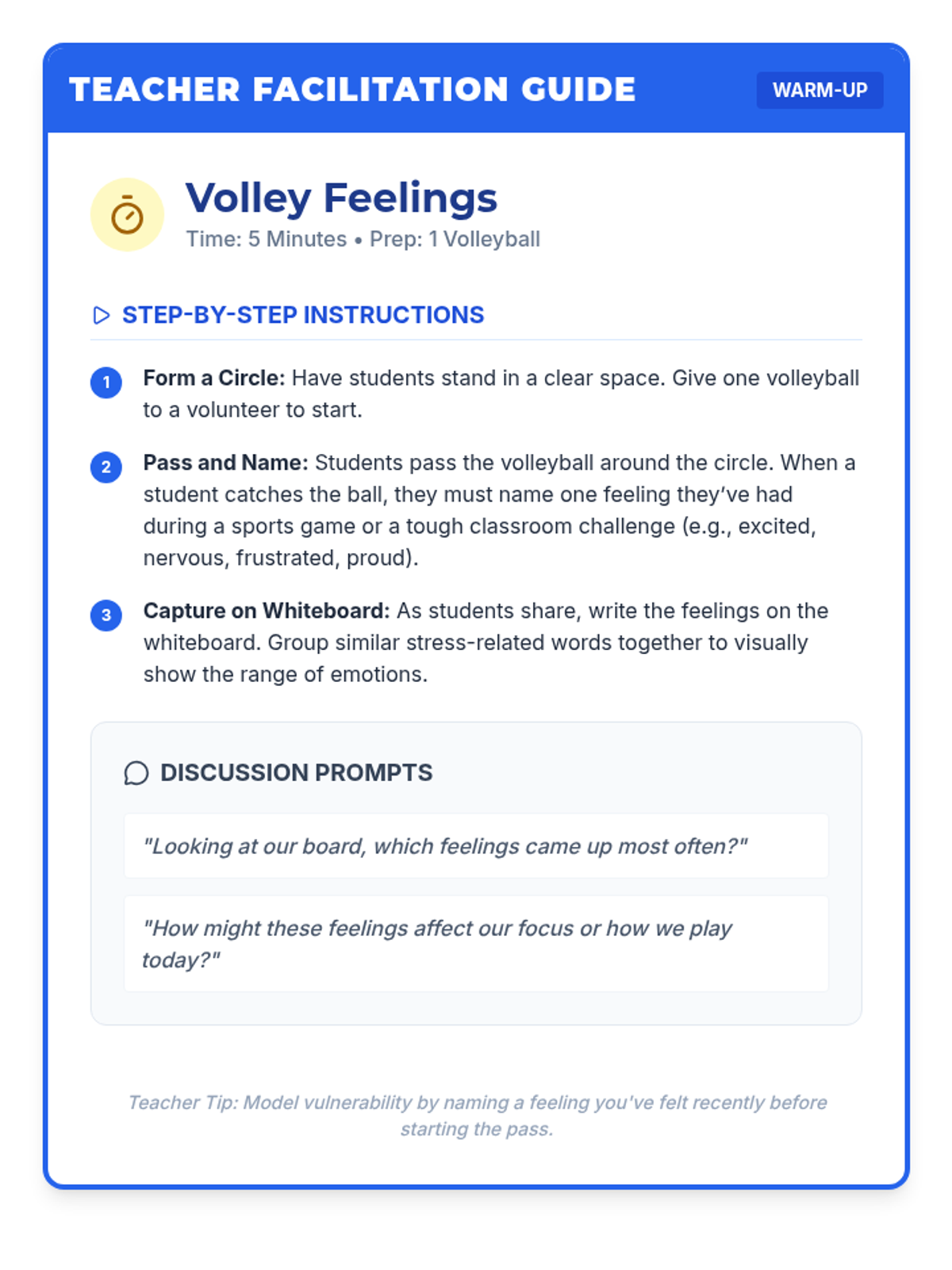 In this 45-minute group session, 7th-grade students explore emotional regulation through volleyball, learning to identify stress signals and practice coping strategies in a supportive small-group setting.