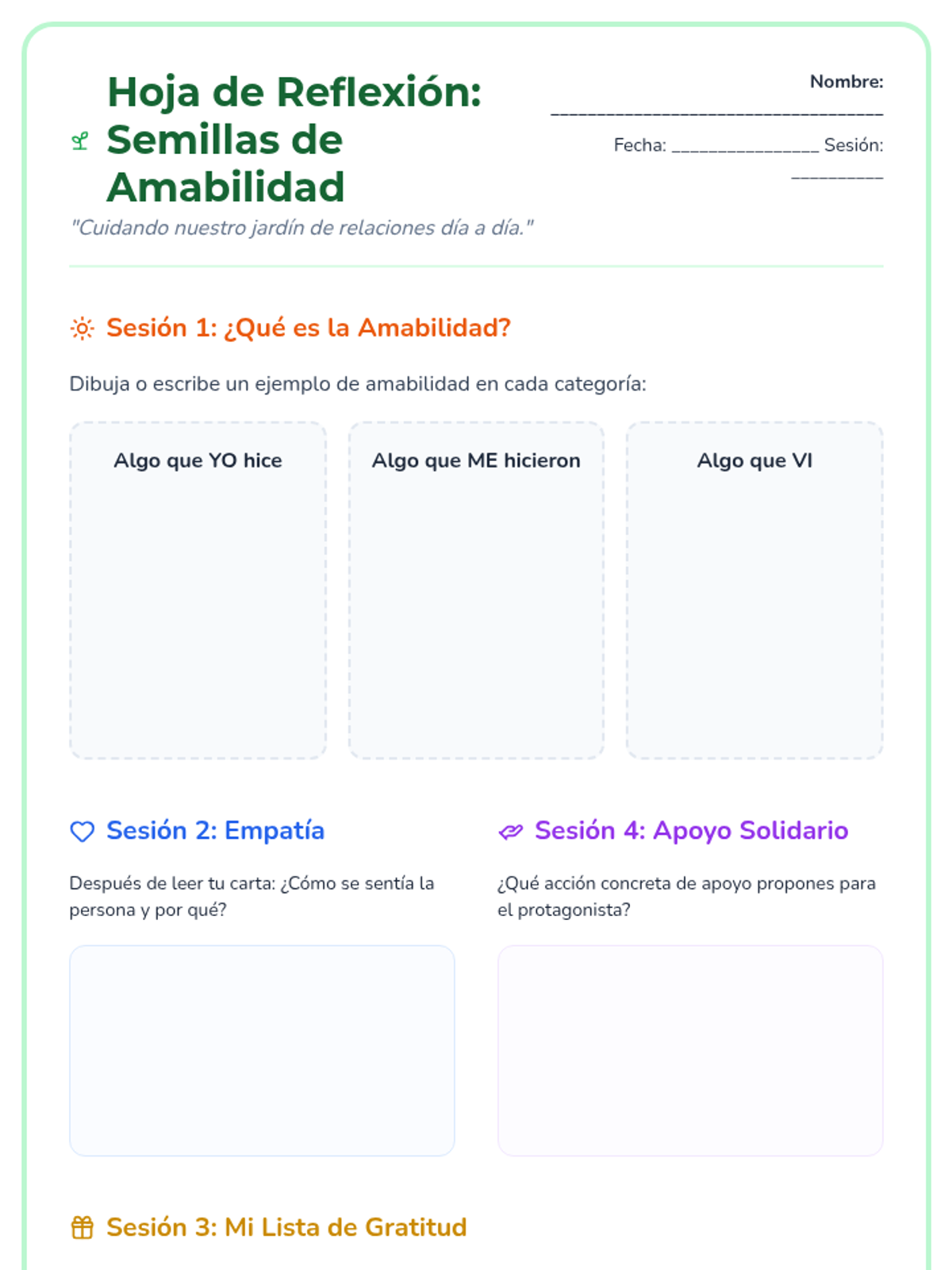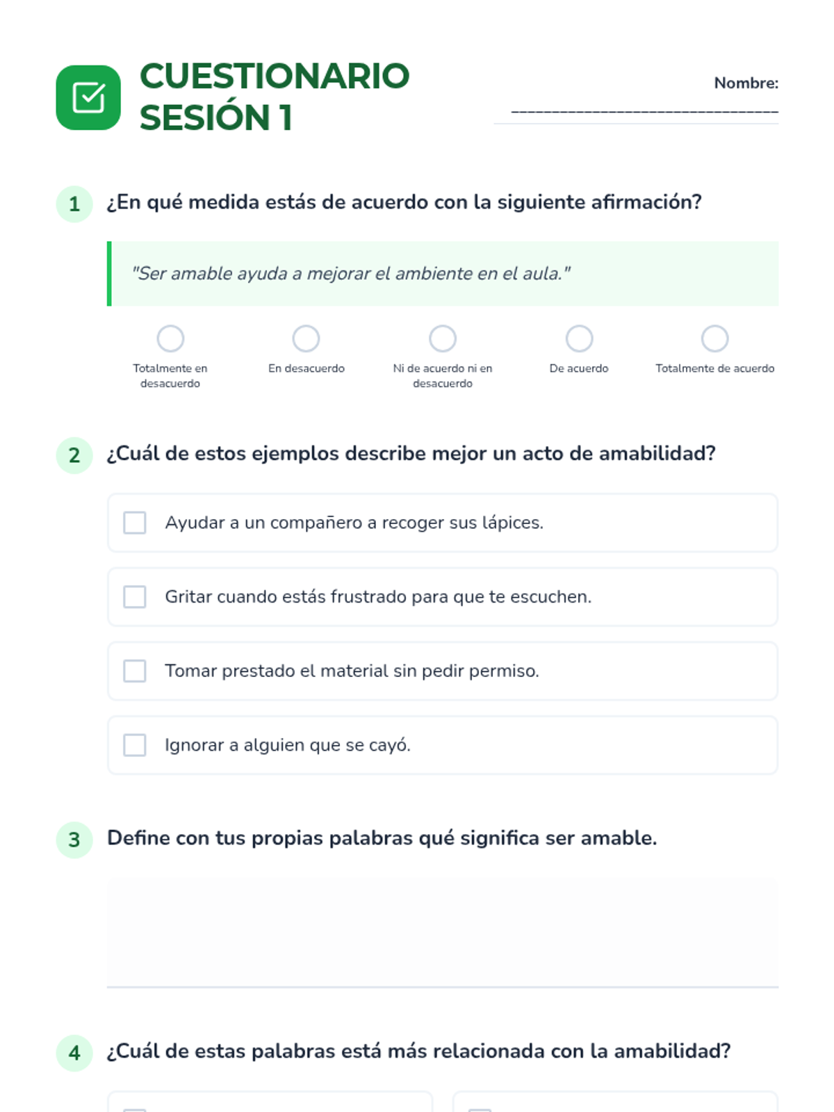 Introducción al concepto de amabilidad y su importancia en el clima del aula a través de la reflexión personal y juegos grupales.