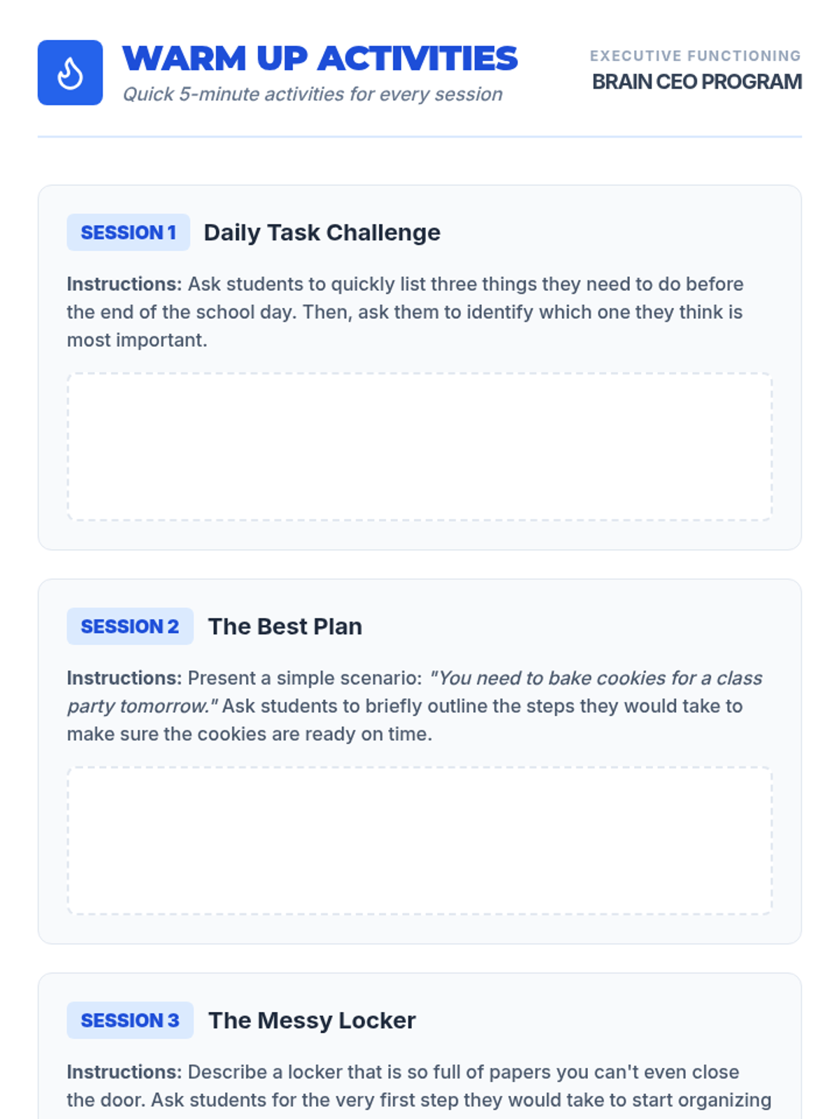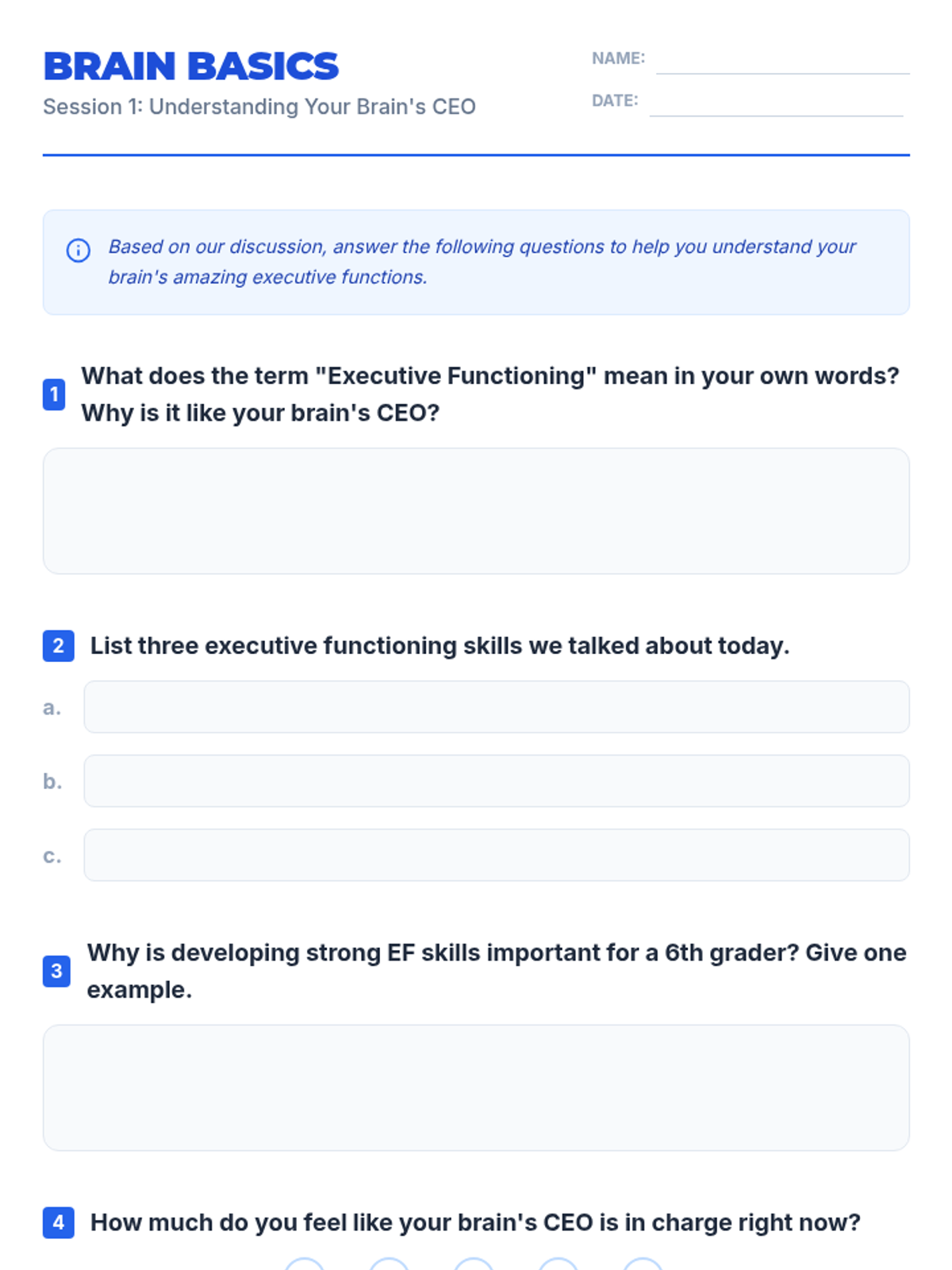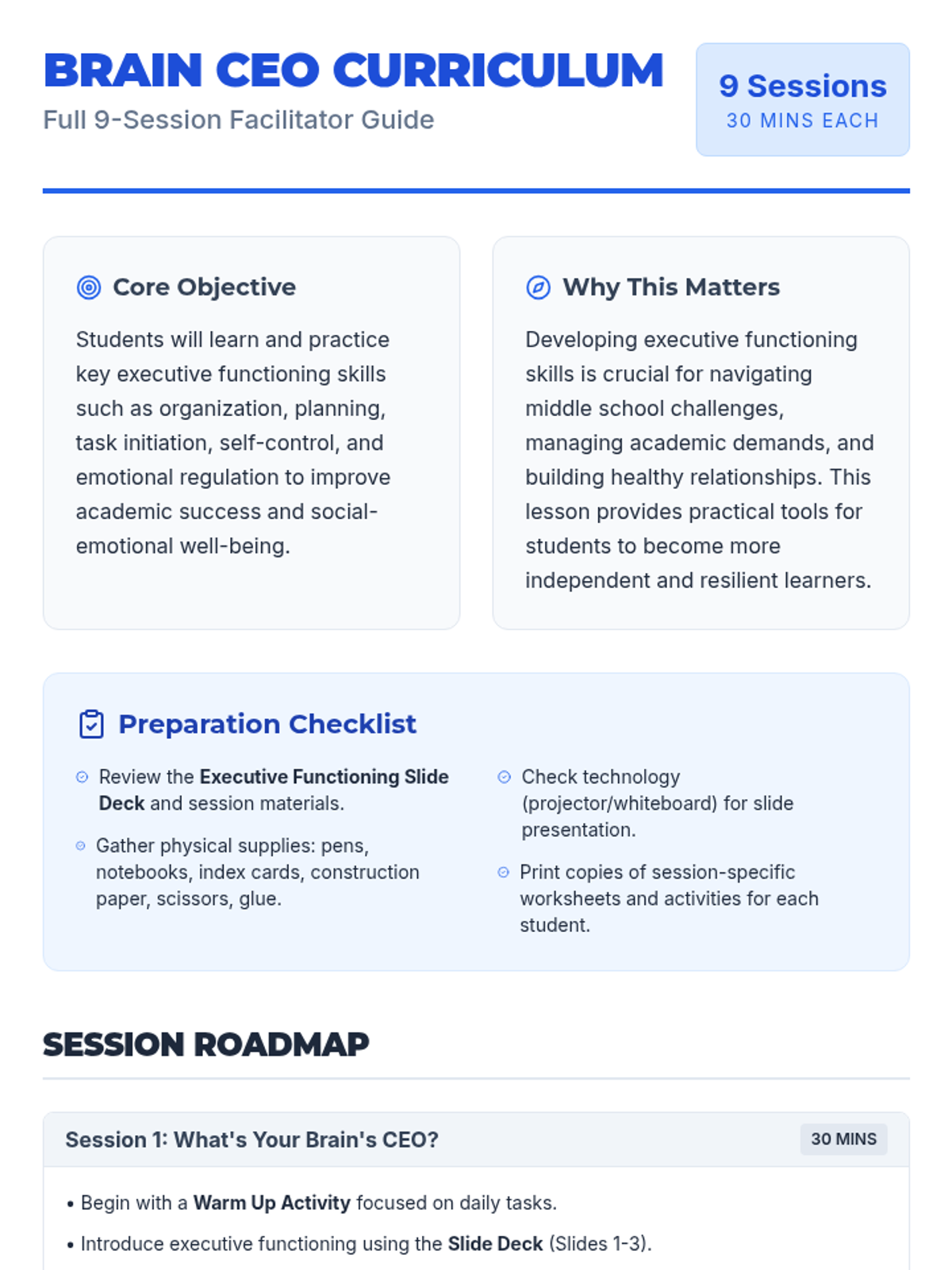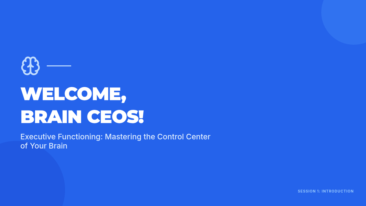 An introduction to executive functioning, exploring the 'Brain CEO' metaphor and identifying the core skills students will develop throughout the curriculum.