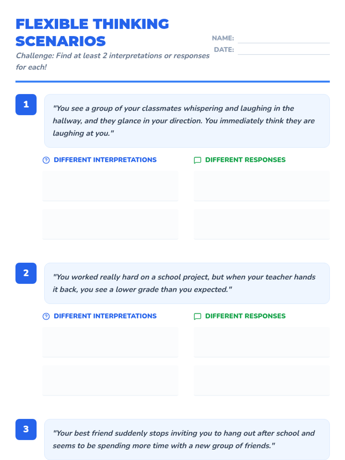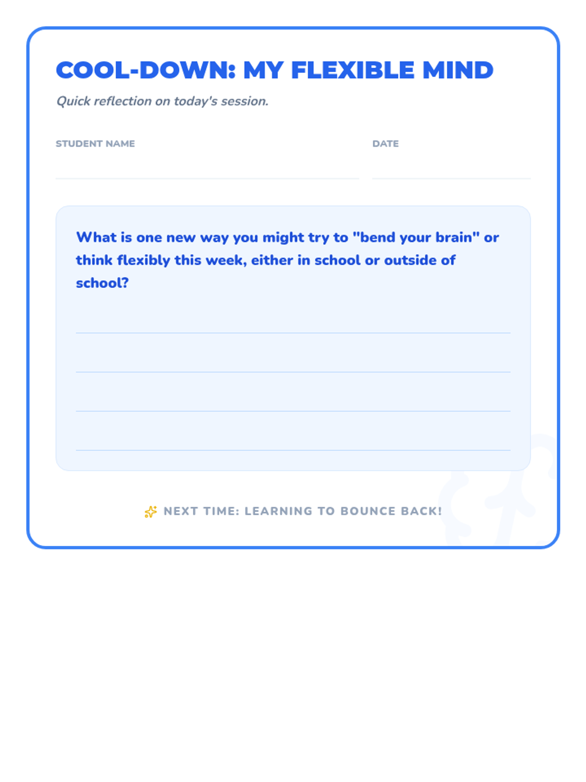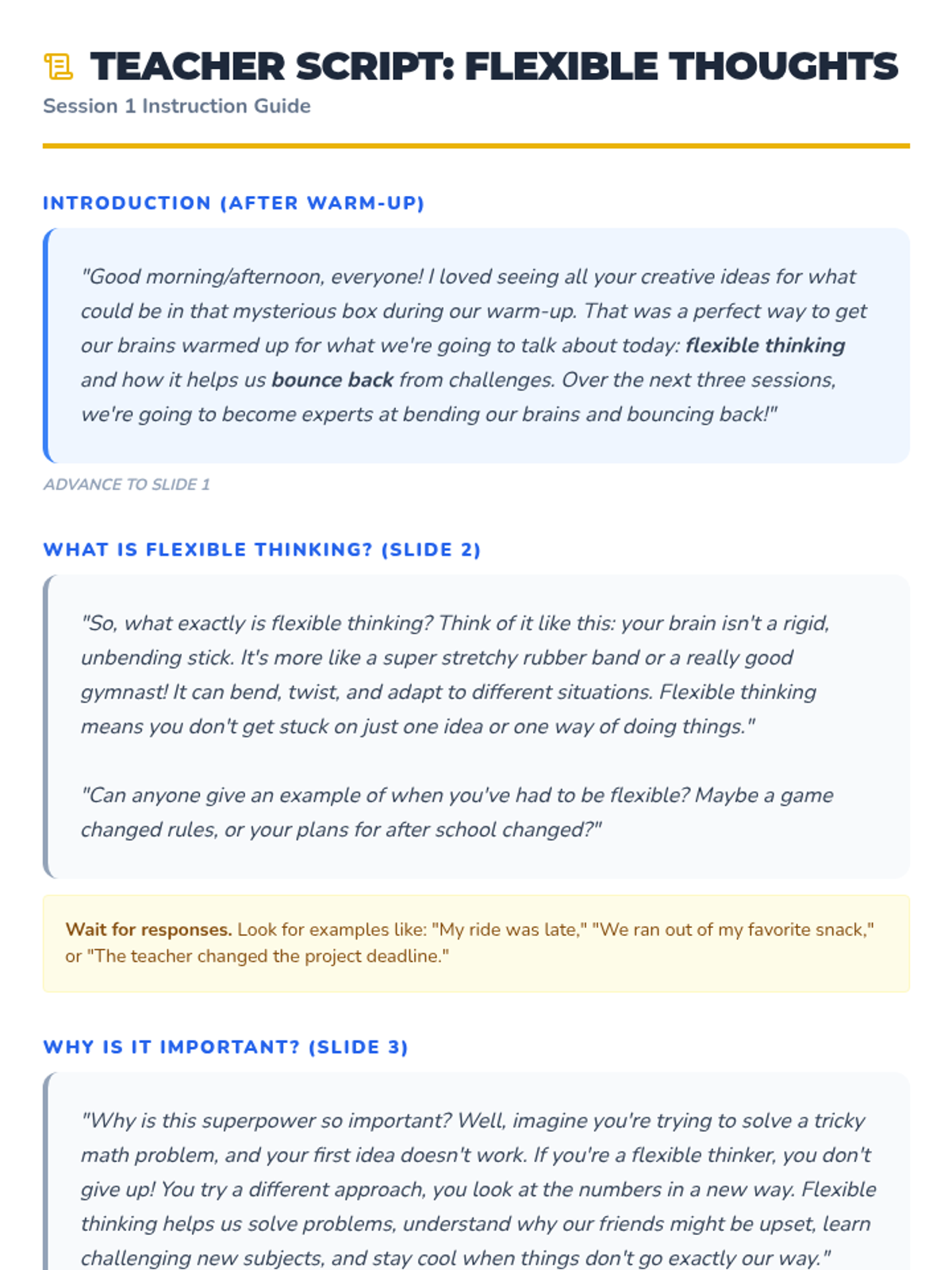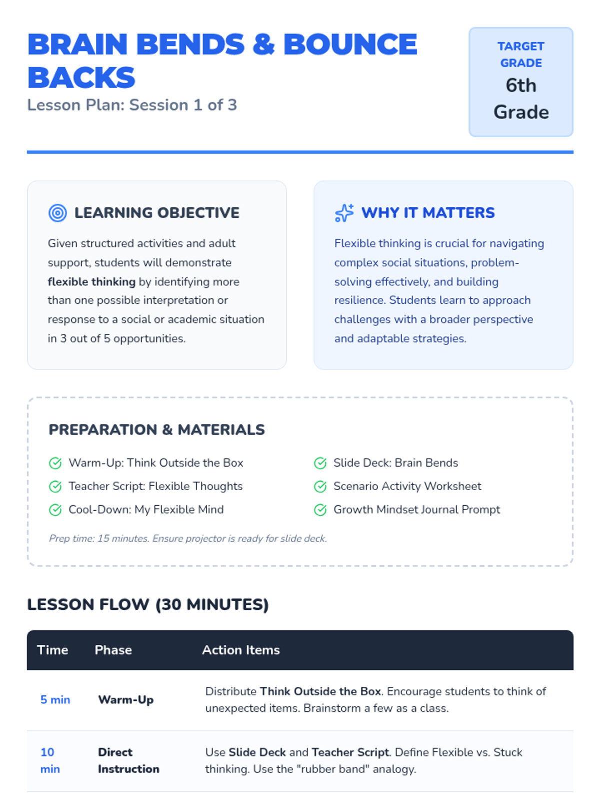 The first session introduces the concept of flexible thinking, contrasting it with 'stuck' thinking and practicing identifying multiple perspectives in social and academic scenarios.