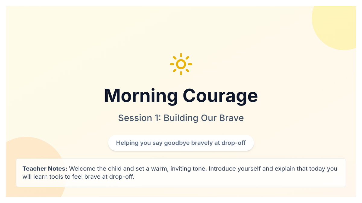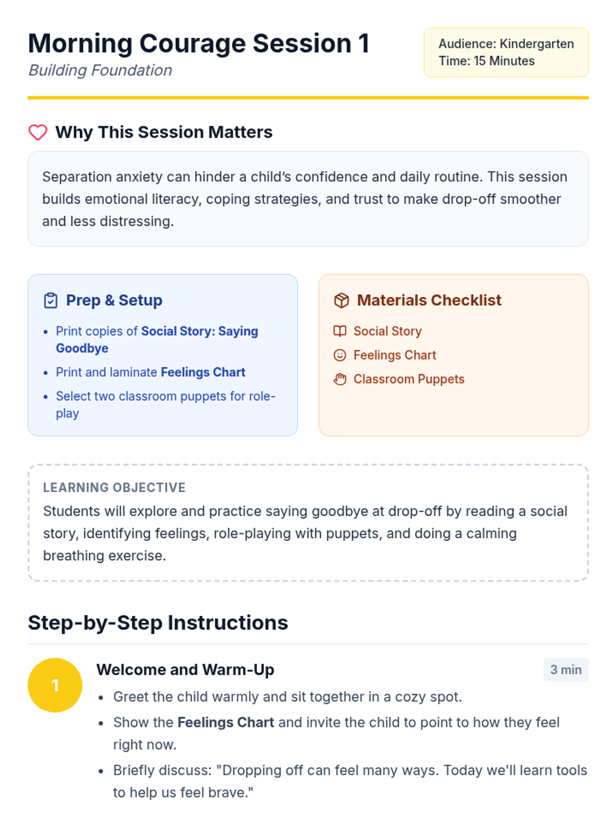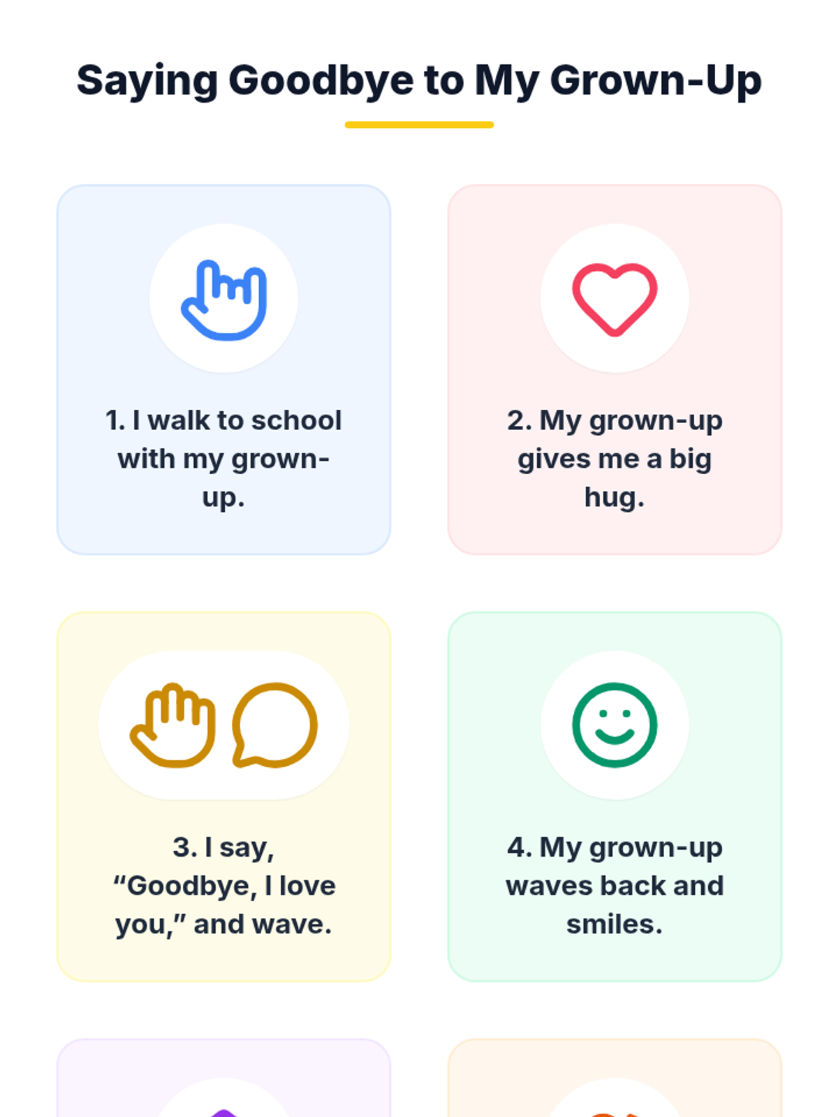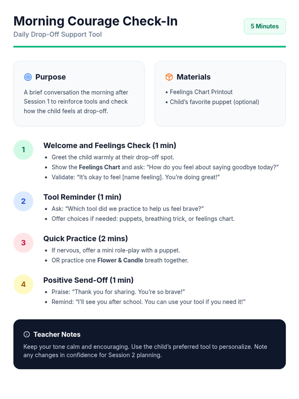Focuses on building emotional literacy and basic coping strategies for separation through a social story, feelings identification, and the 'Flower and Candle' breathing technique.
