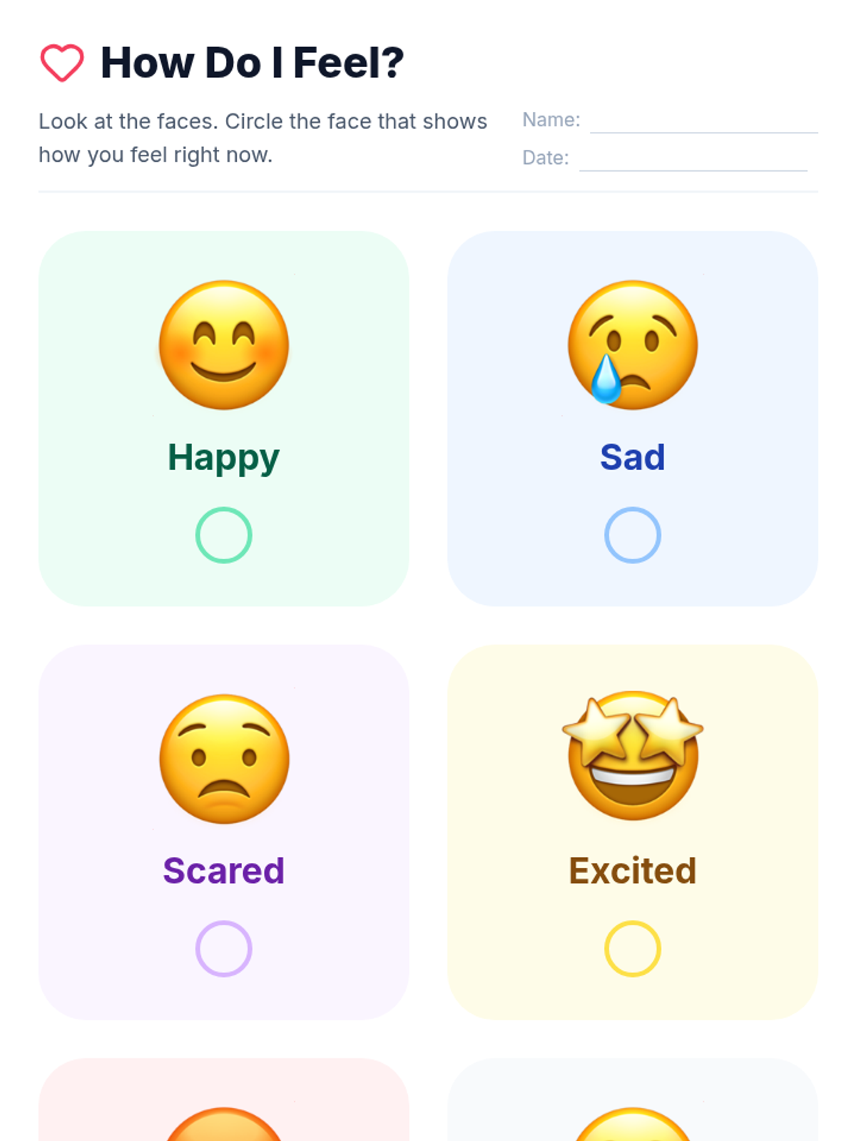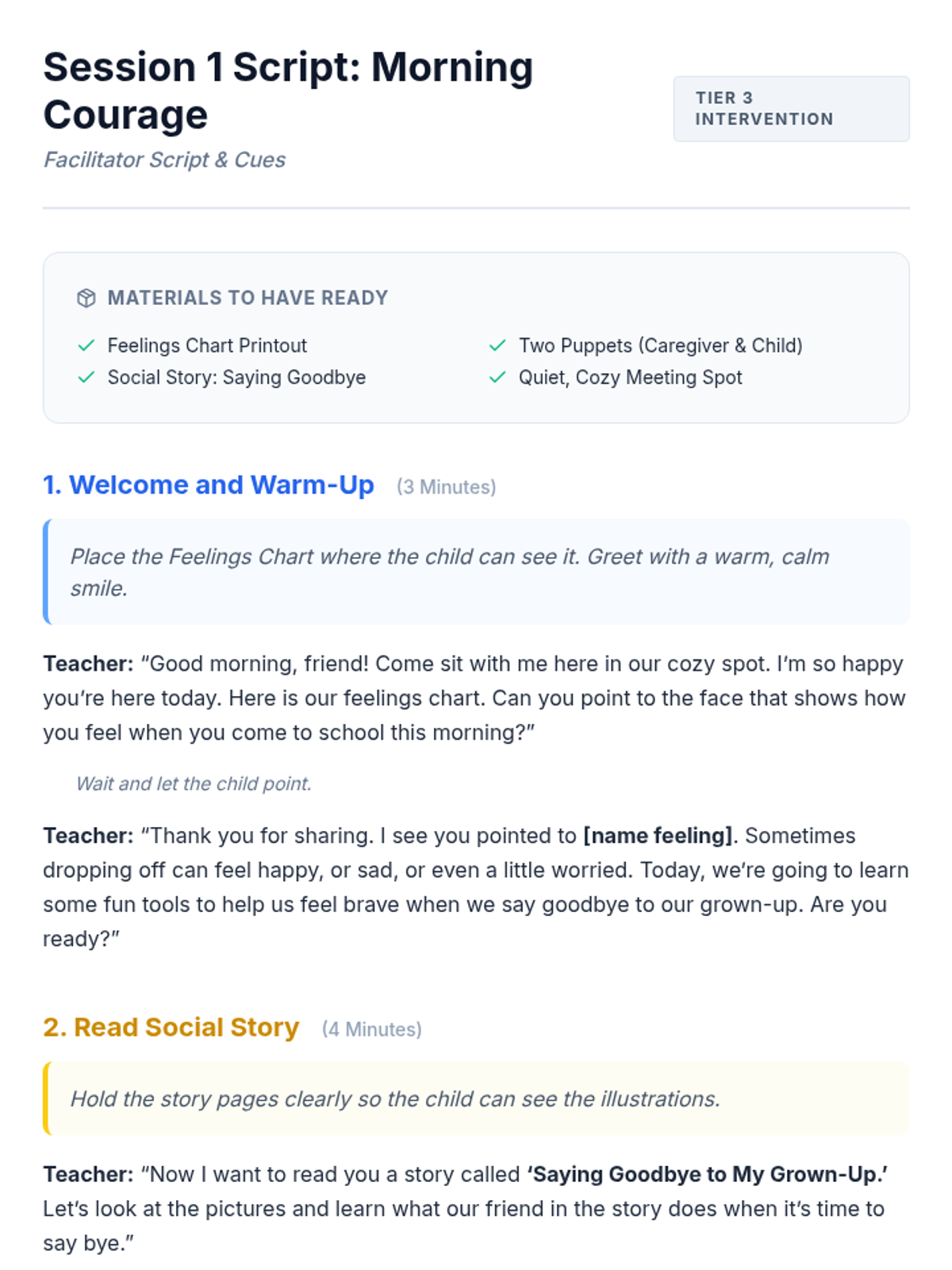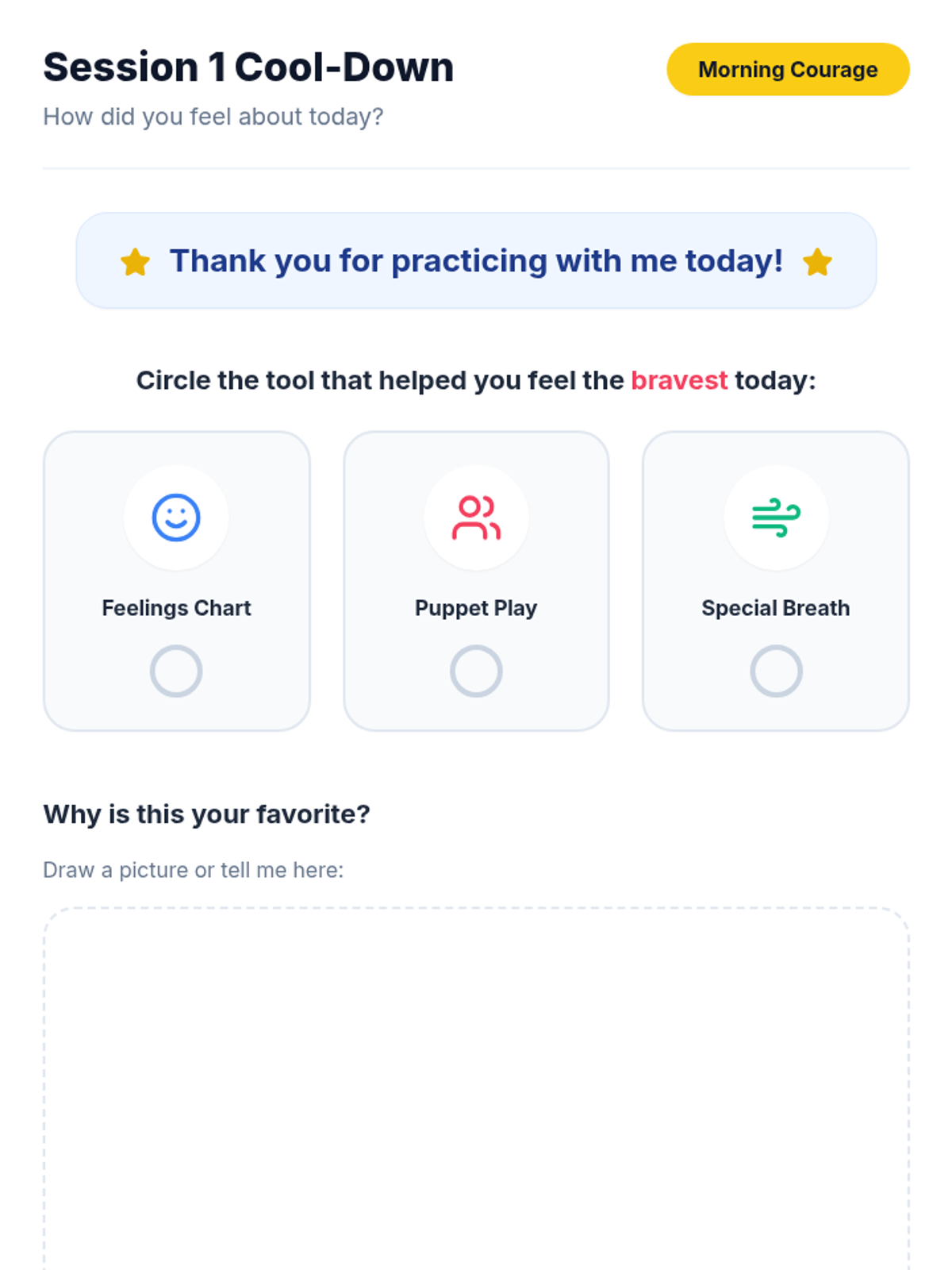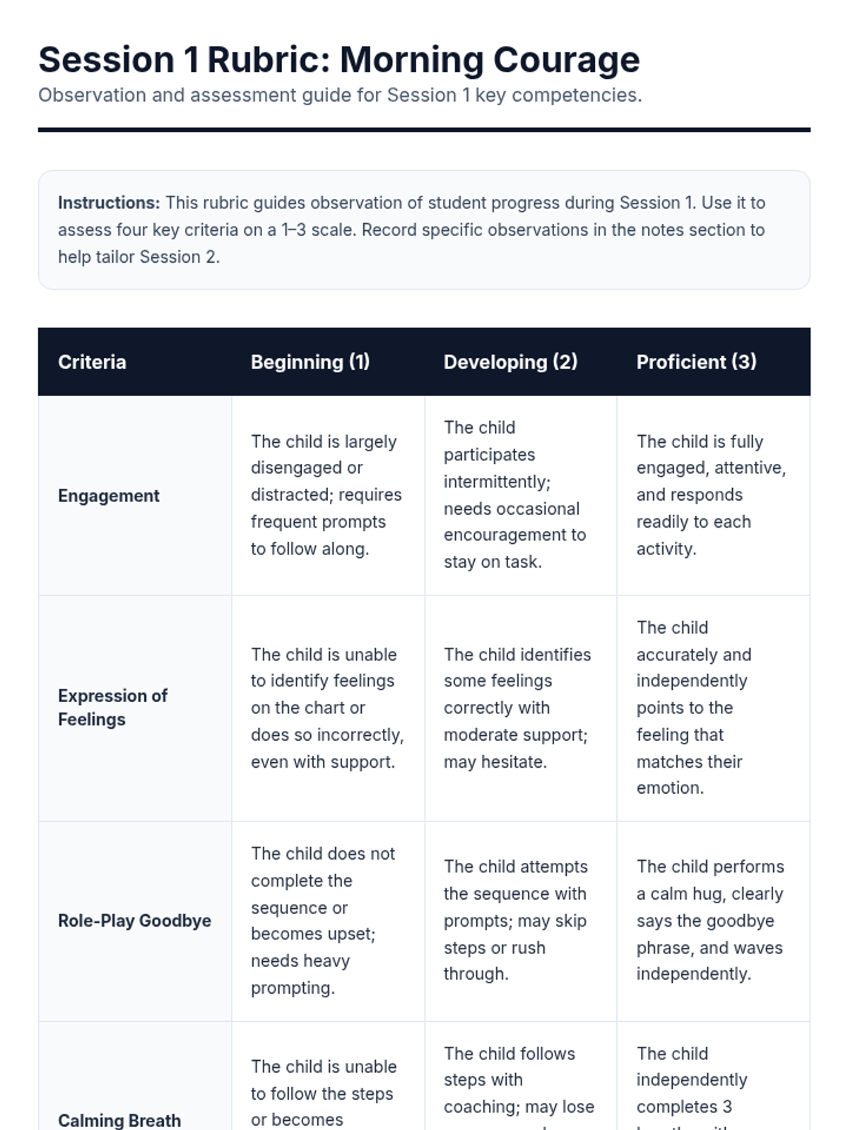 Focuses on building emotional literacy and basic coping strategies for separation through a social story, feelings identification, and the 'Flower and Candle' breathing technique.