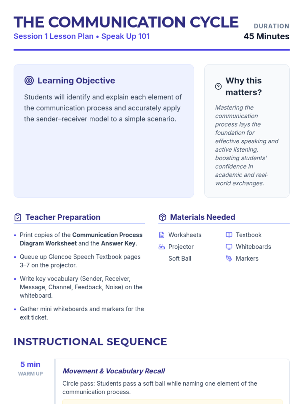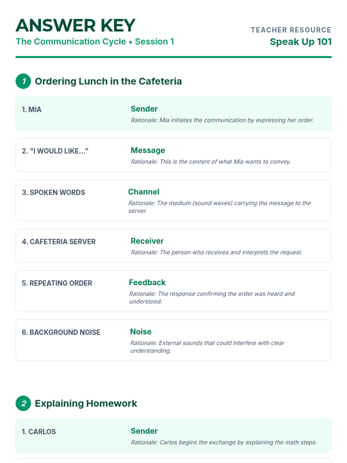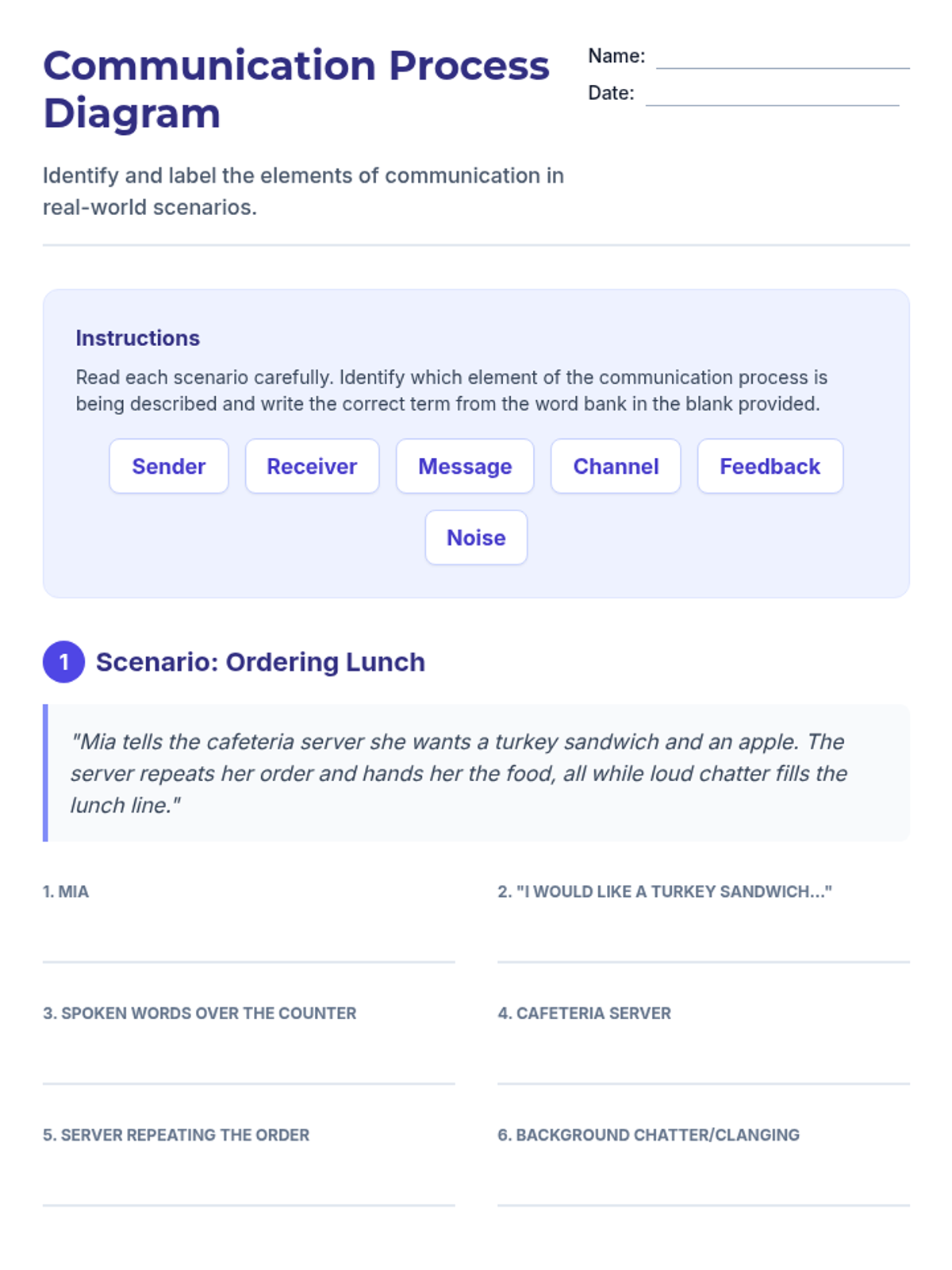 Students will identify and explain each element of the communication process and accurately apply the sender-receiver model to simple scenarios.