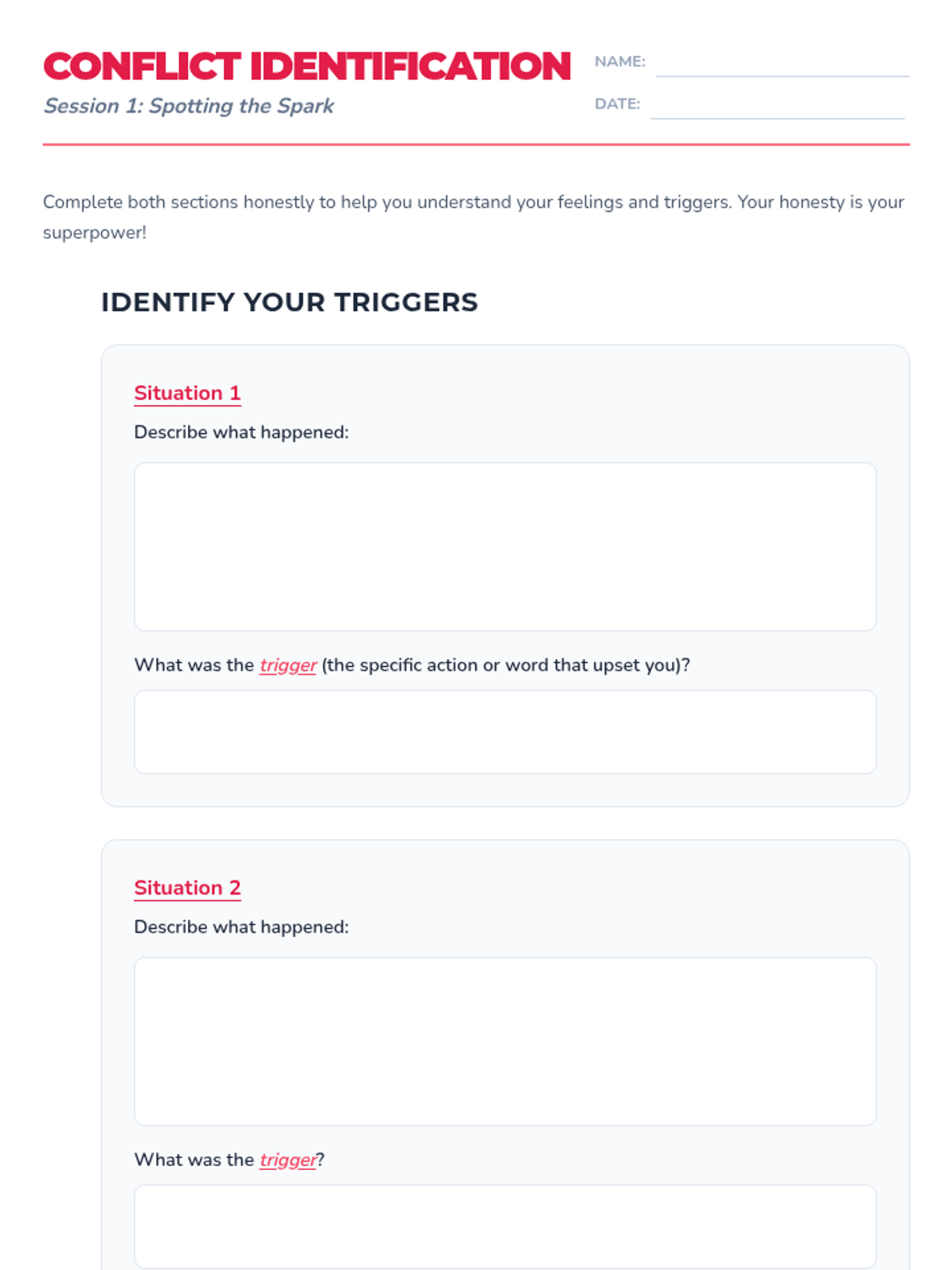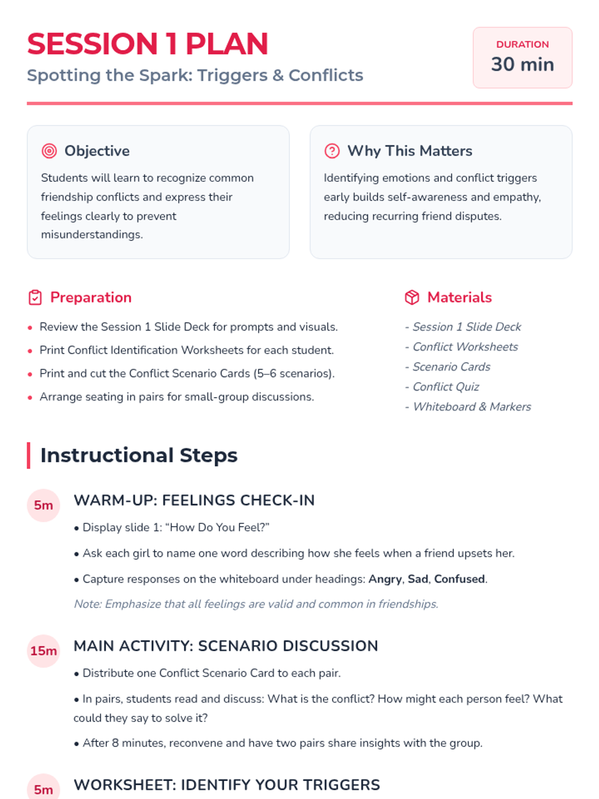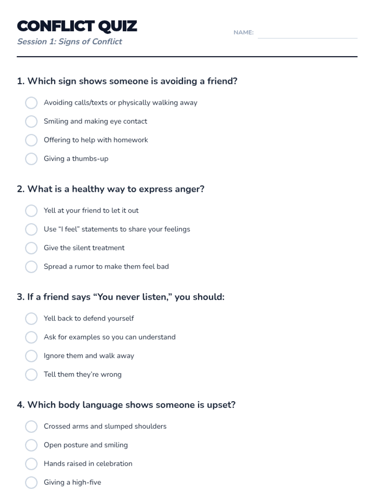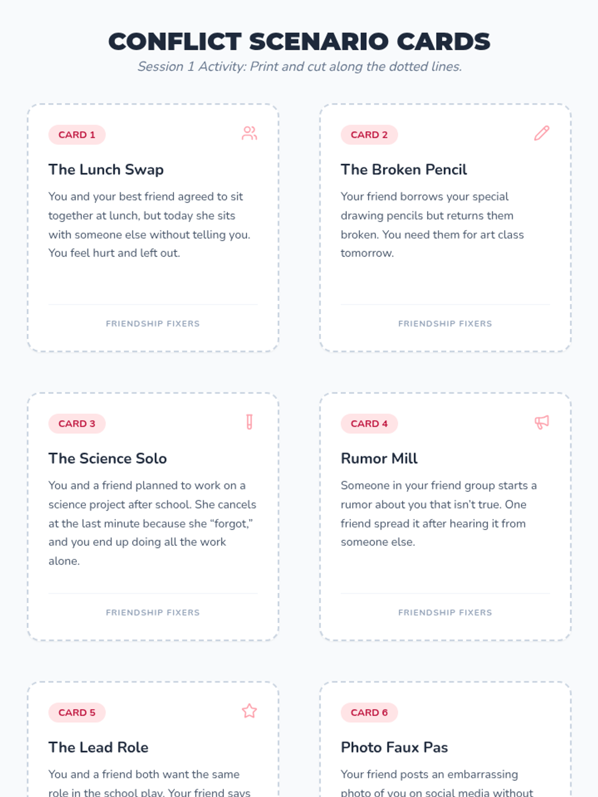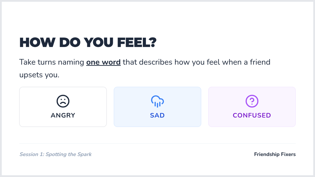 Students identify emotional triggers and common friendship conflicts to build self-awareness and prevent misunderstandings.
