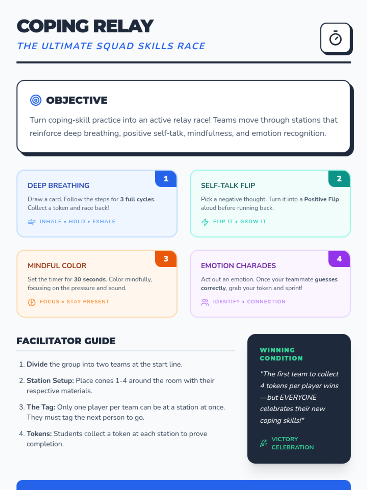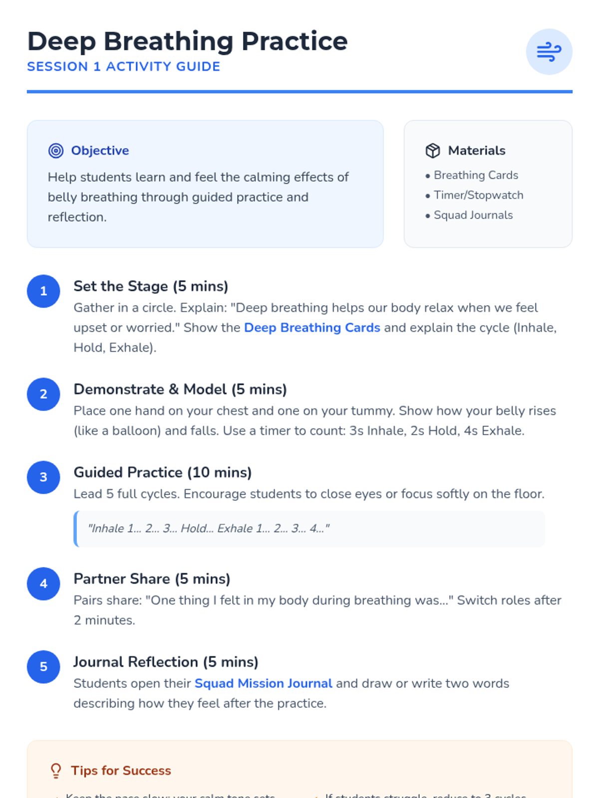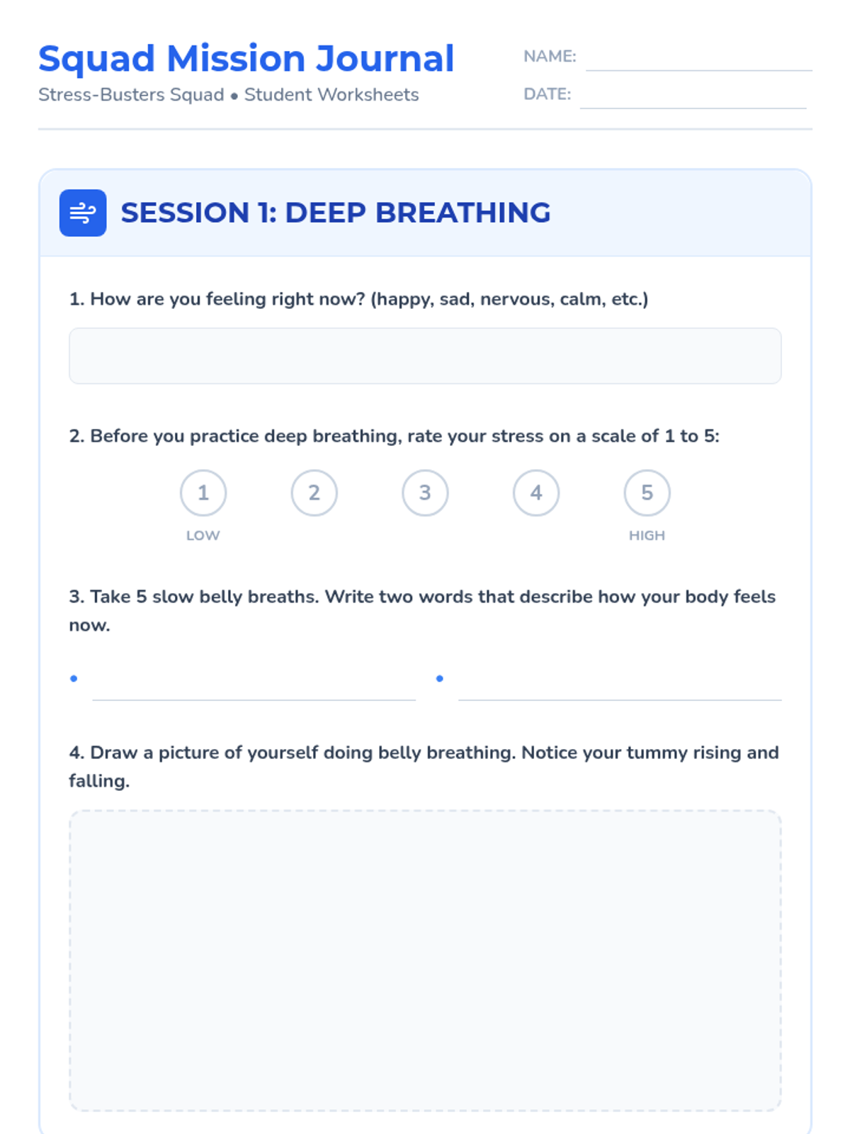 In this first session of the Stress-Busters Squad, students are introduced to the concept of stress and learn the fundamental skill of deep belly breathing. They practice identifying physical sensations of stress and use guided breathing to find their 'calm center.'