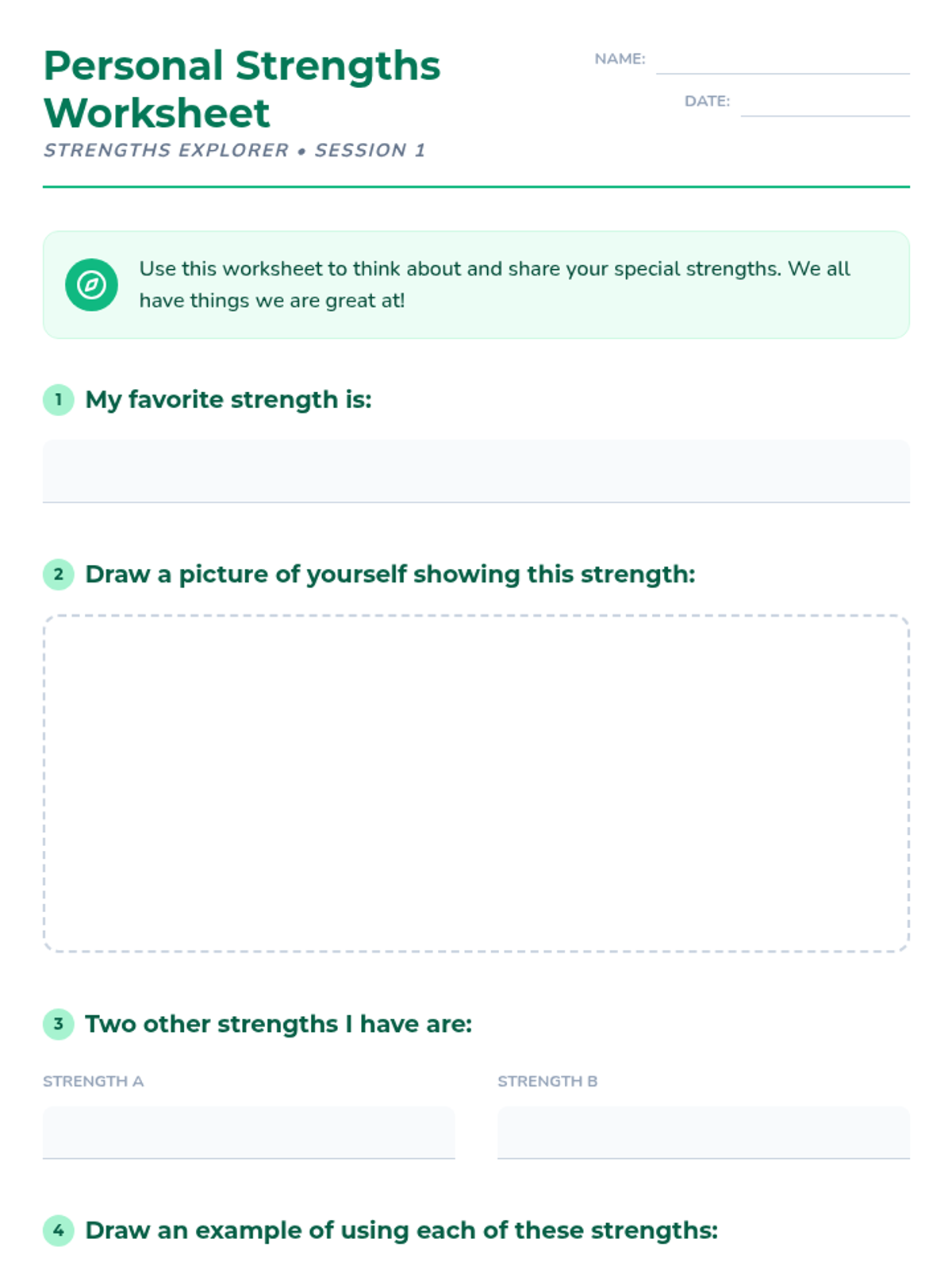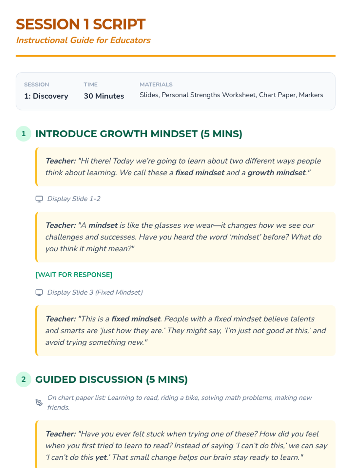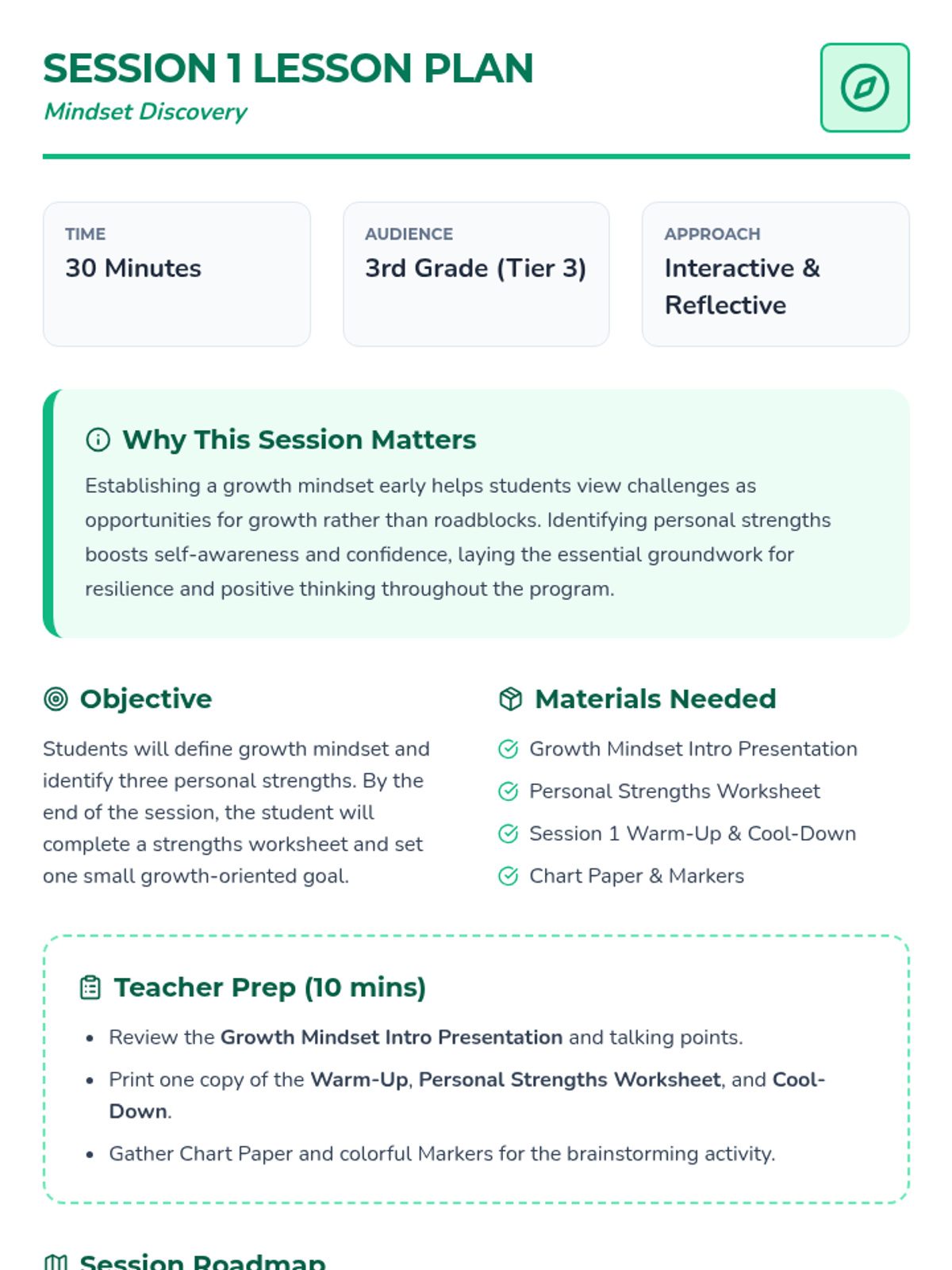 An introductory session defining growth mindset versus fixed mindset and helping the student identify personal strengths.