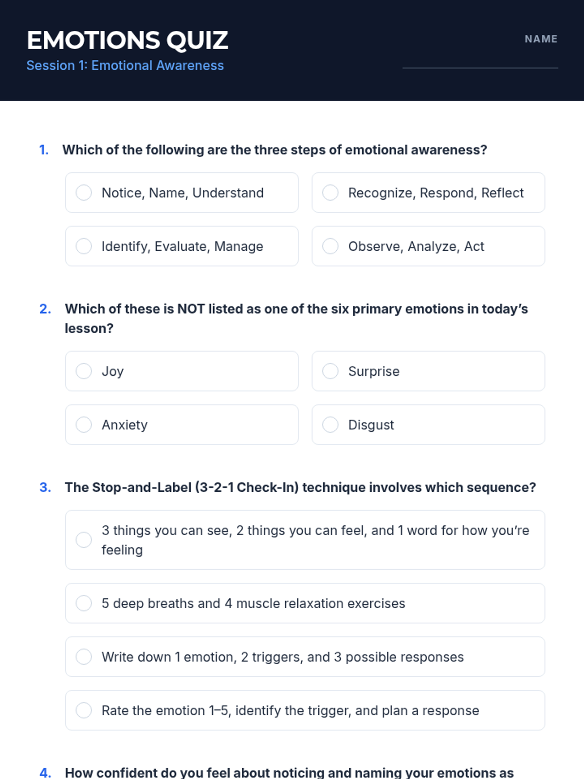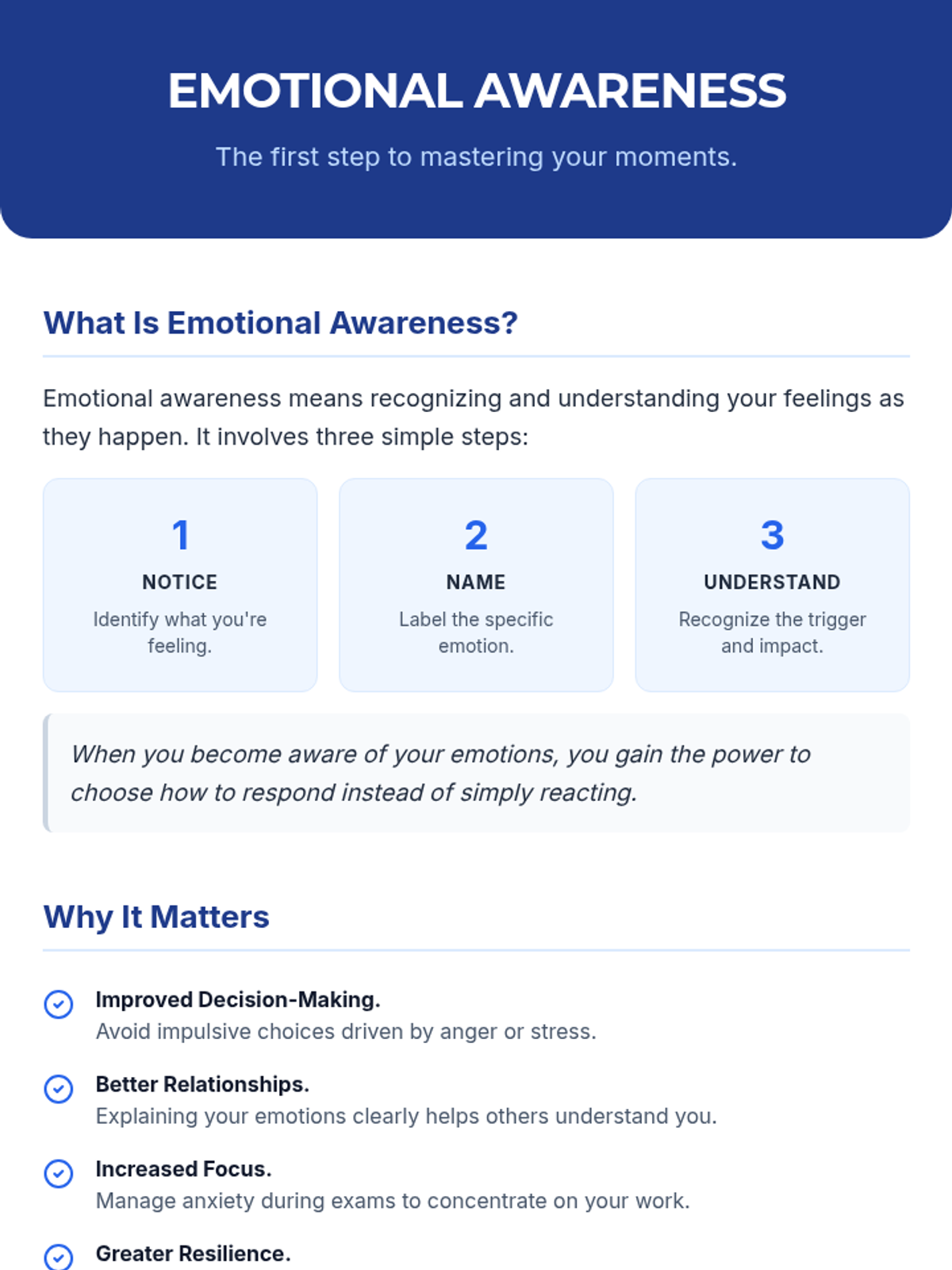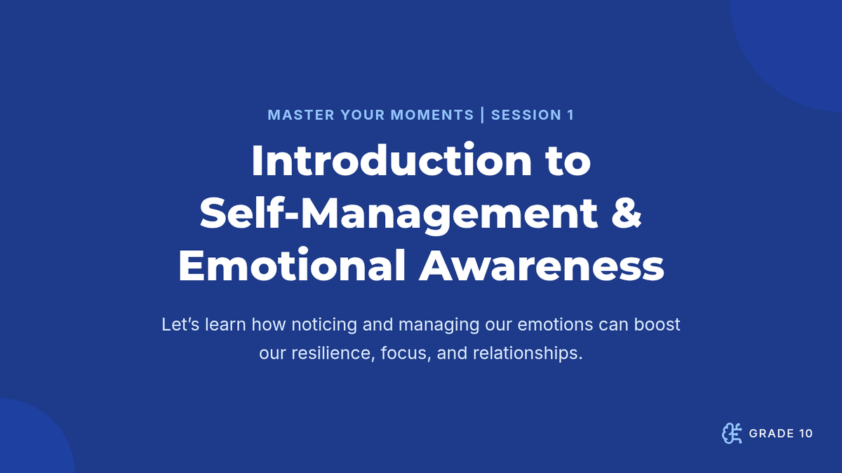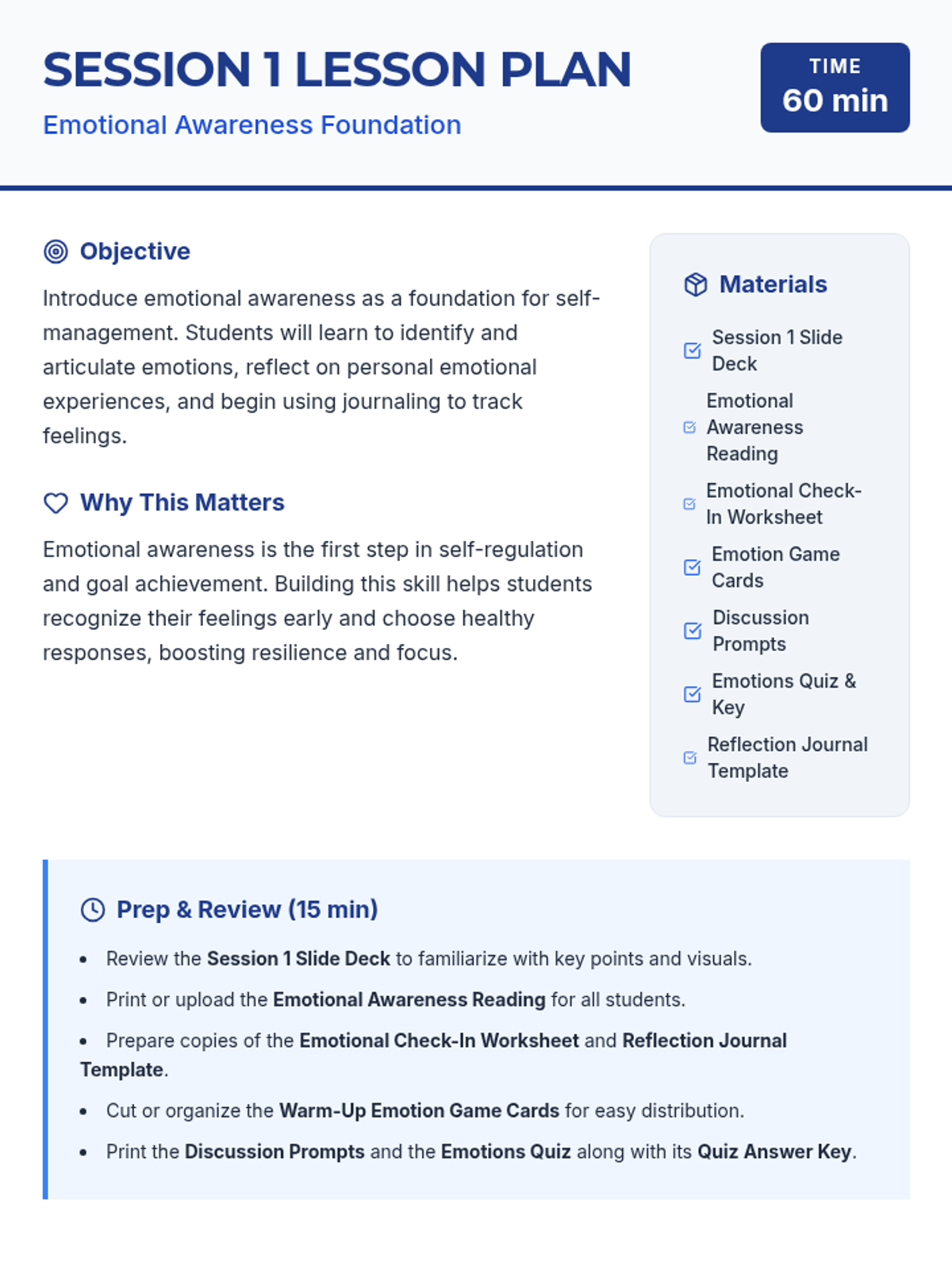 Introduces emotional awareness as the foundation for self-management, teaching students to identify, name, and understand their emotions.