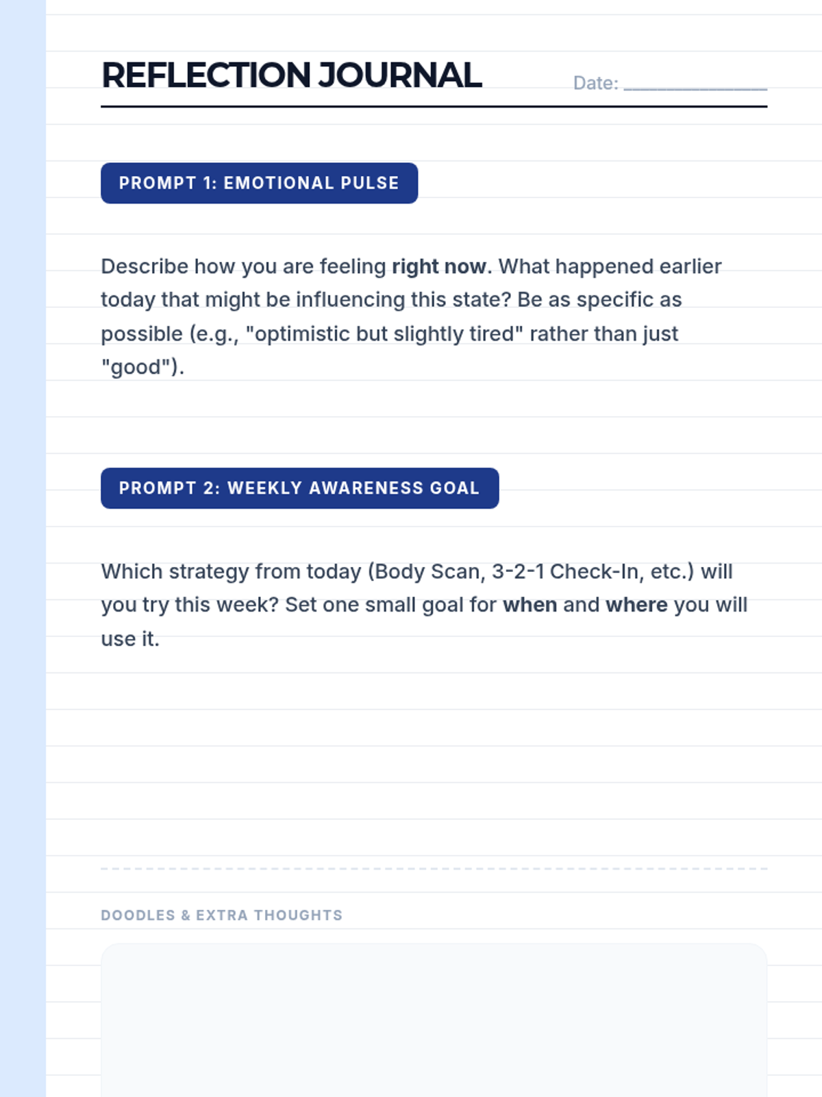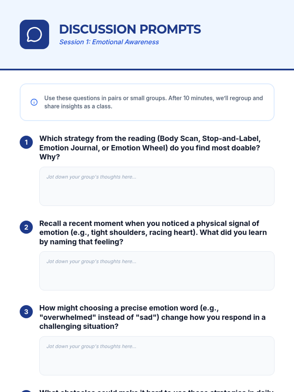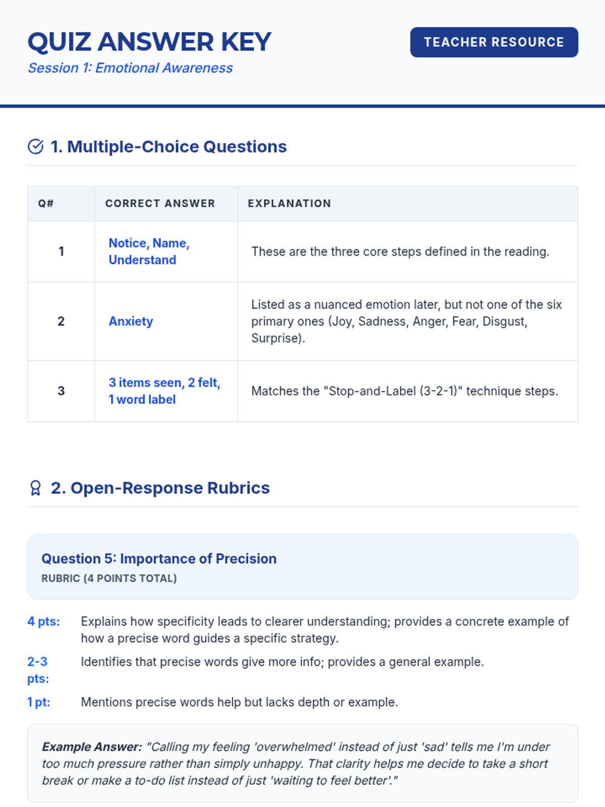 Introduces emotional awareness as the foundation for self-management, teaching students to identify, name, and understand their emotions.