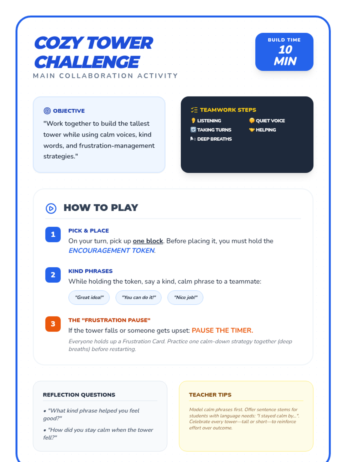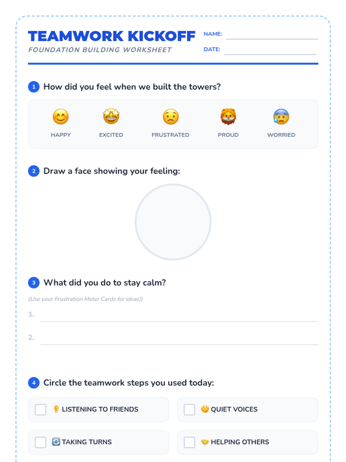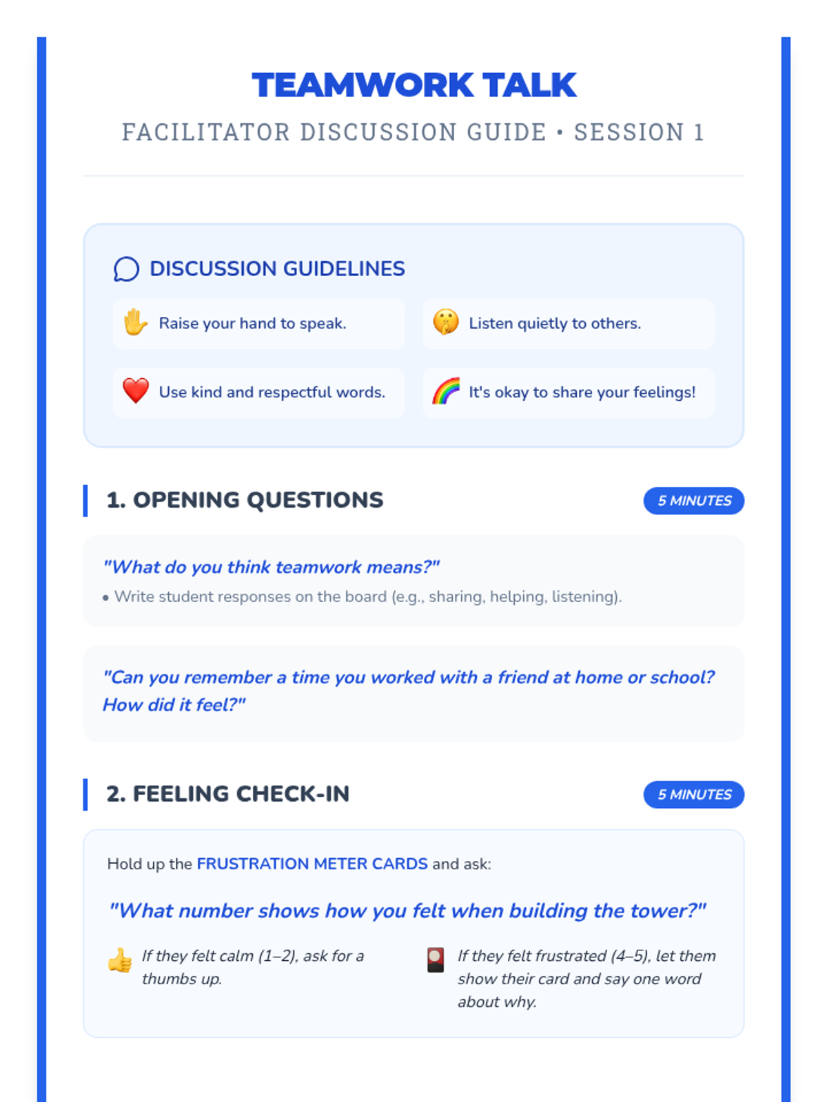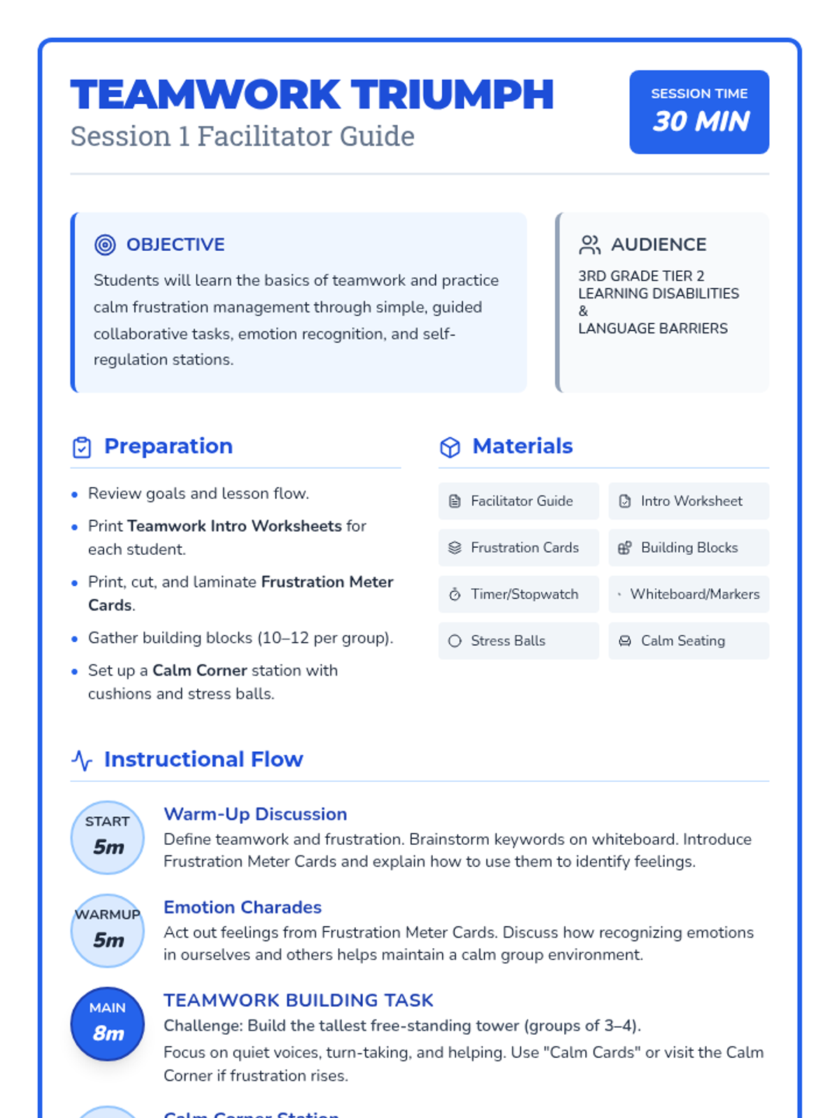 The first session of the Teamwork Triumph sequence, focusing on identifying emotions, understanding teamwork basics, and practicing calm responses to challenges.