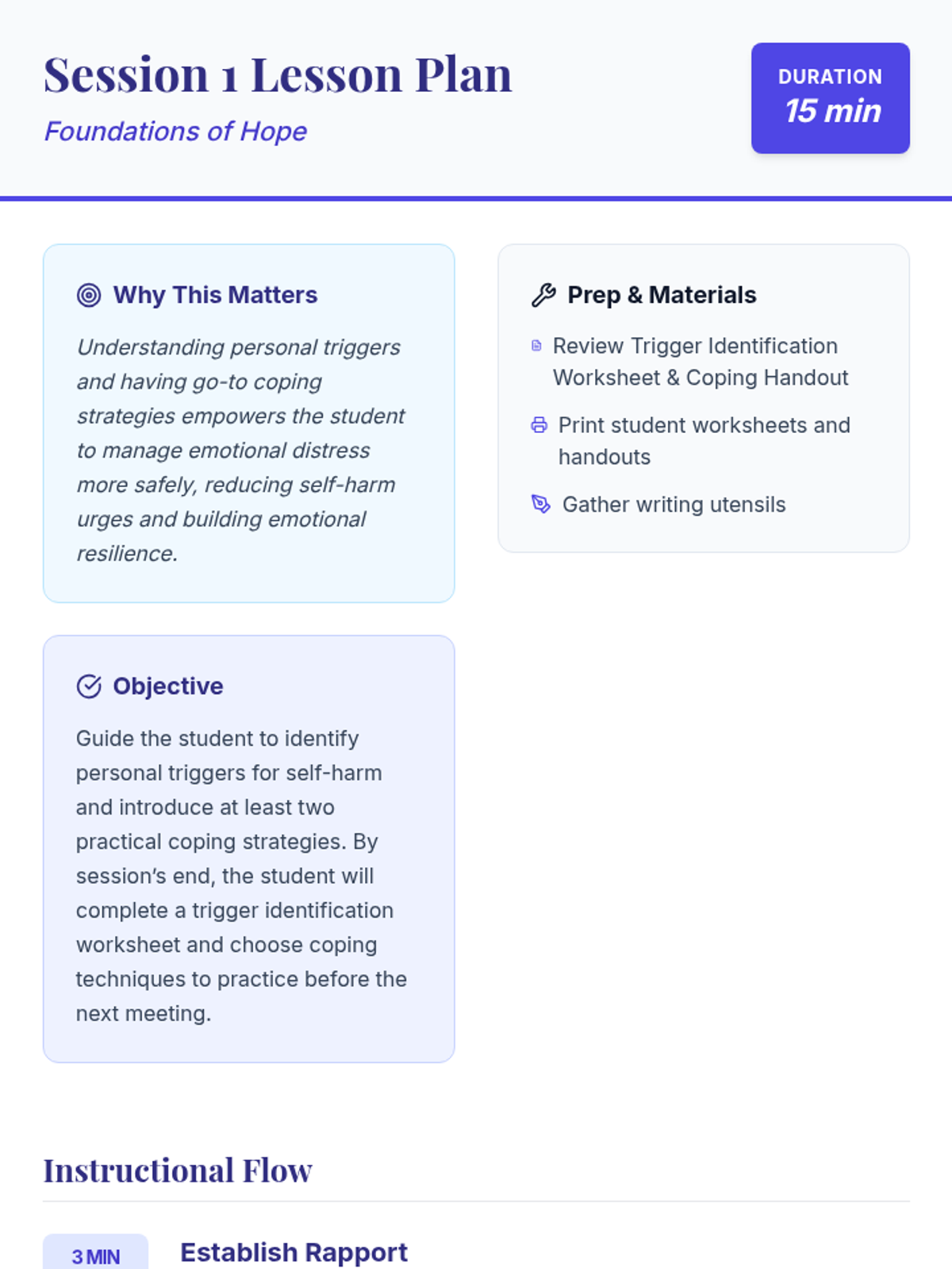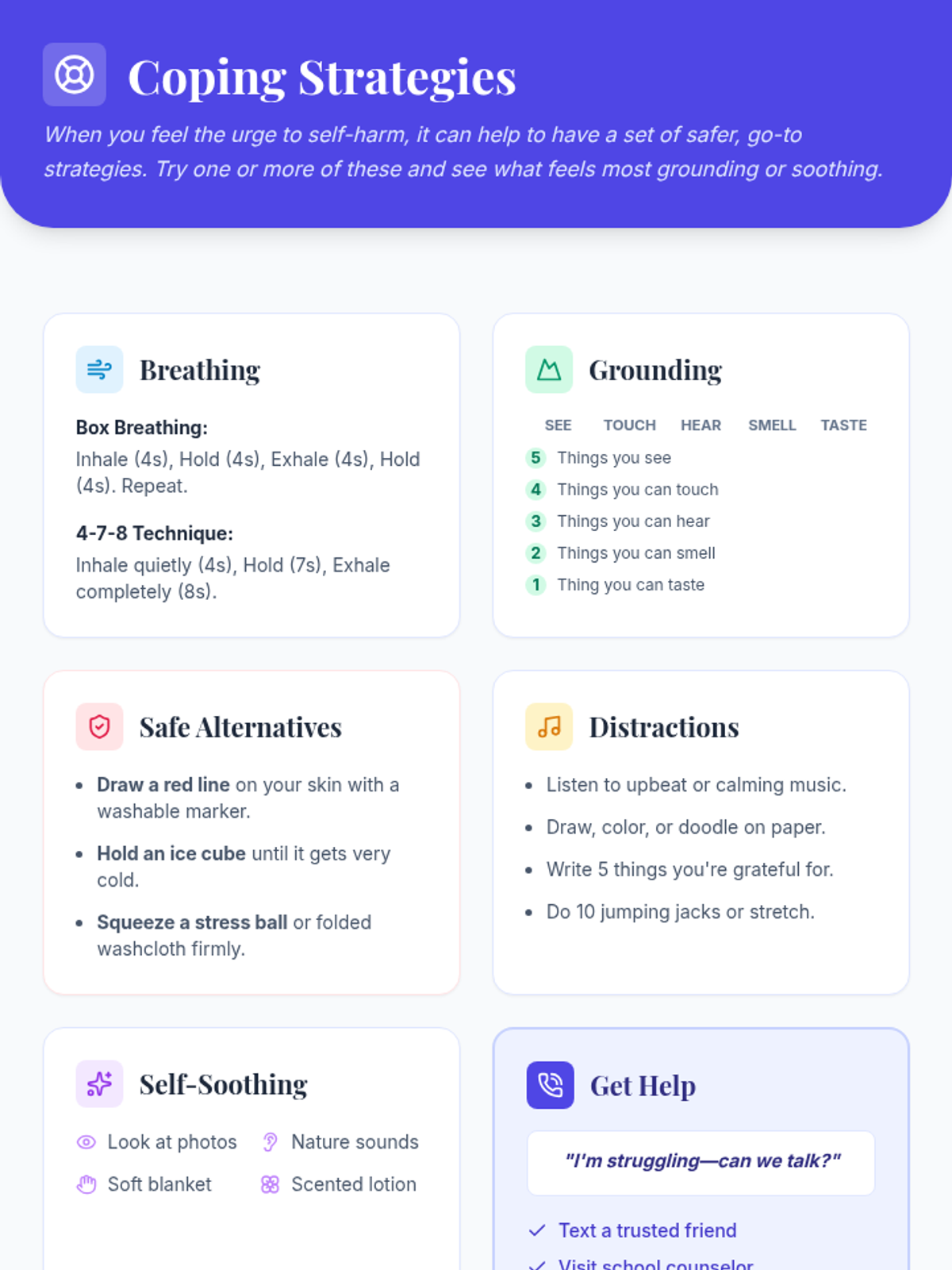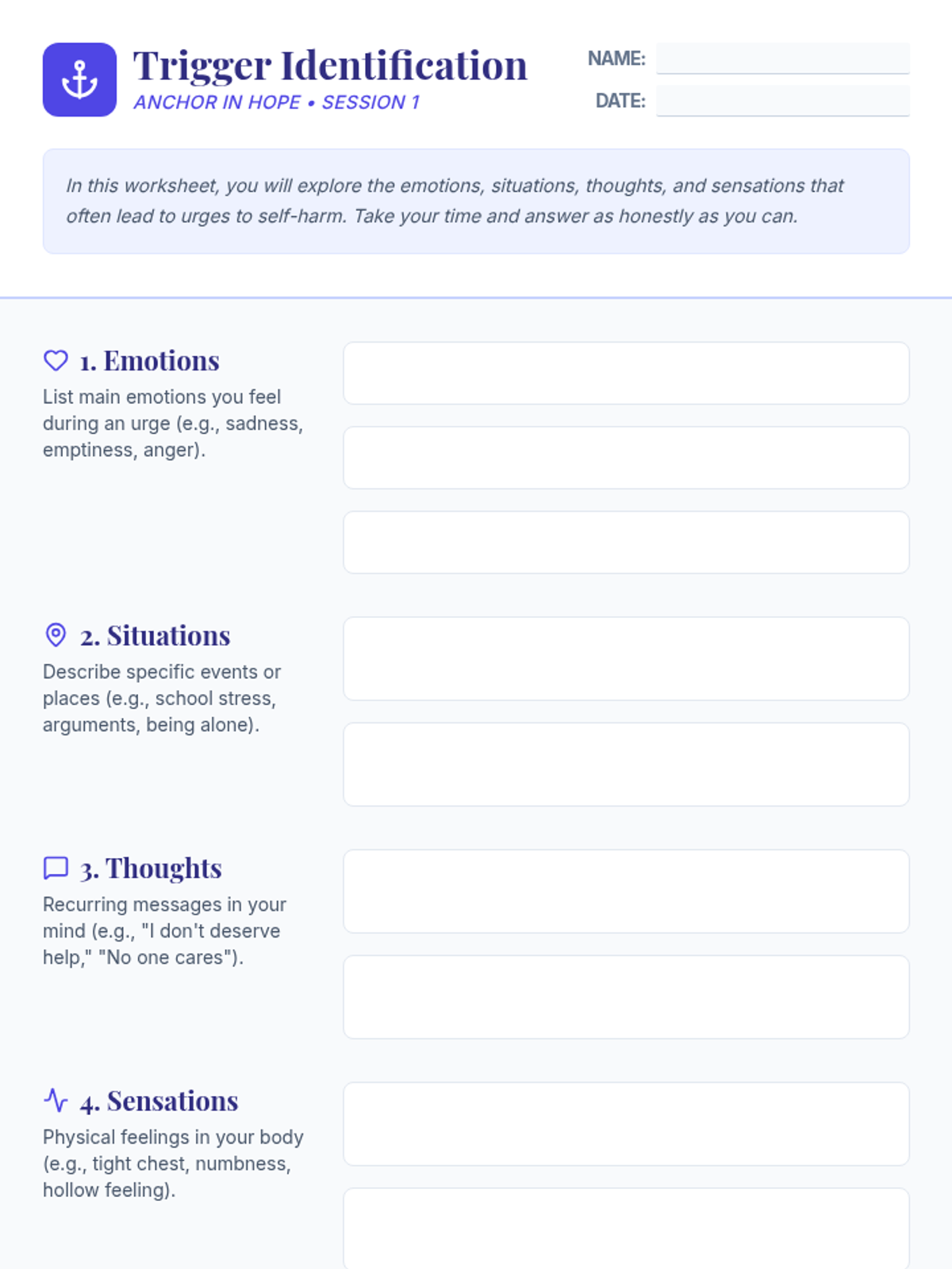 Focuses on identifying personal triggers for self-harm and introducing practical coping strategies to manage emotional distress safely.