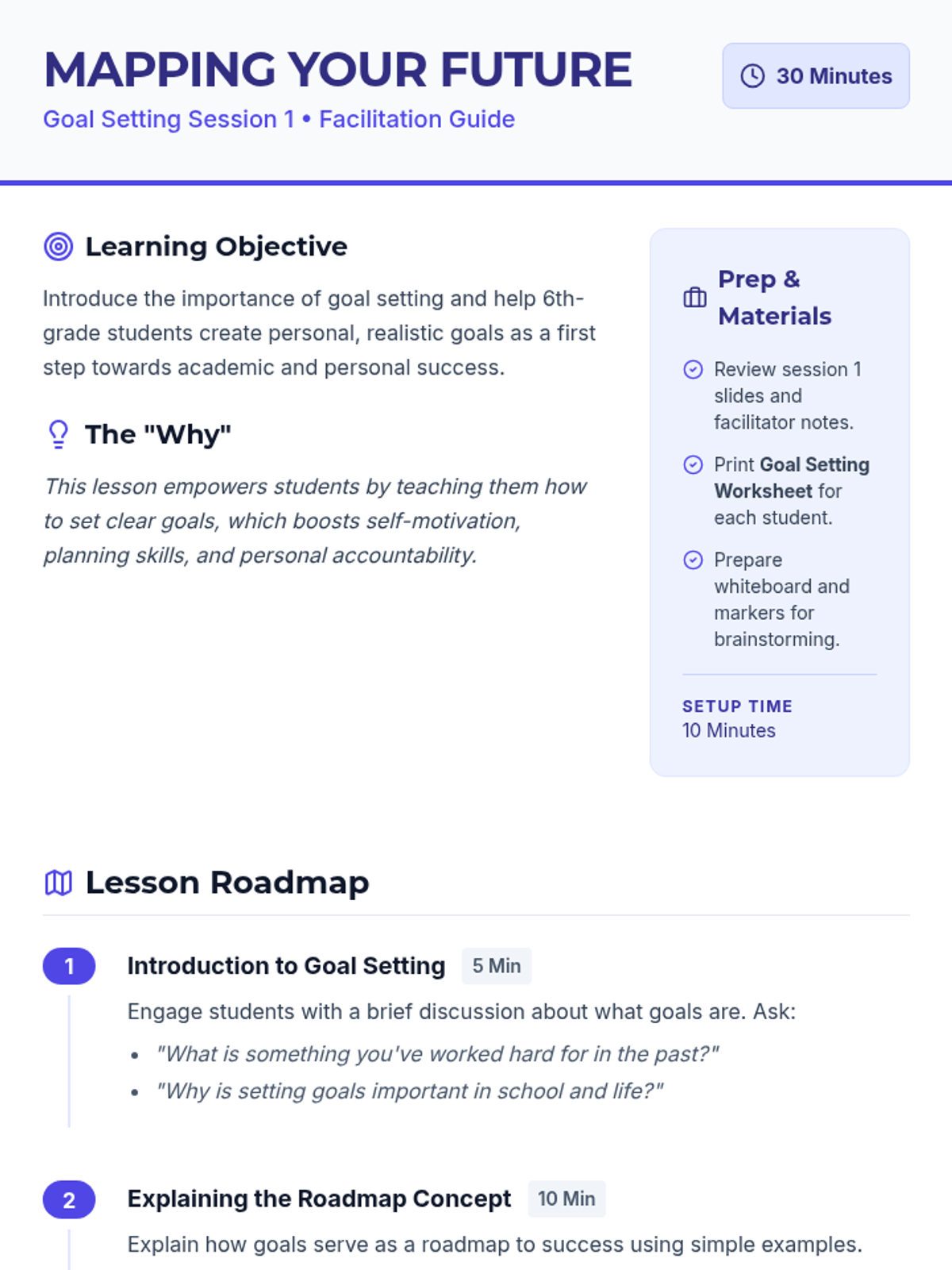Introduces students to the concept of goals as a roadmap and guides them through creating their first personal or academic goal.