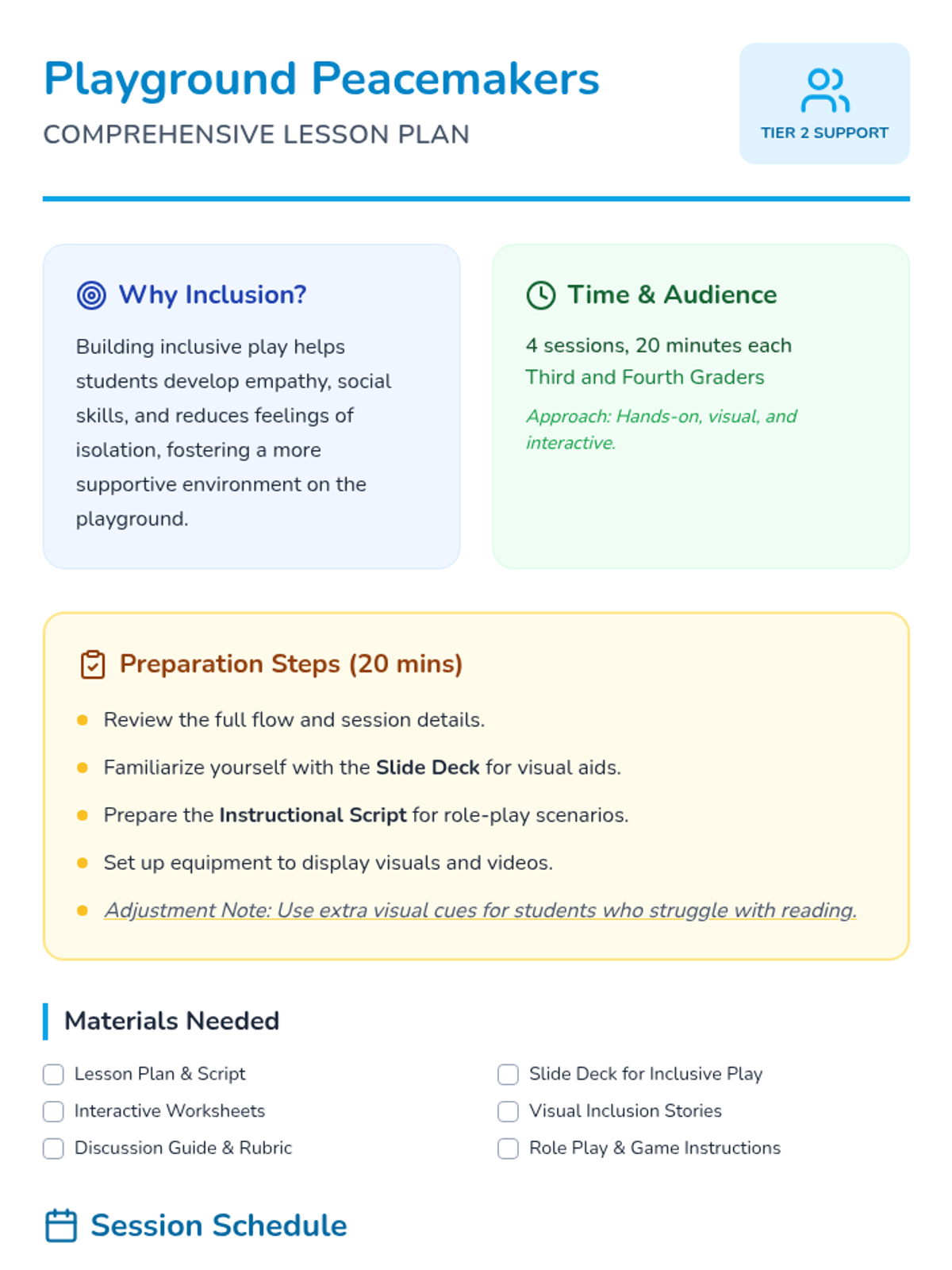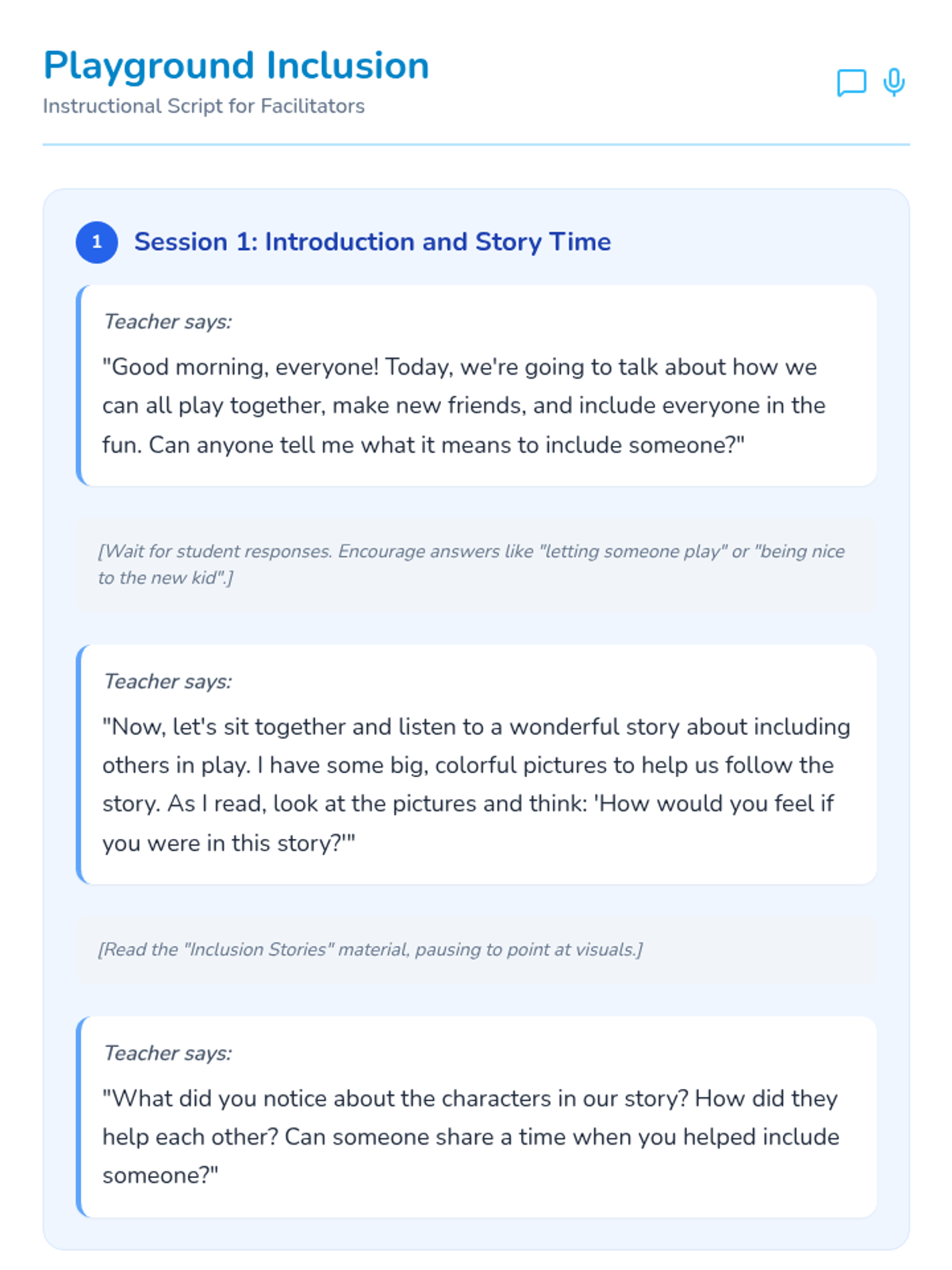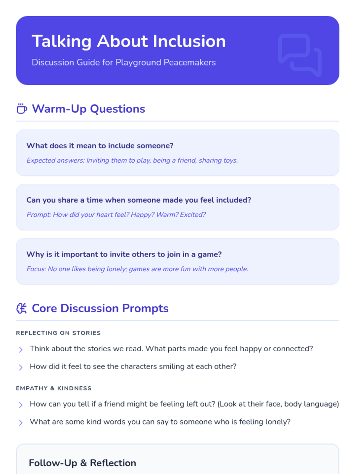 Students are introduced to the concept of inclusion through a story-time session and group discussion. This session builds the foundational understanding of what it means to include others.