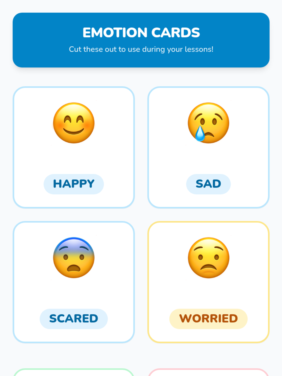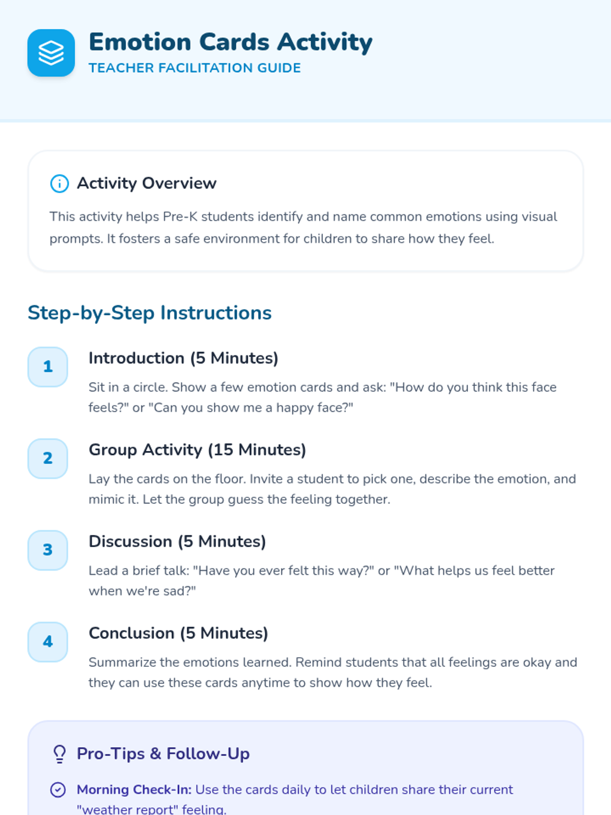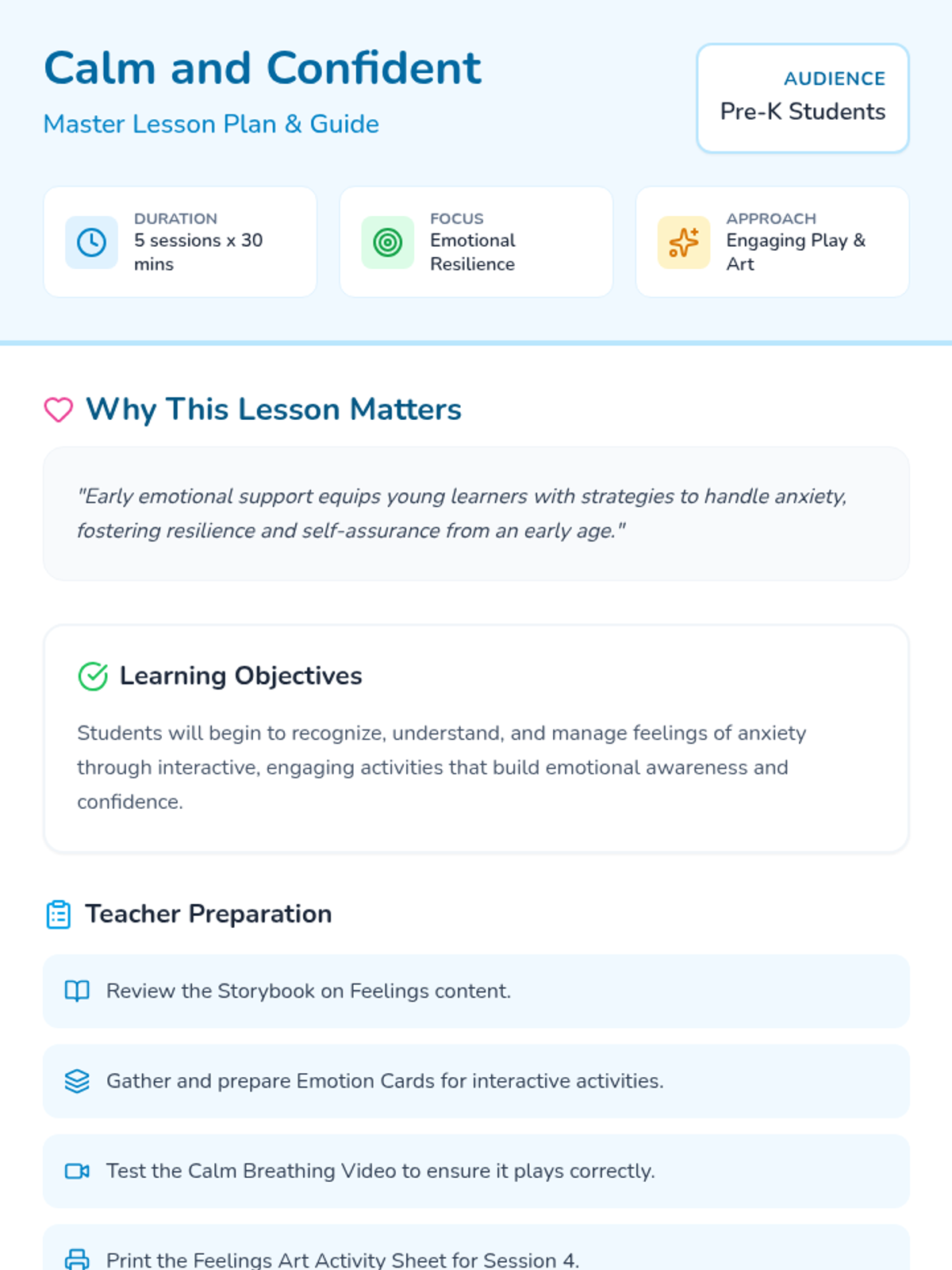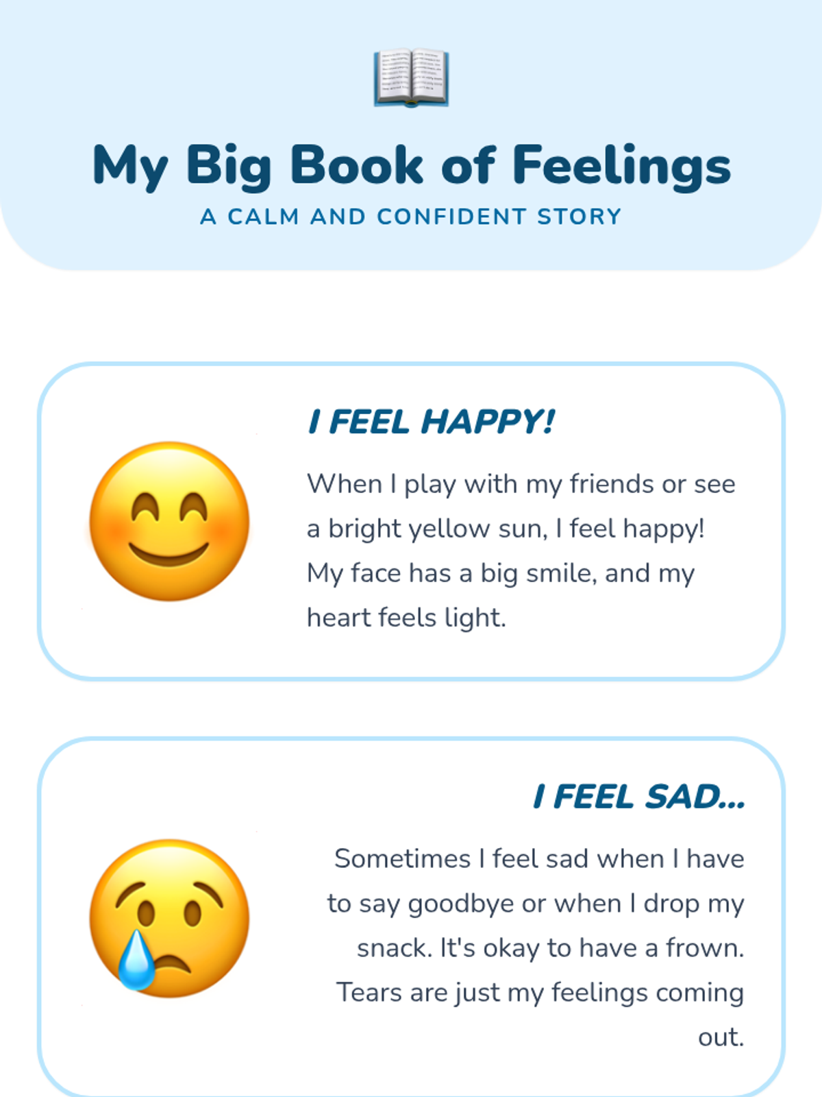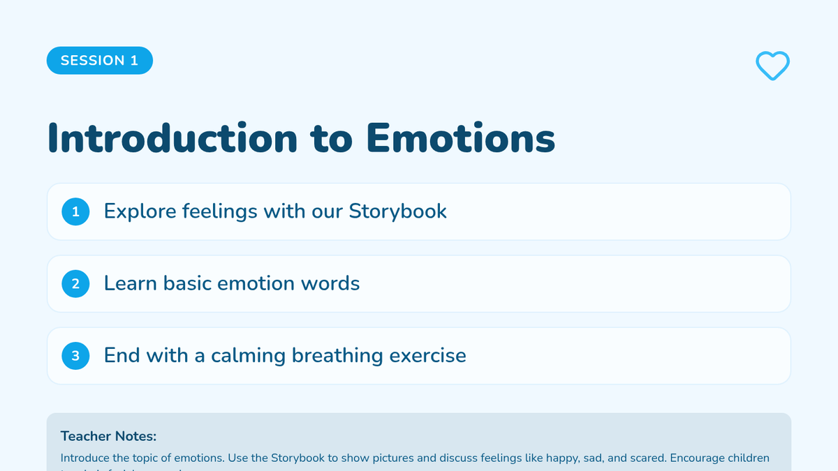 An introduction to basic emotions (happy, sad, scared) using a storybook and interactive cards to build foundational emotional vocabulary.