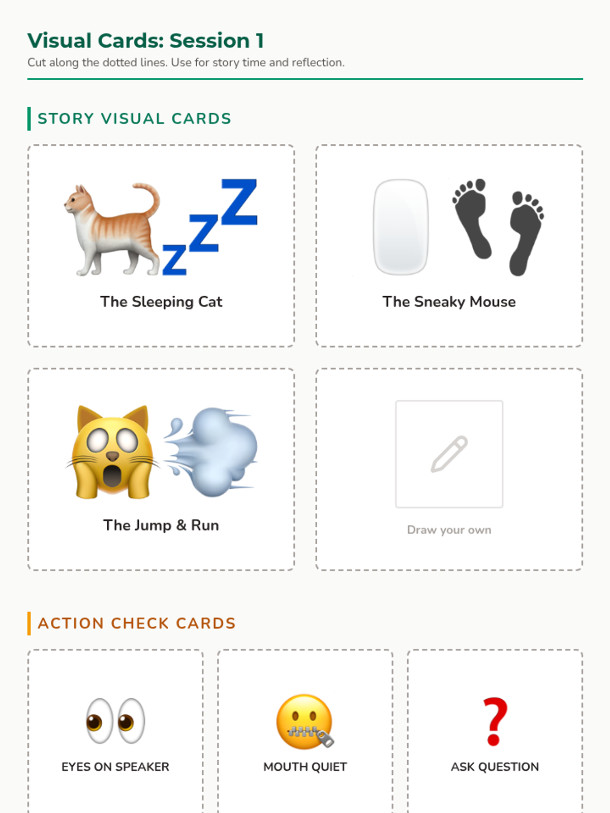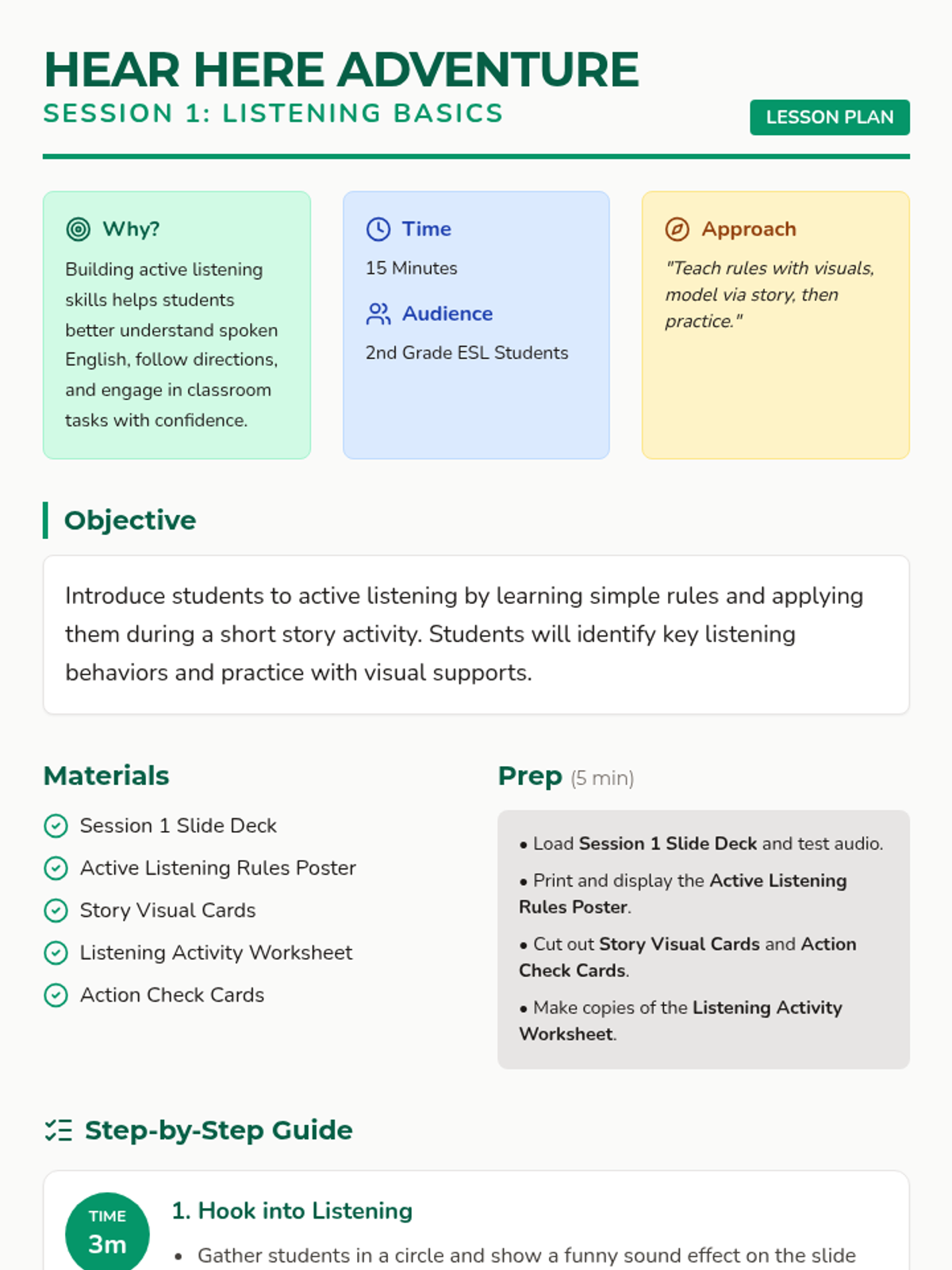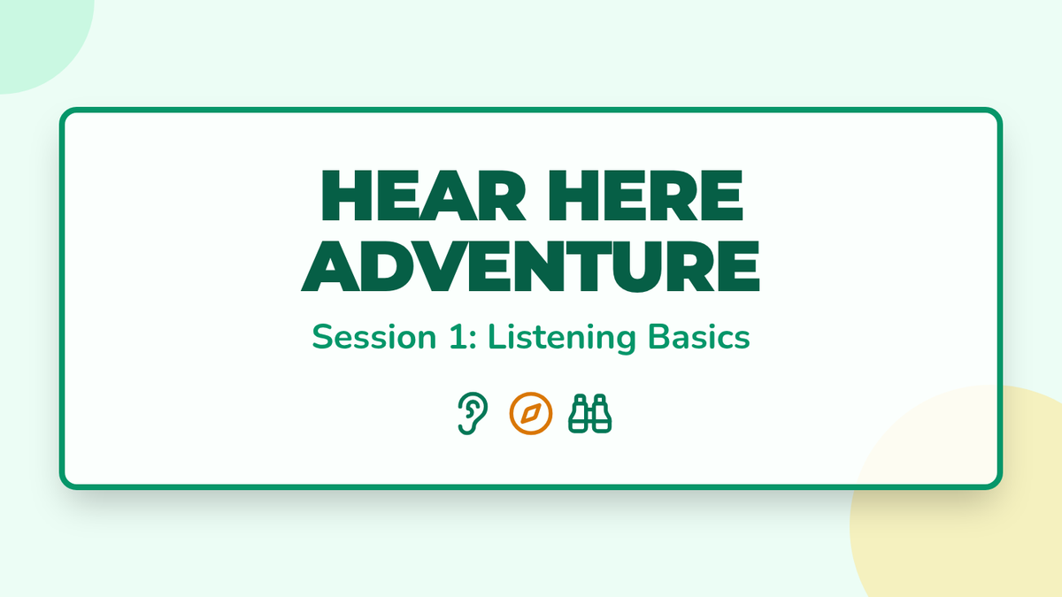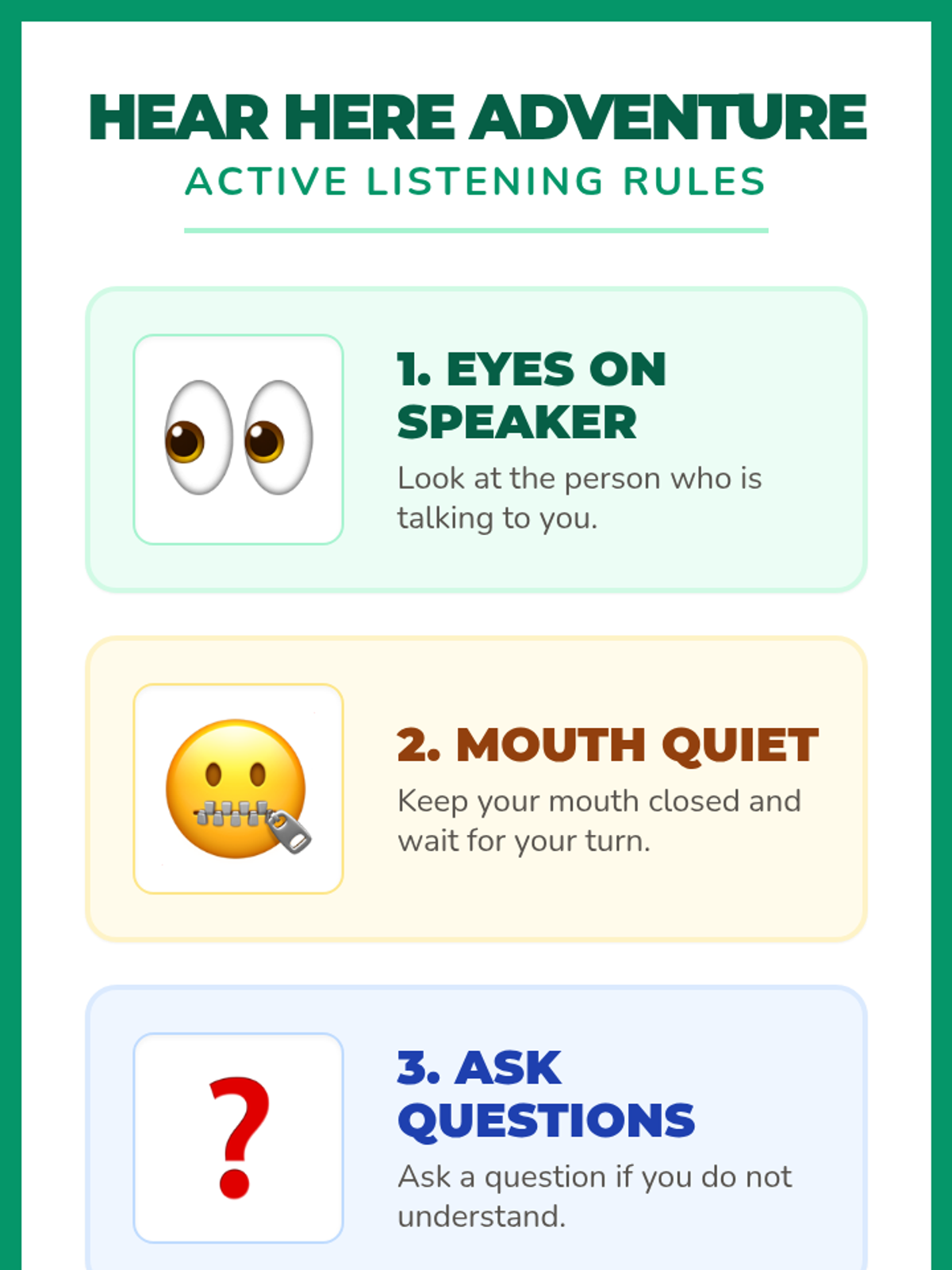 Introduce active listening rules (eyes on speaker, mouth quiet, ask questions) and practice through a simple picture story.