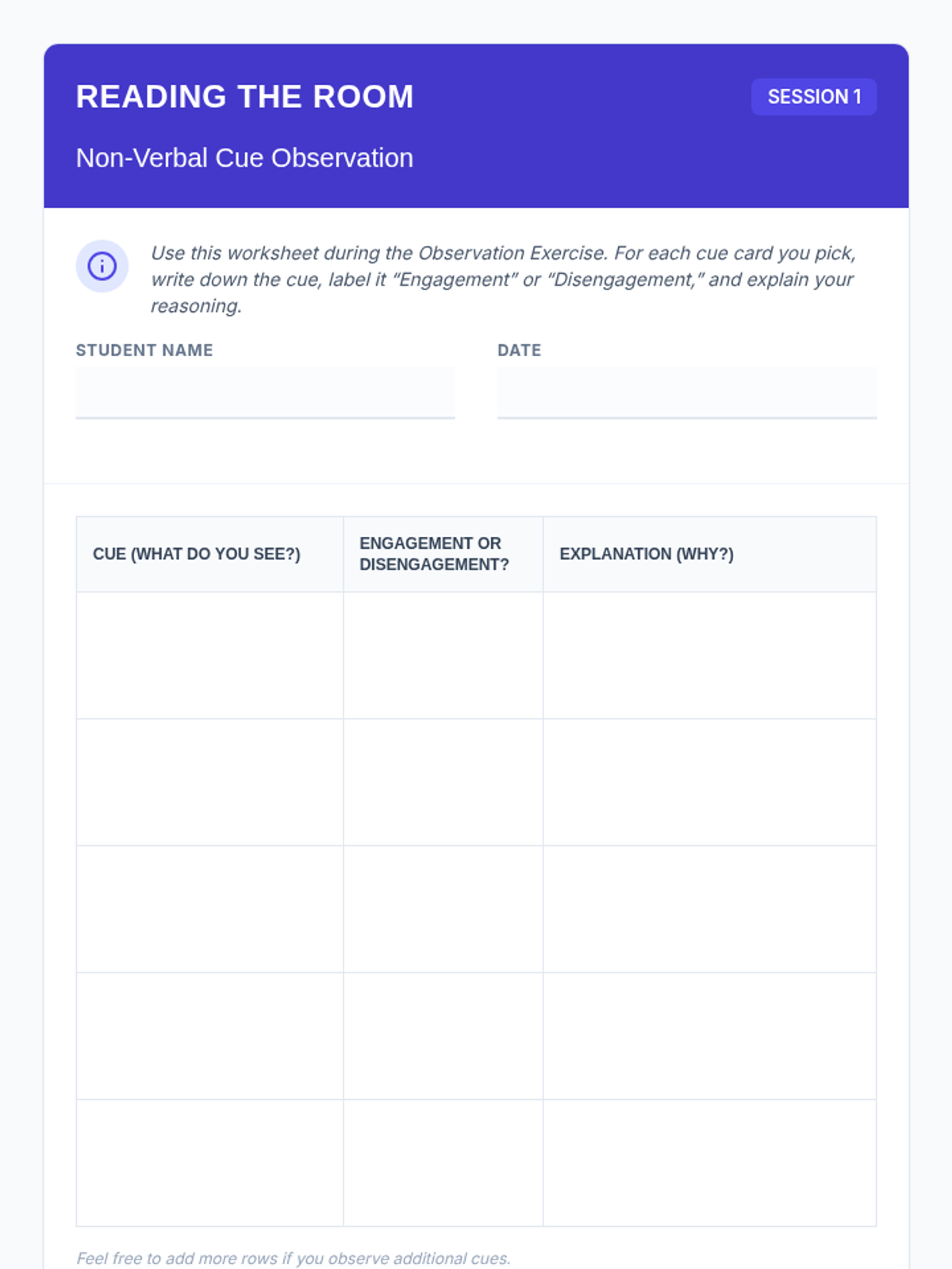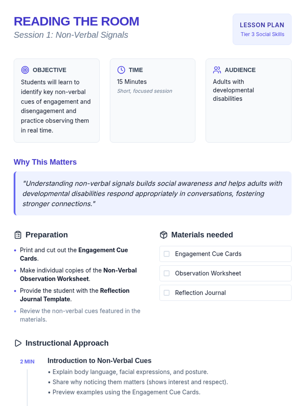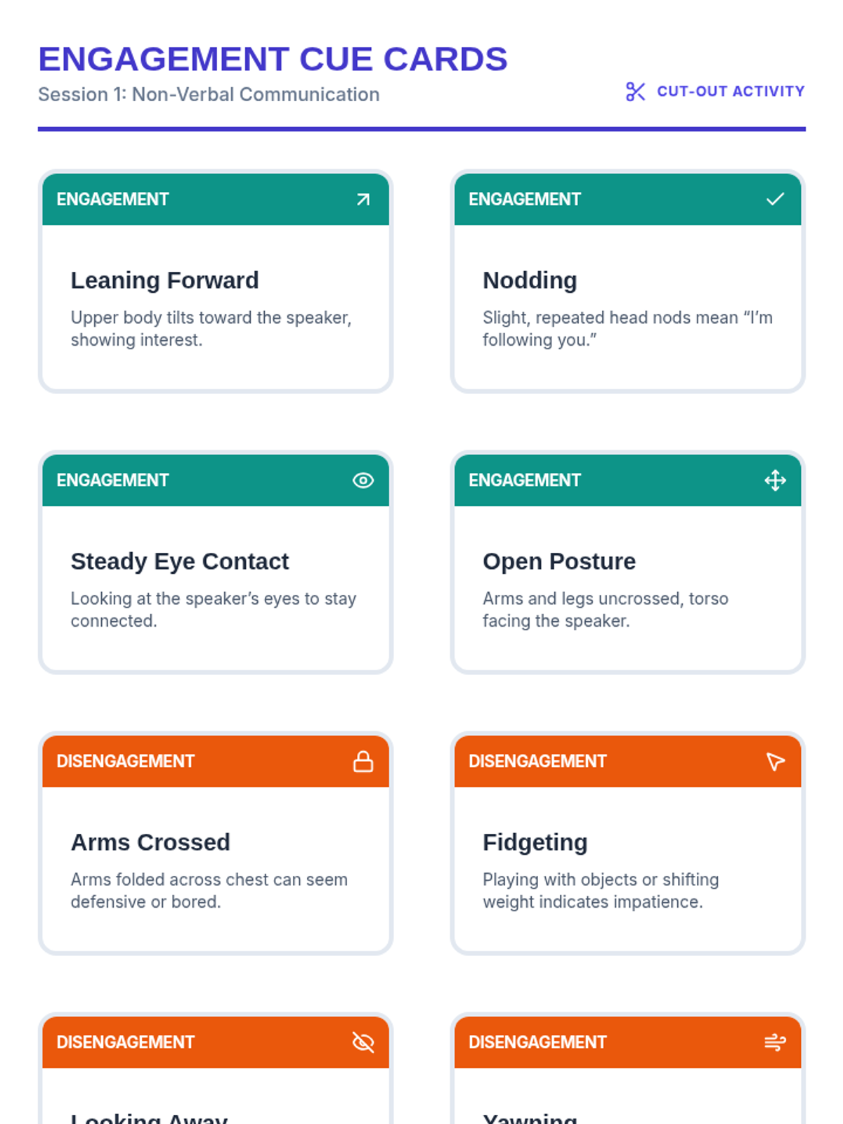Introduces non-verbal cues such as body language, facial expressions, and posture, helping students identify engagement and disengagement.
