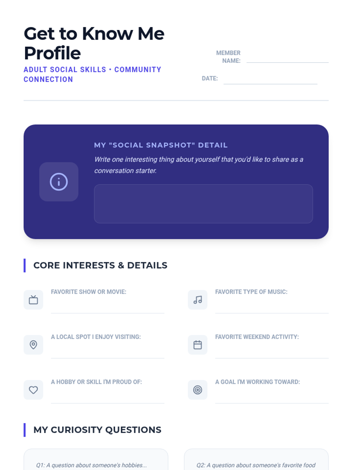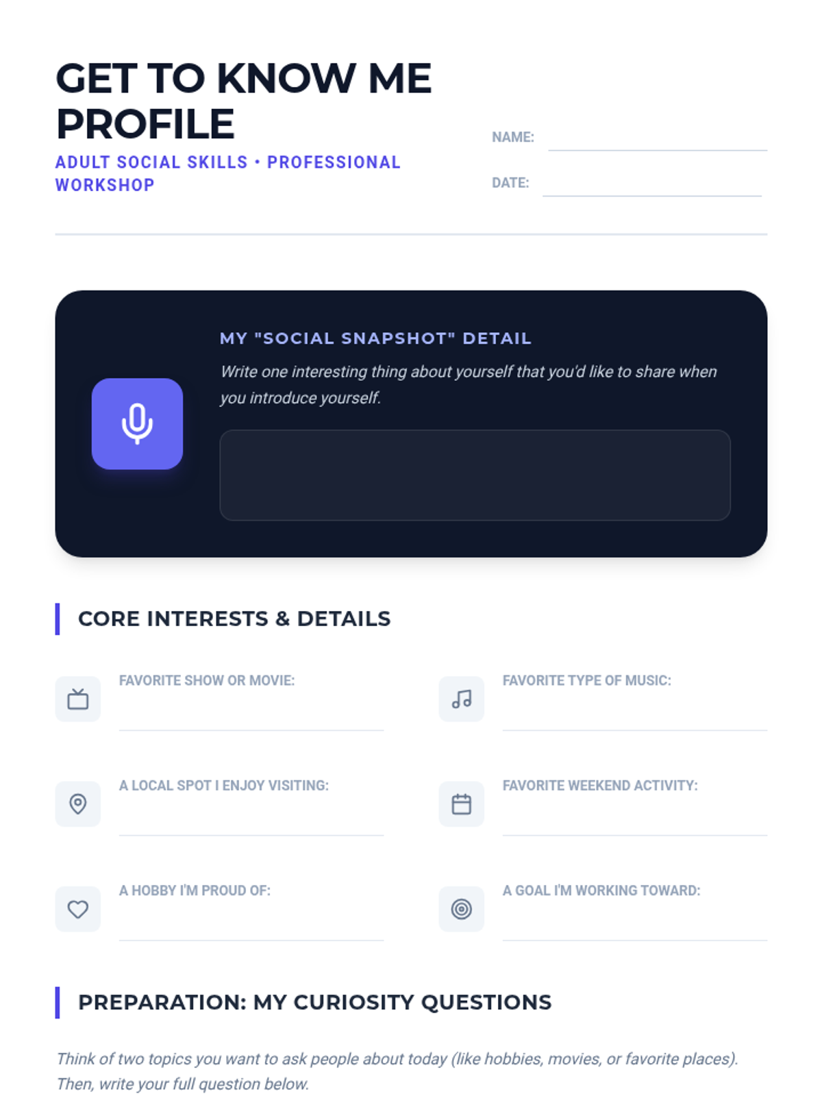 A foundational social skills lesson focused on introducing oneself, active listening, and discovering common interests through interactive activities and visual guides.