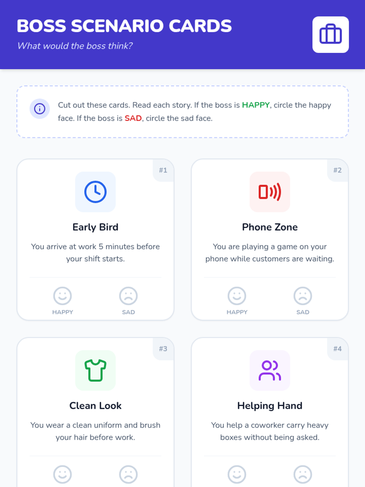Students explore qualities that make a "good employee," such as punctuality, hygiene, and teamwork, through a "Hire vs. Not Ready Yet" behavior sorting activity.