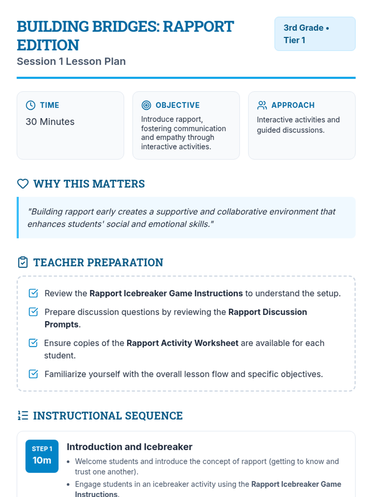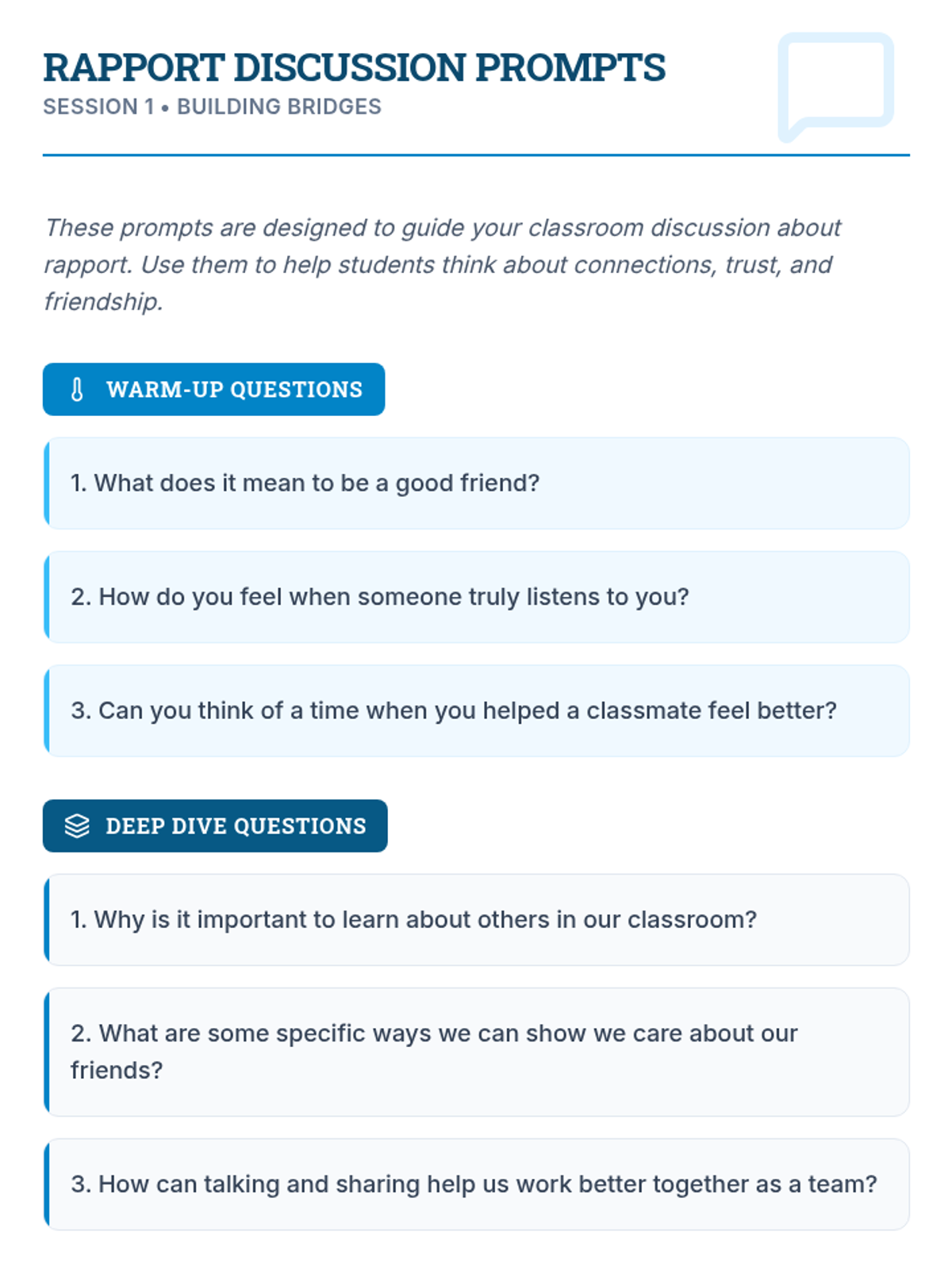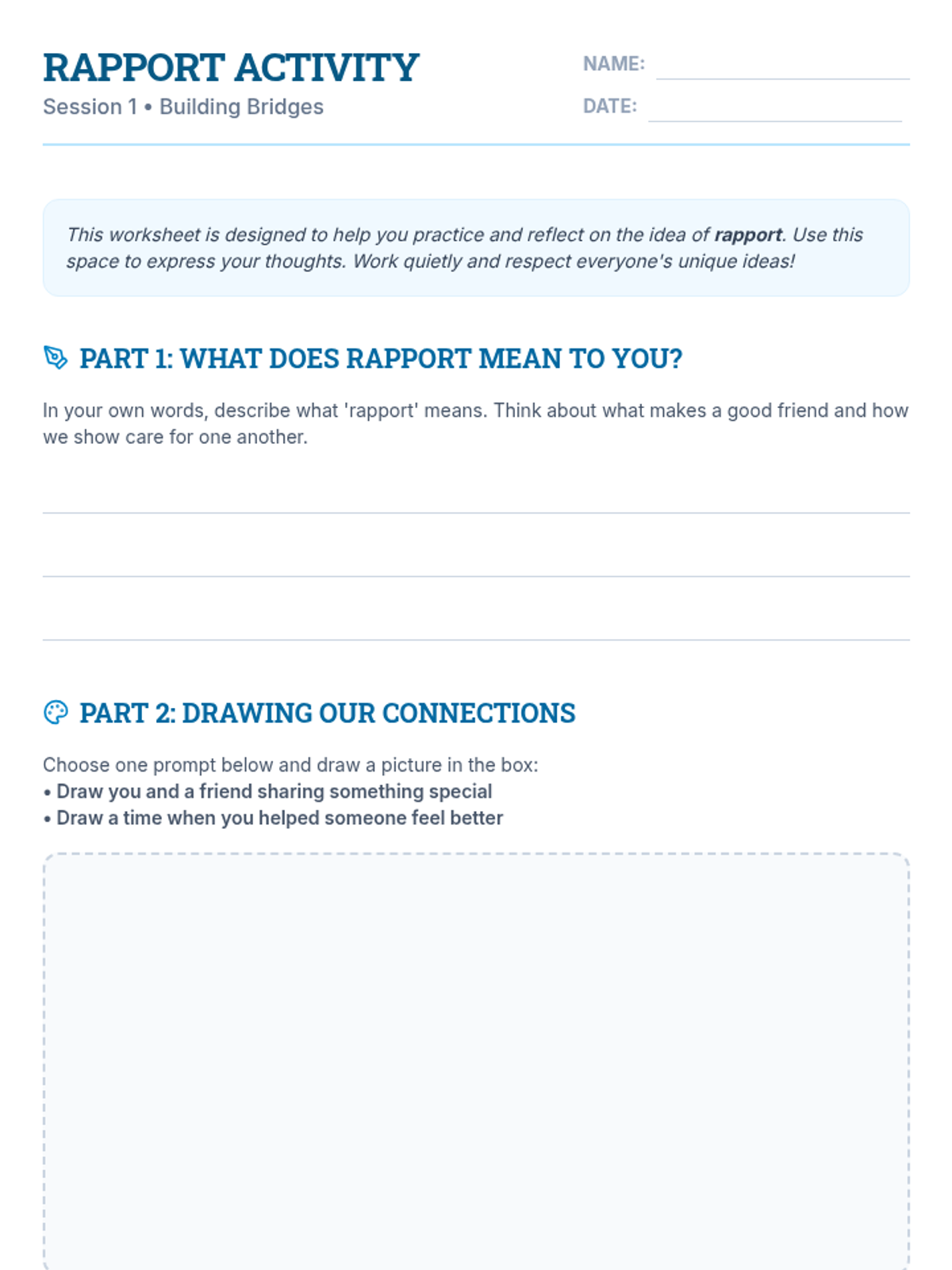 Introduce students to the concept of rapport and foster initial connections through an icebreaker and guided discussion.