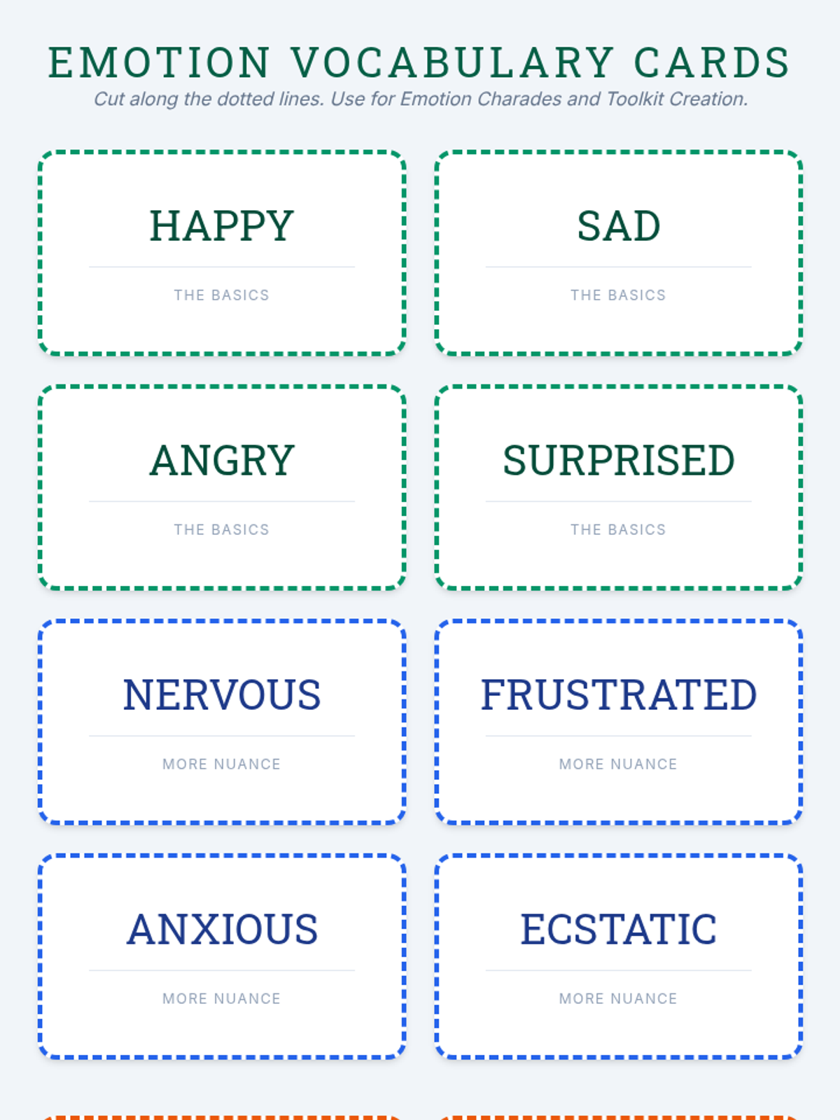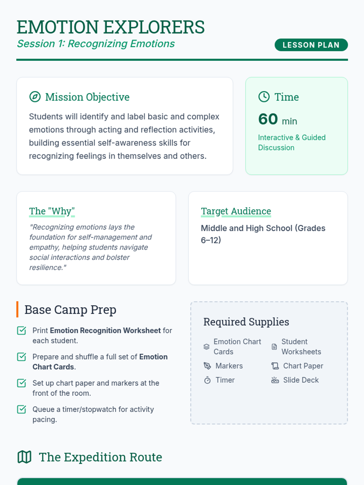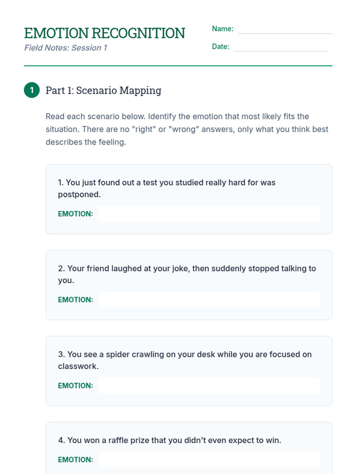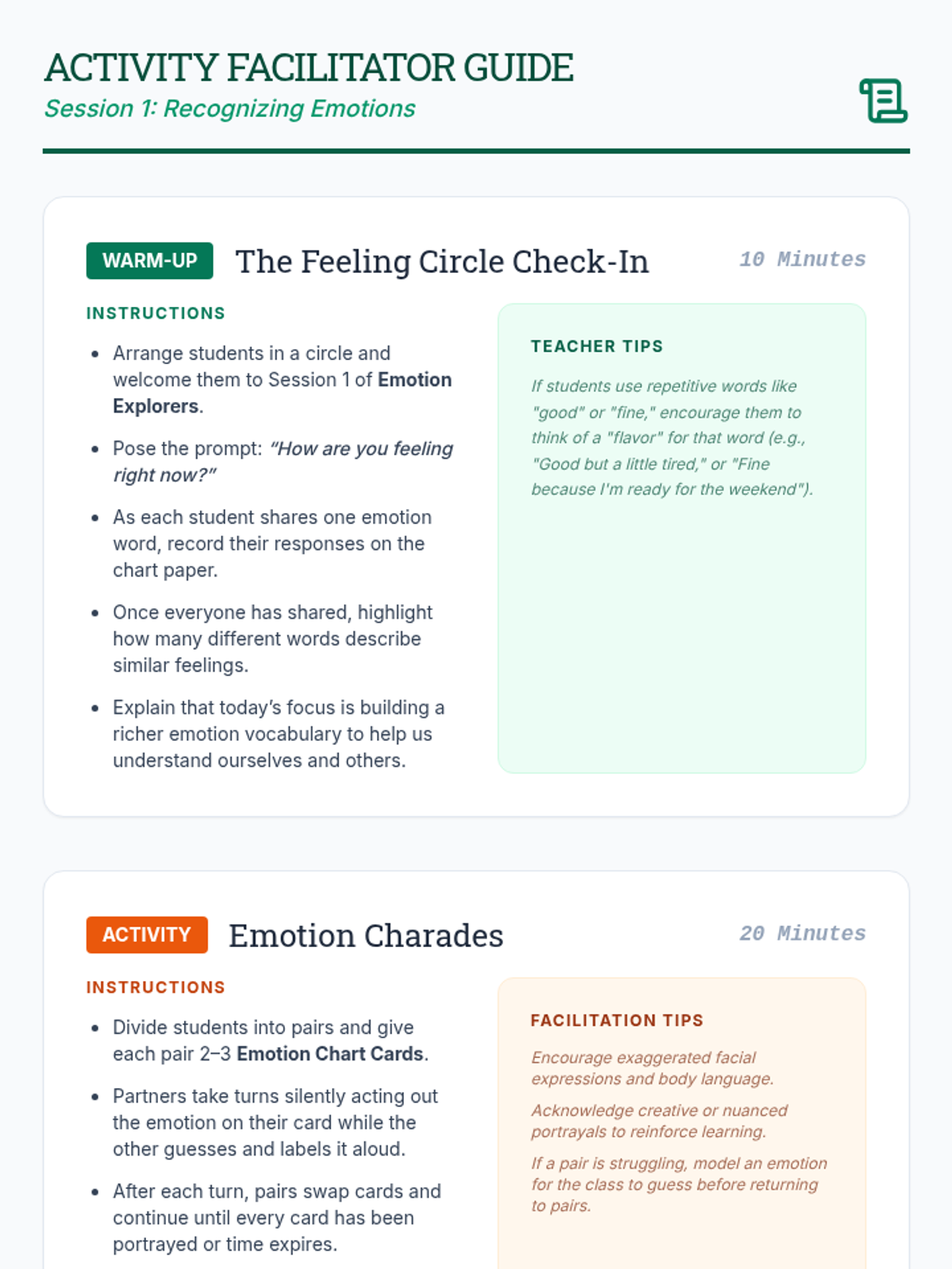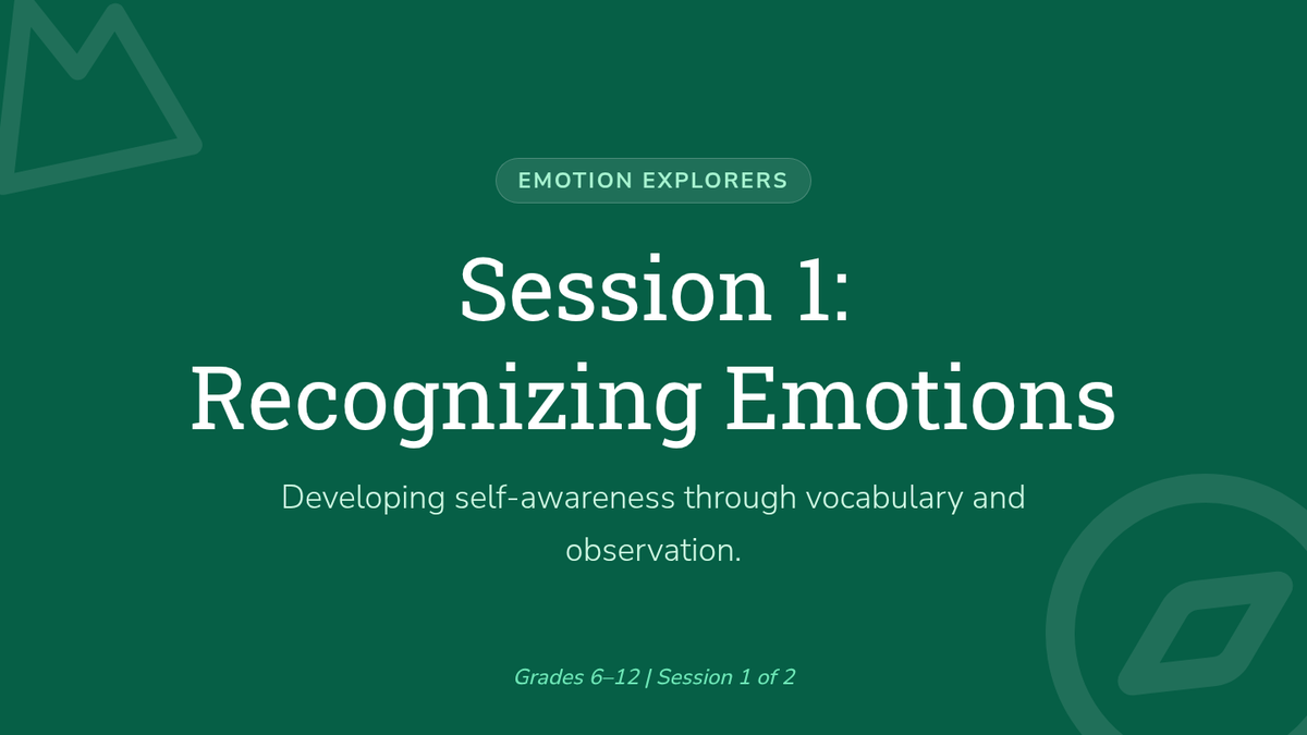 Focuses on identifying and labeling emotions to build self-awareness. Students expand their emotional vocabulary through charades and scenario-based reflection.