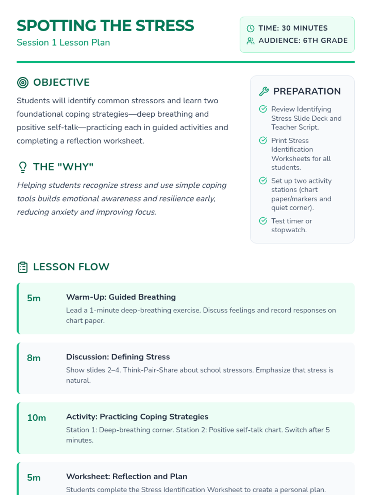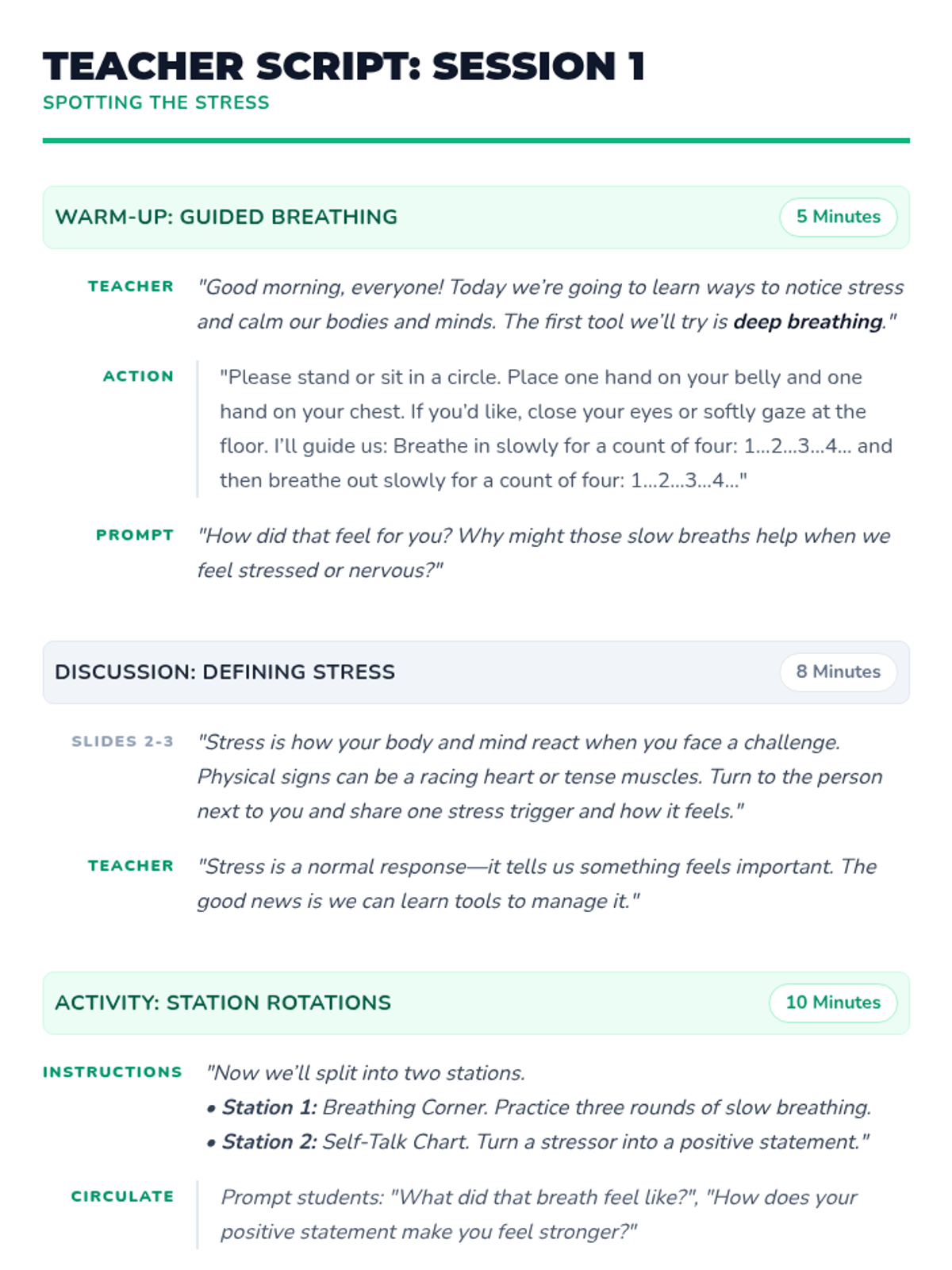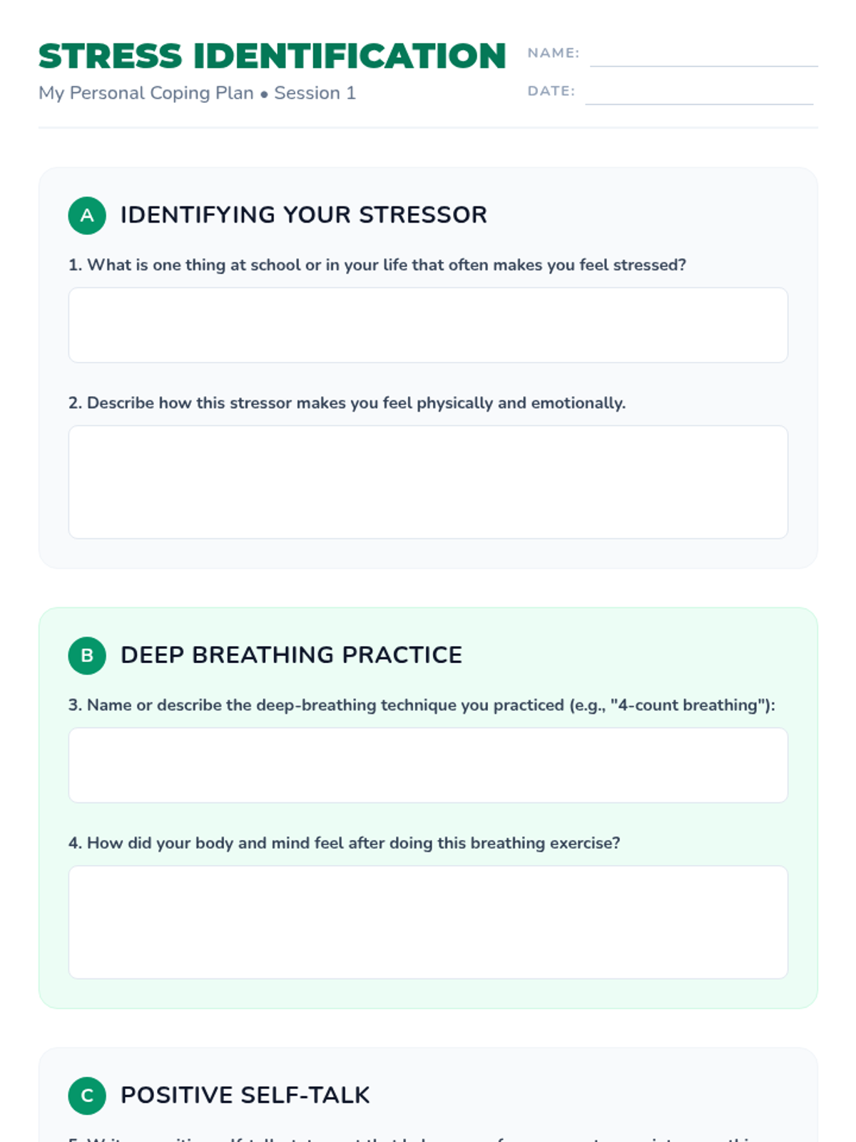 Students will learn to define stress, identify their personal triggers, and practice two foundational tools: deep breathing and positive self-talk.