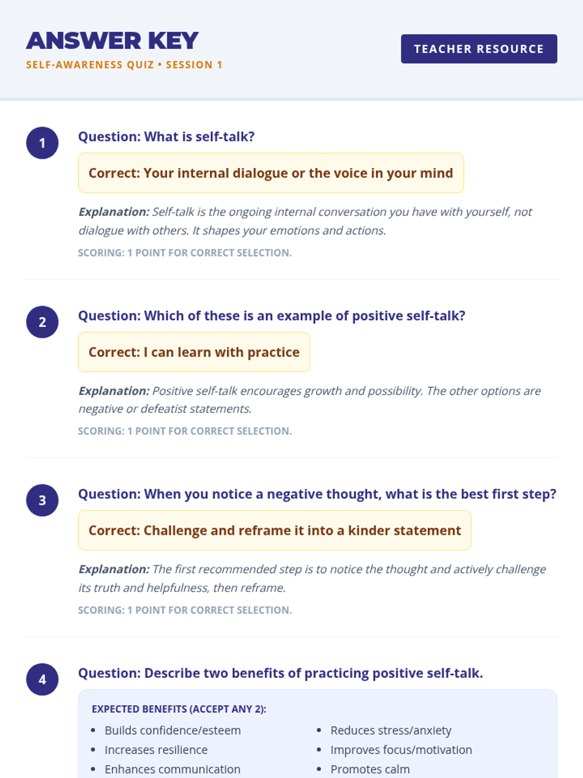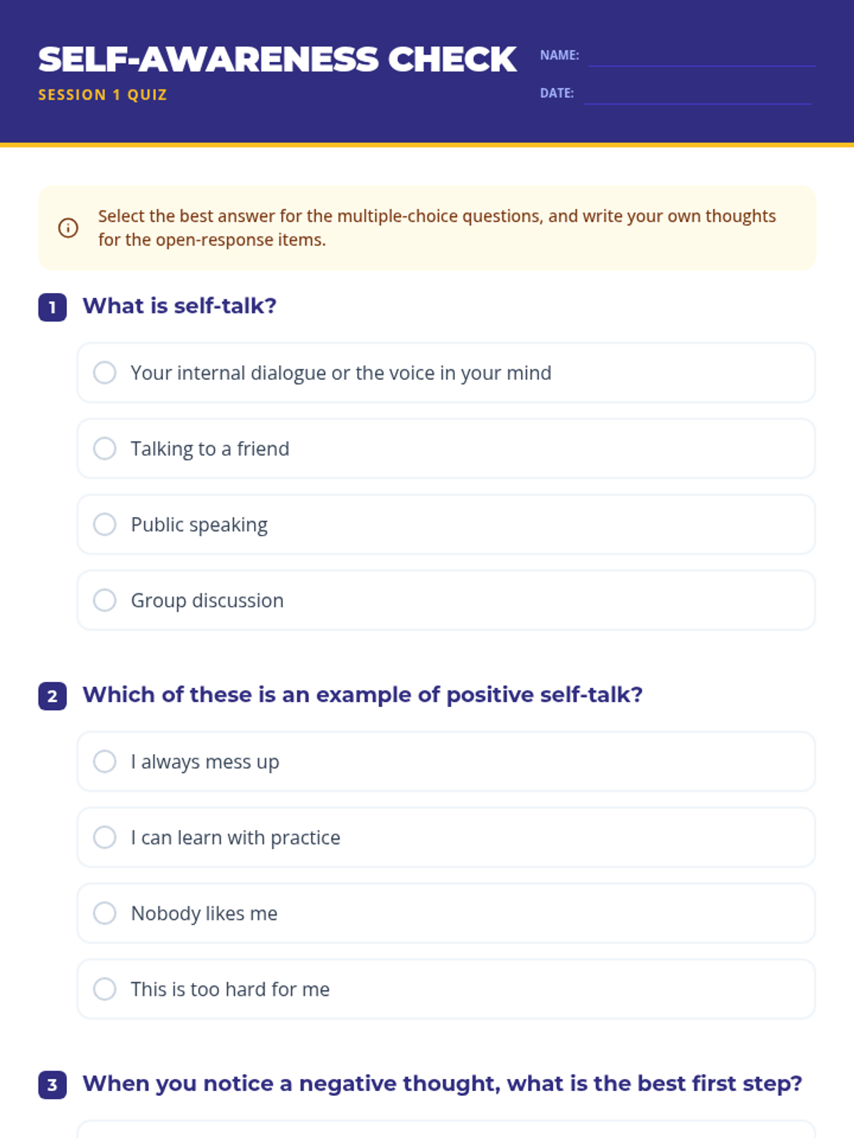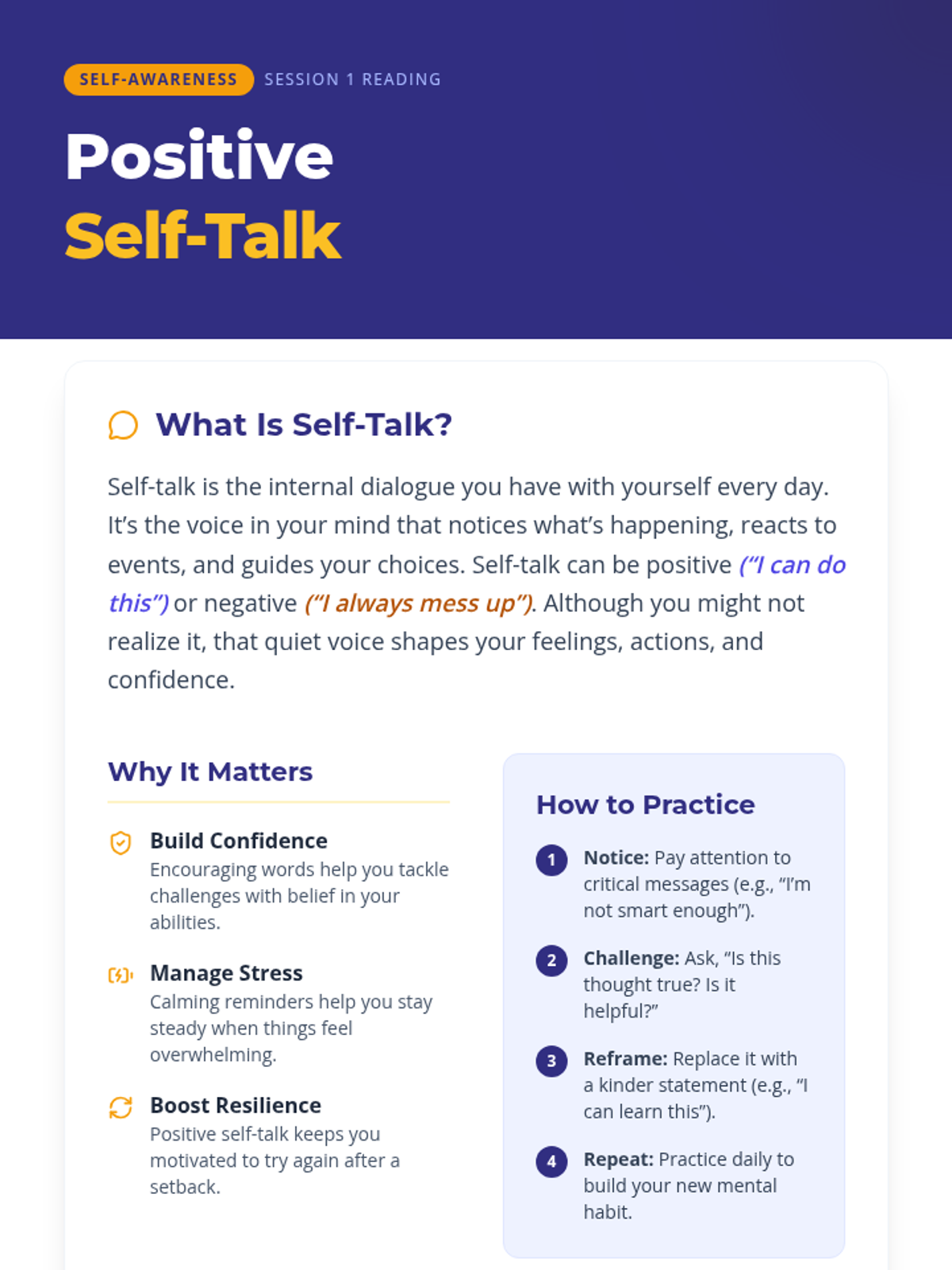 Focuses on identifying personal strengths and the fundamentals of self-talk, teaching students to notice and reframe negative internal dialogues.
