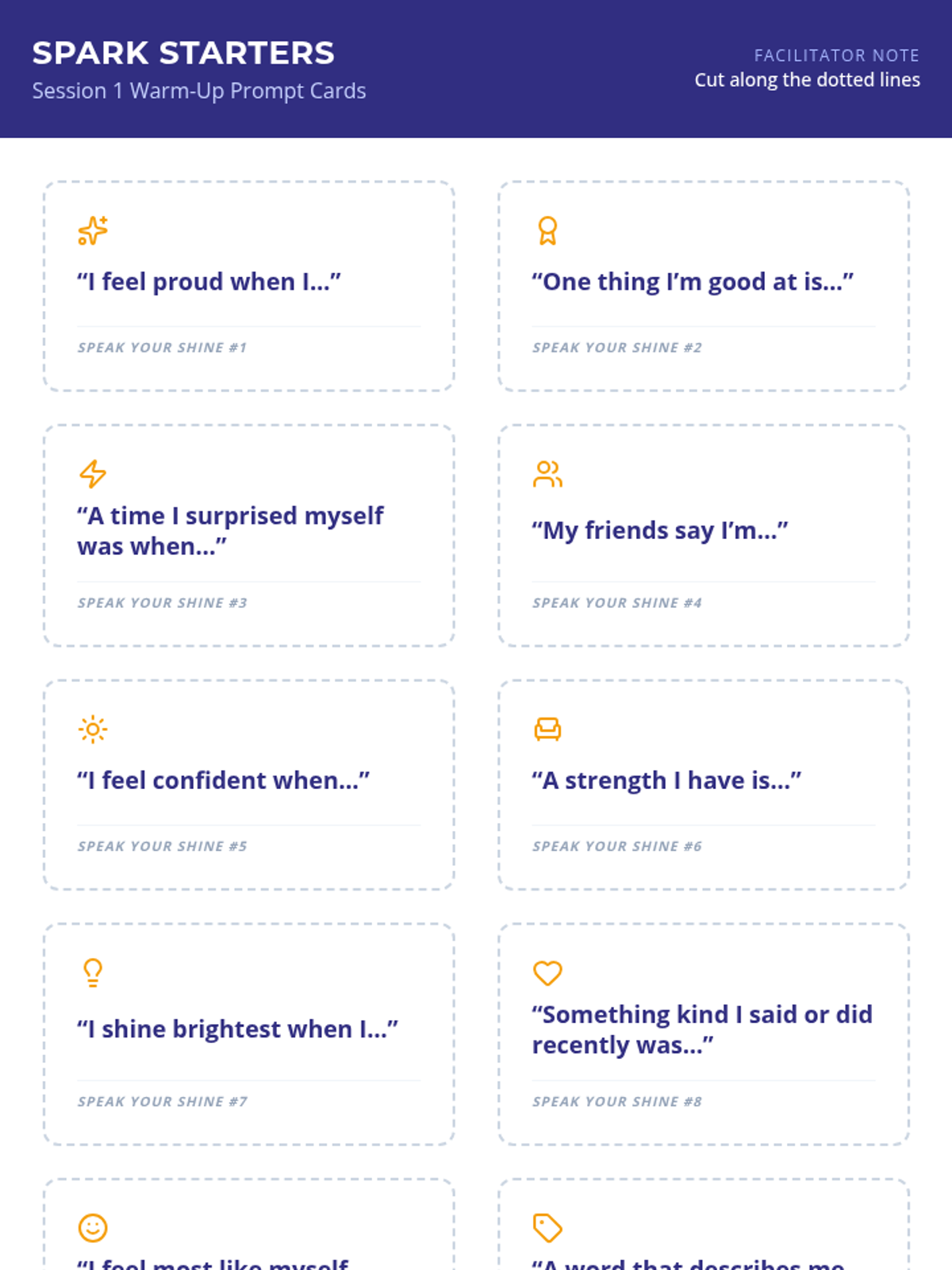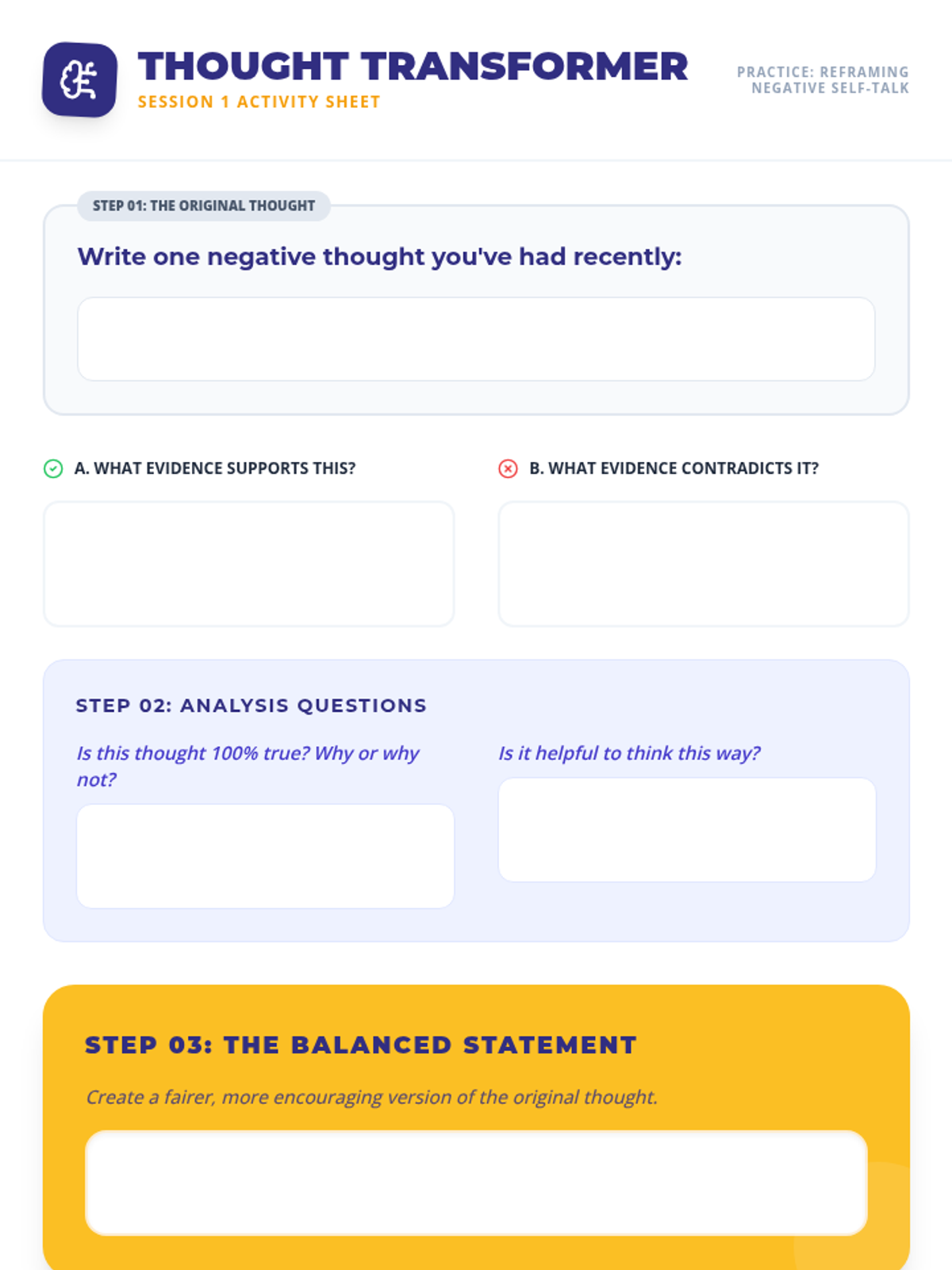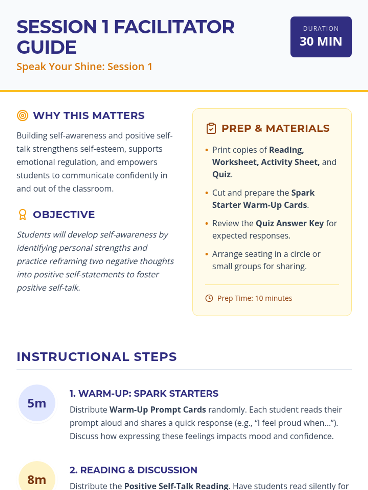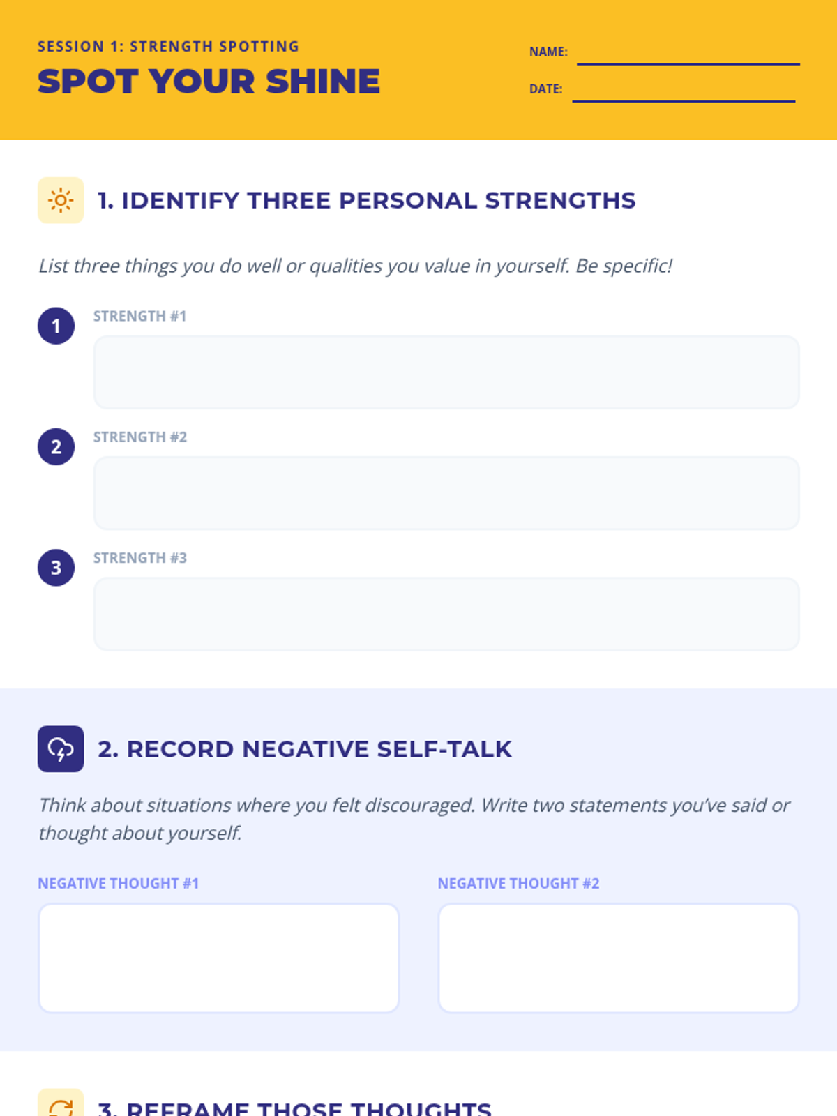 Focuses on identifying personal strengths and the fundamentals of self-talk, teaching students to notice and reframe negative internal dialogues.