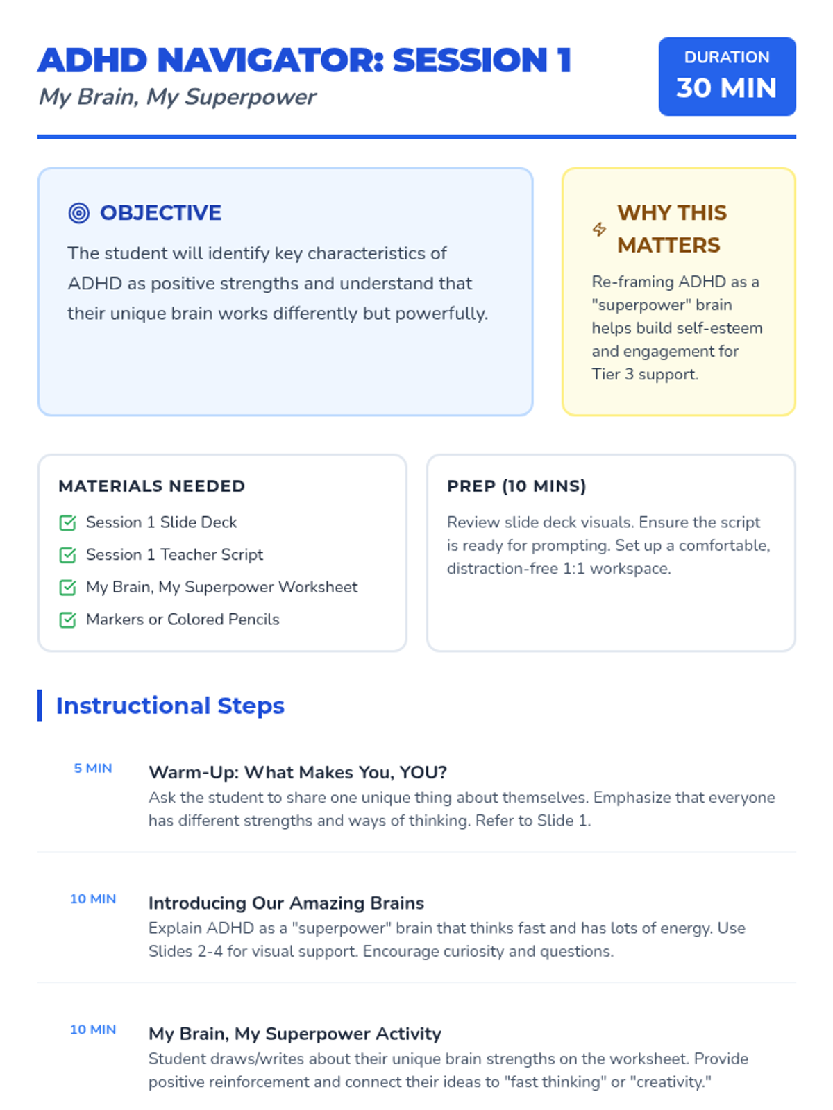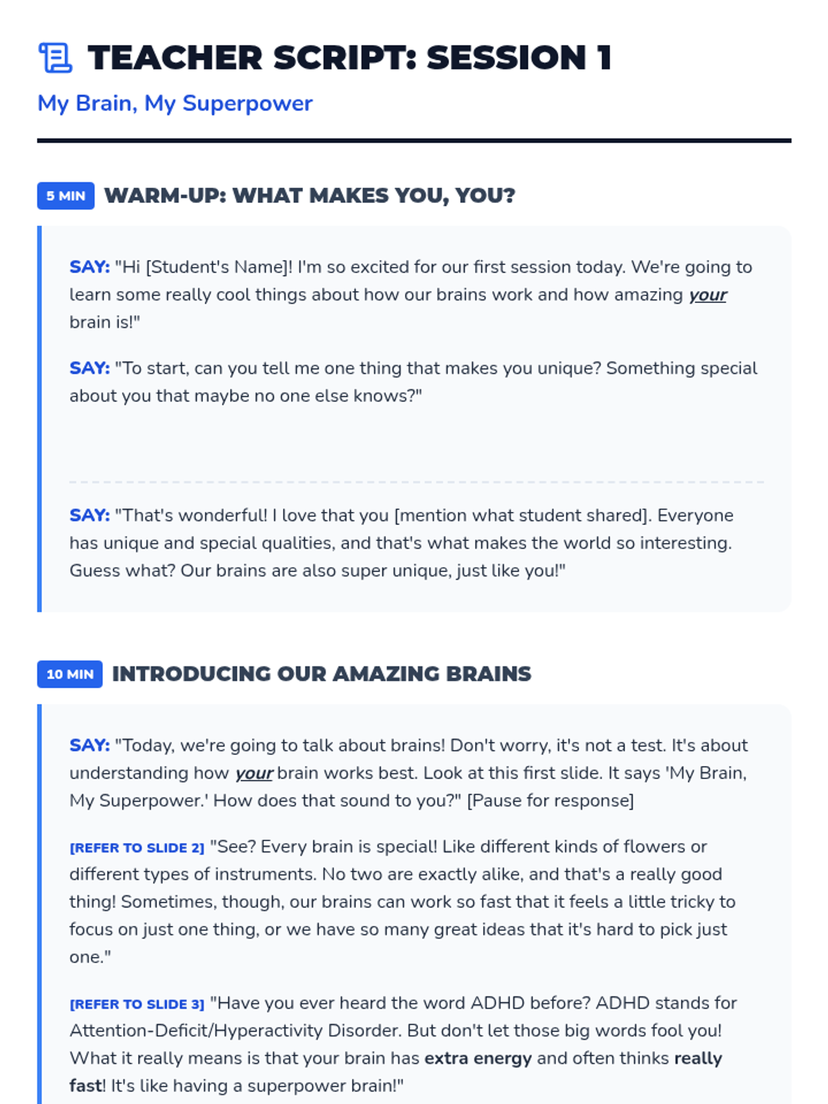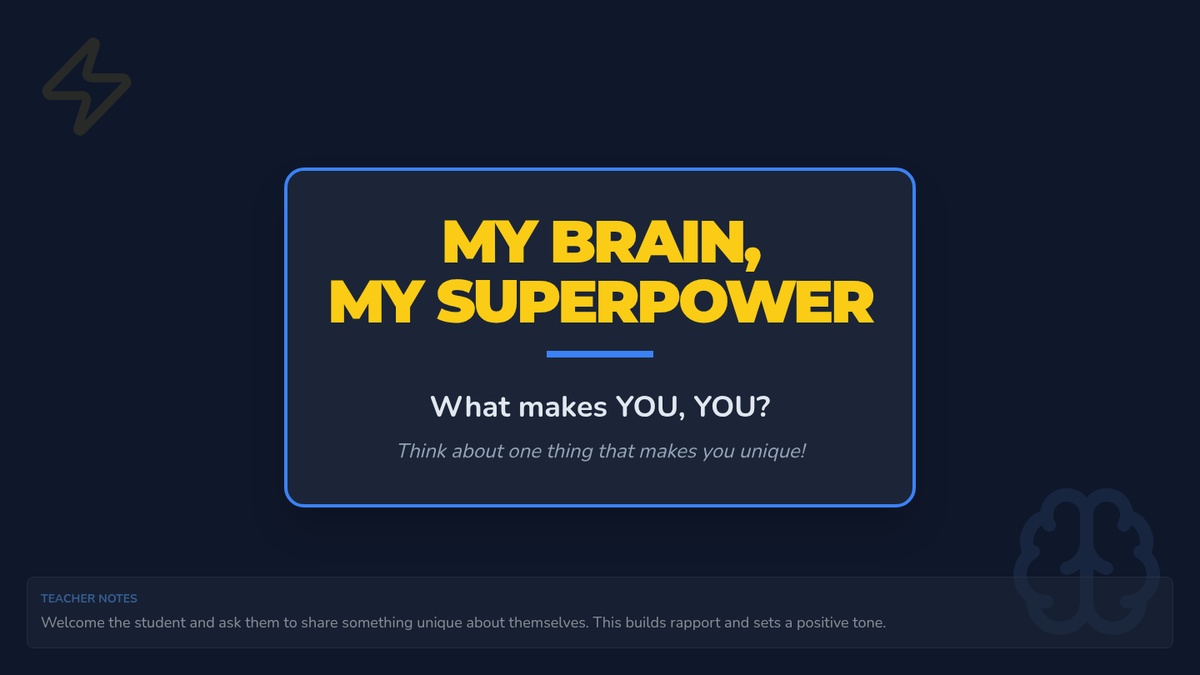 Introduces the concept of the ADHD brain as a 'superpower' brain that thinks fast and has high energy, building positive self-identity.