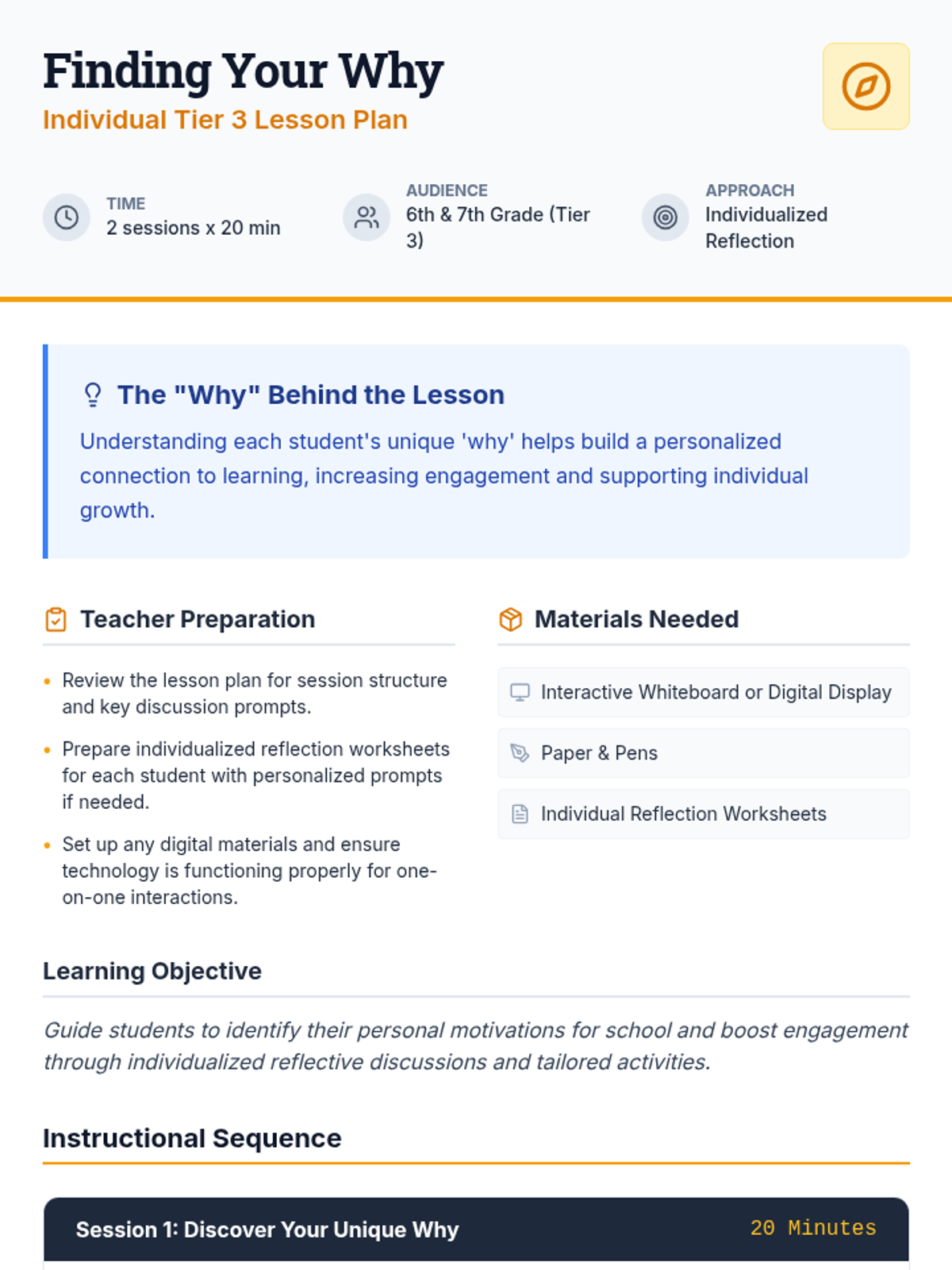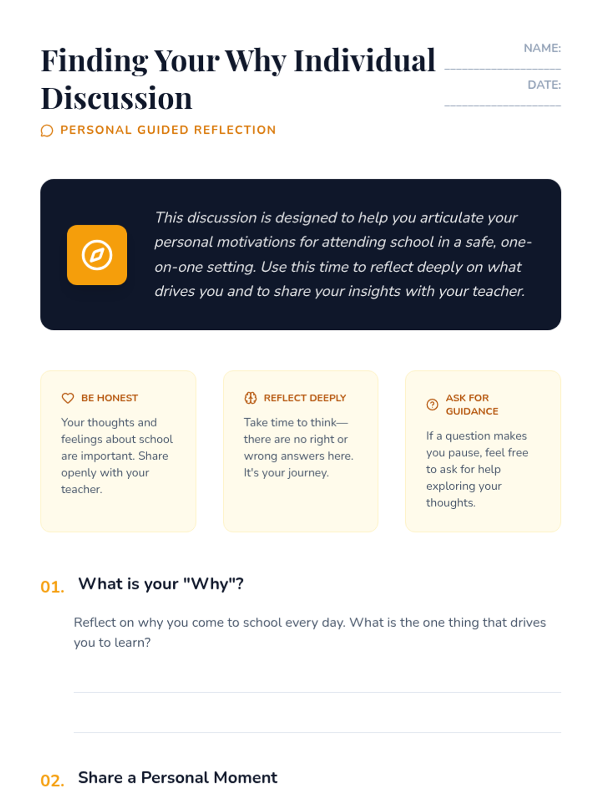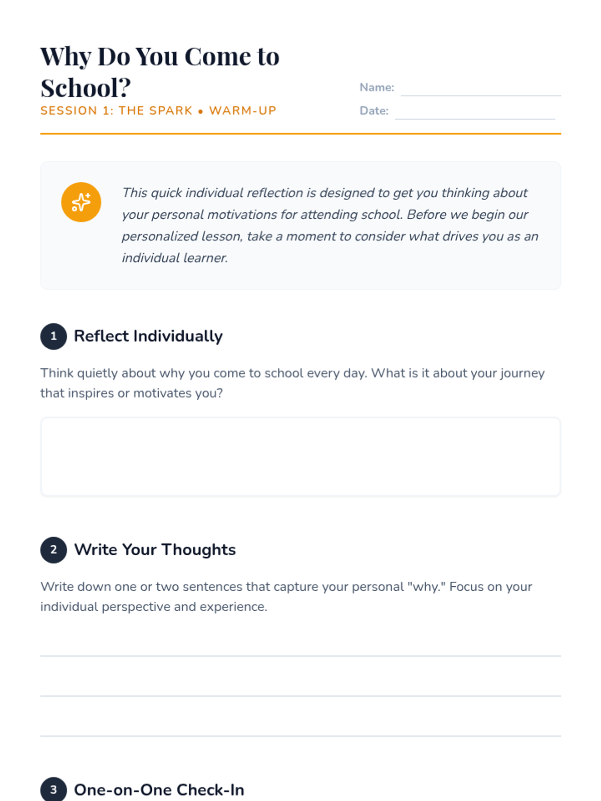 Students begin their journey of self-discovery by exploring their initial thoughts on school and engaging in a deep, one-on-one discussion about their personal 'why'.