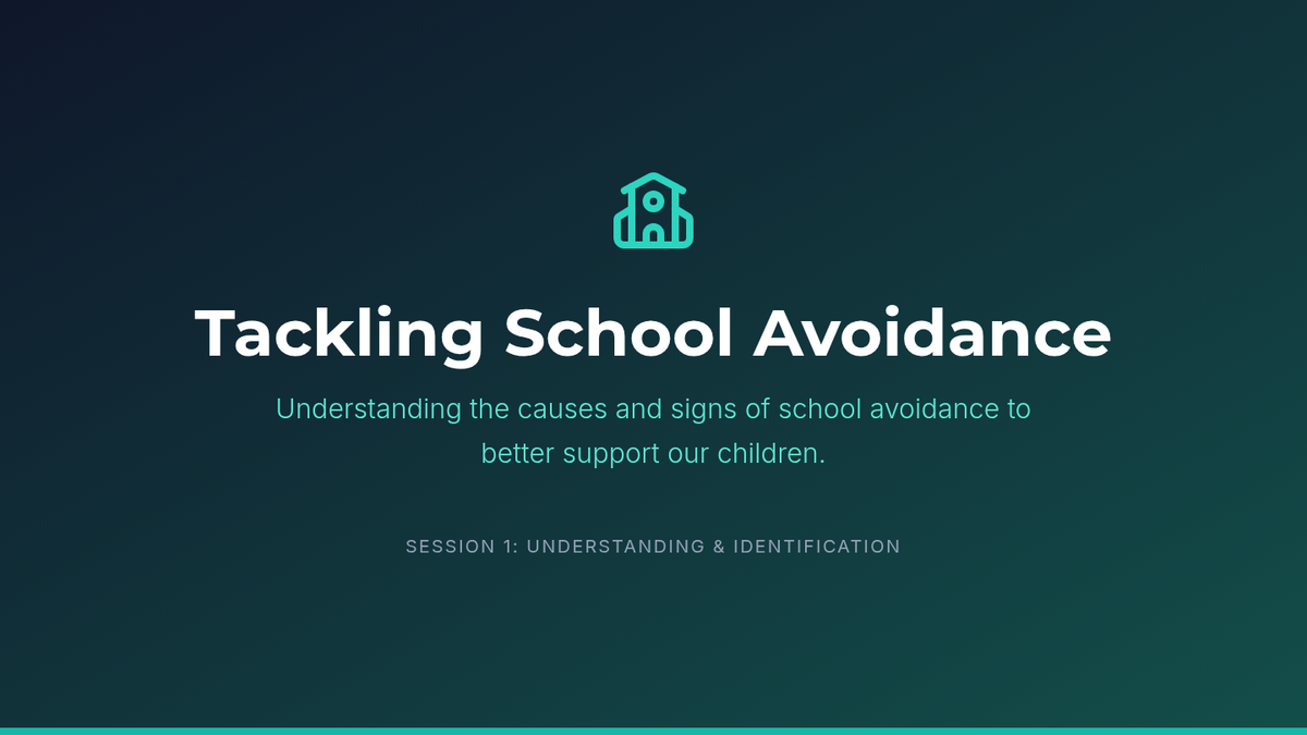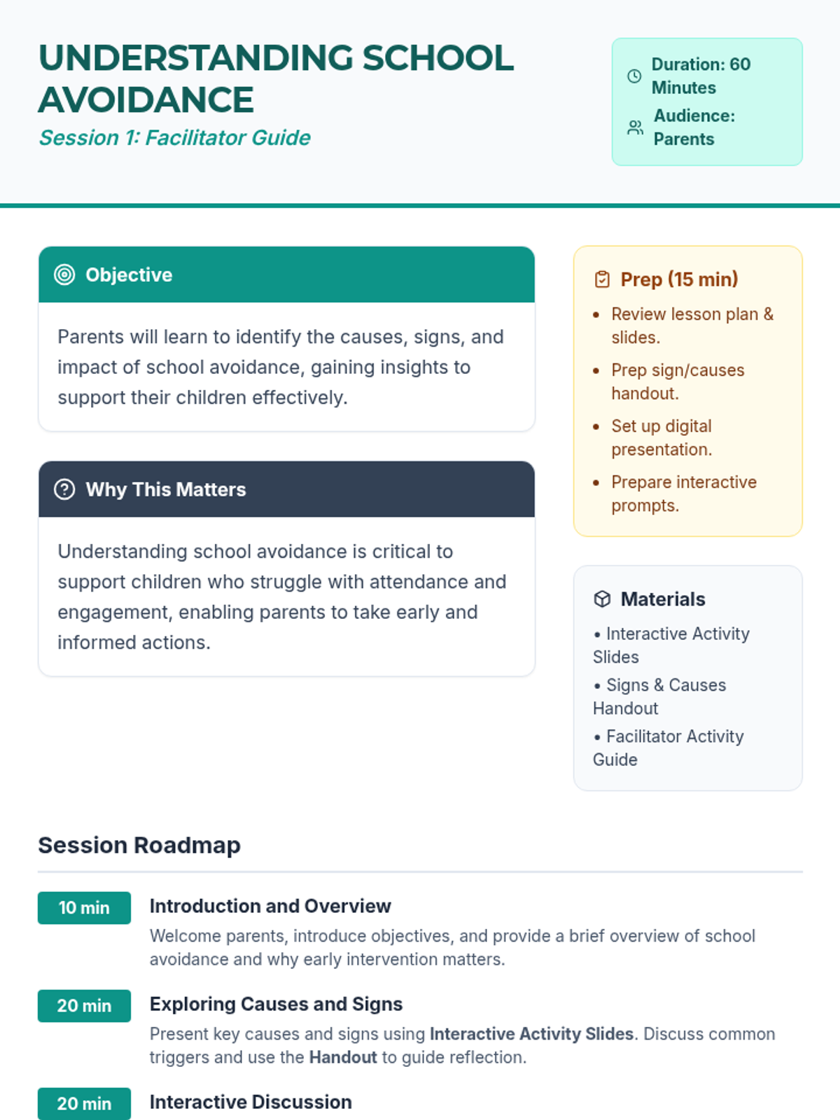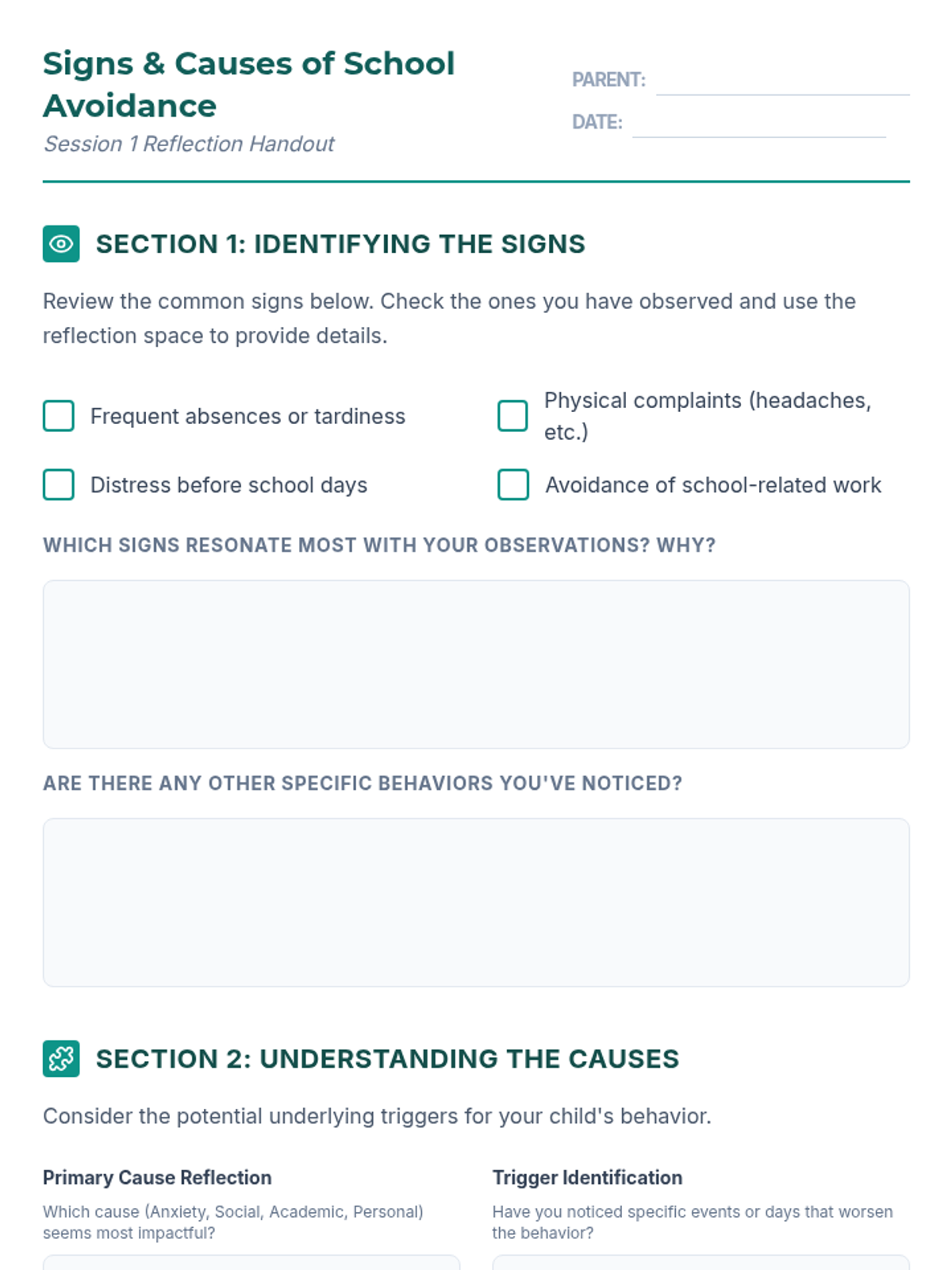 The first session focuses on identifying the causes, signs, and emotional impact of school avoidance to build a foundation for effective intervention.