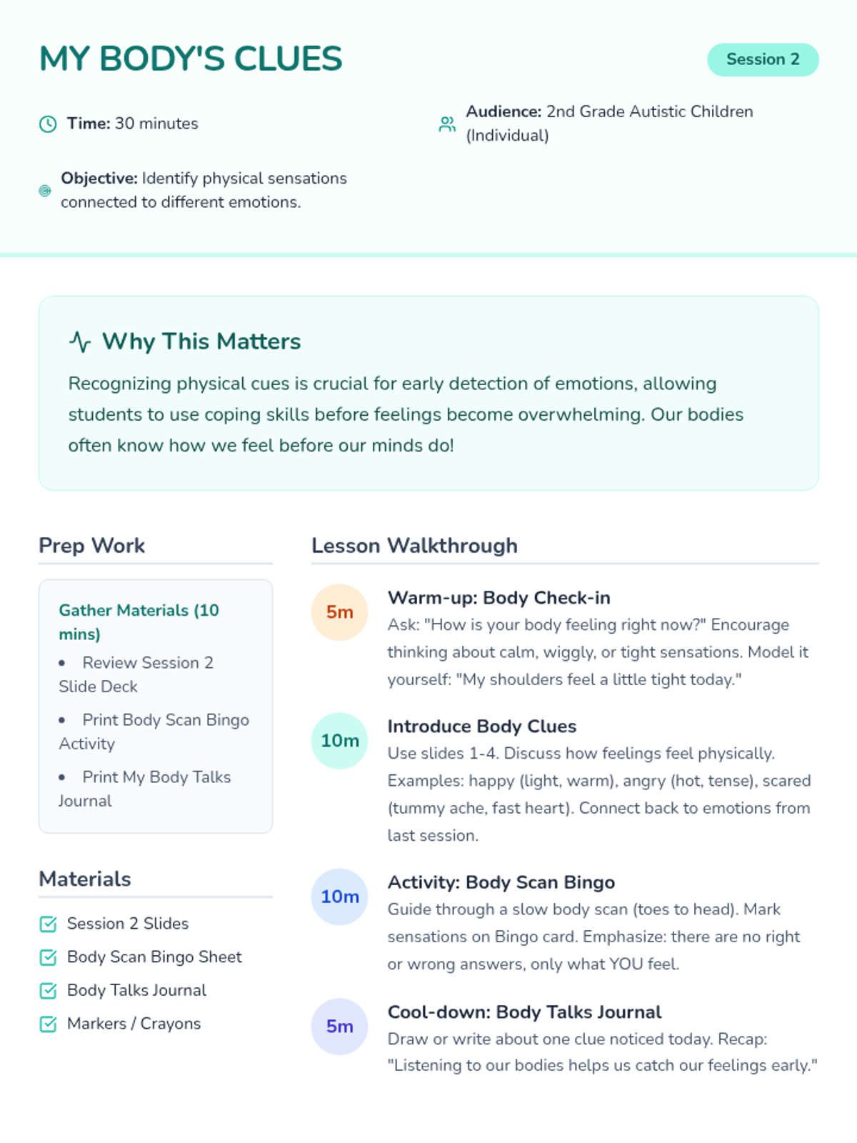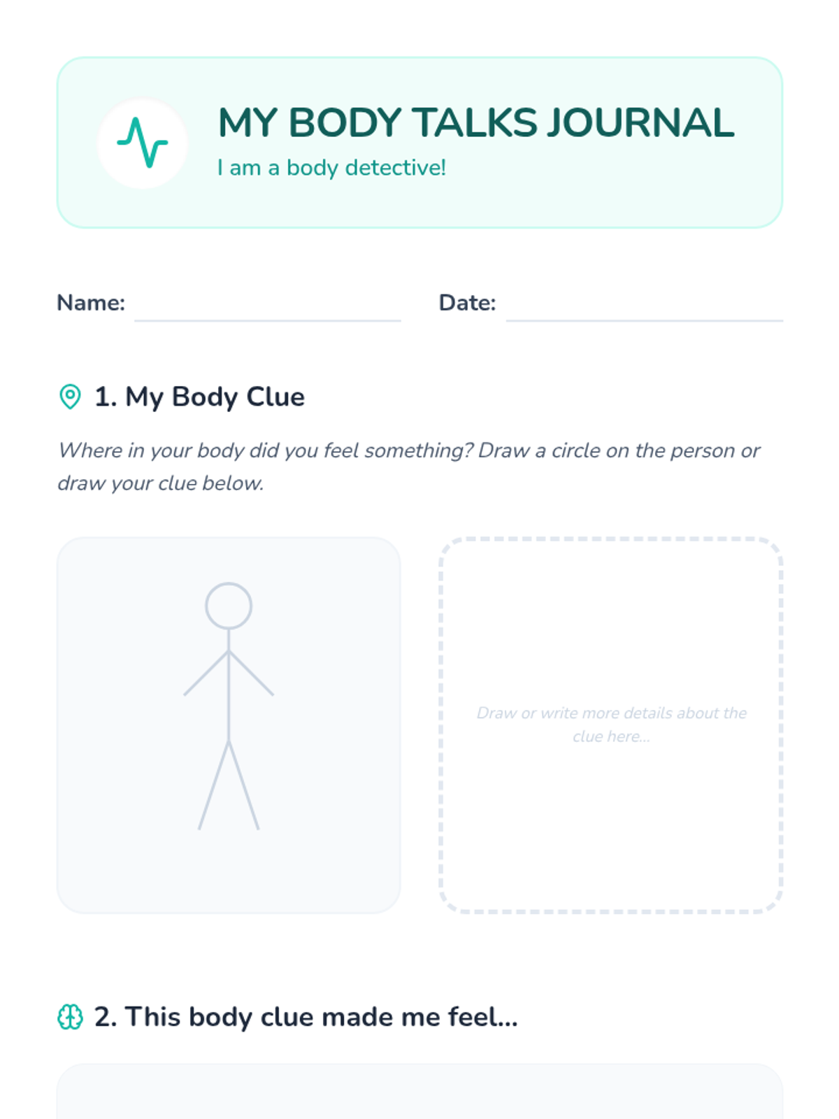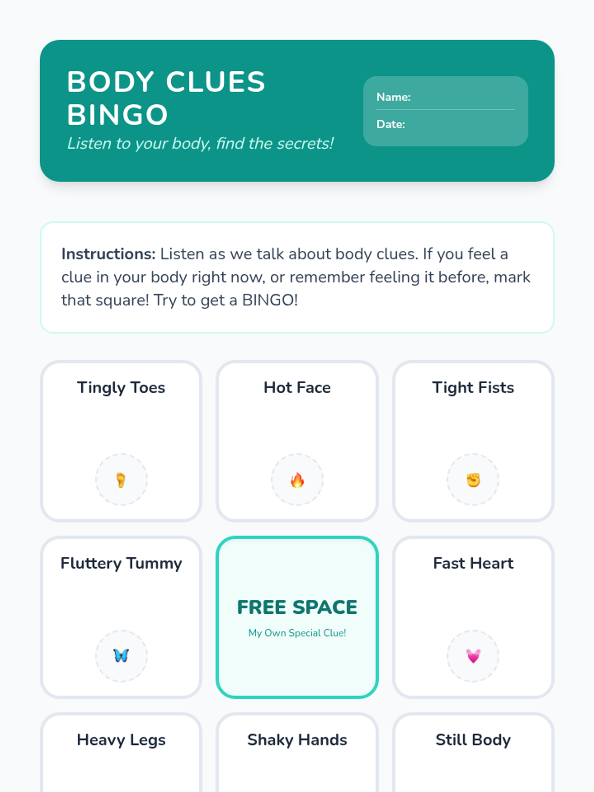 Students learn to connect physical sensations in their bodies to specific emotions, helping them identify feelings early through a guided body scan and bingo game.