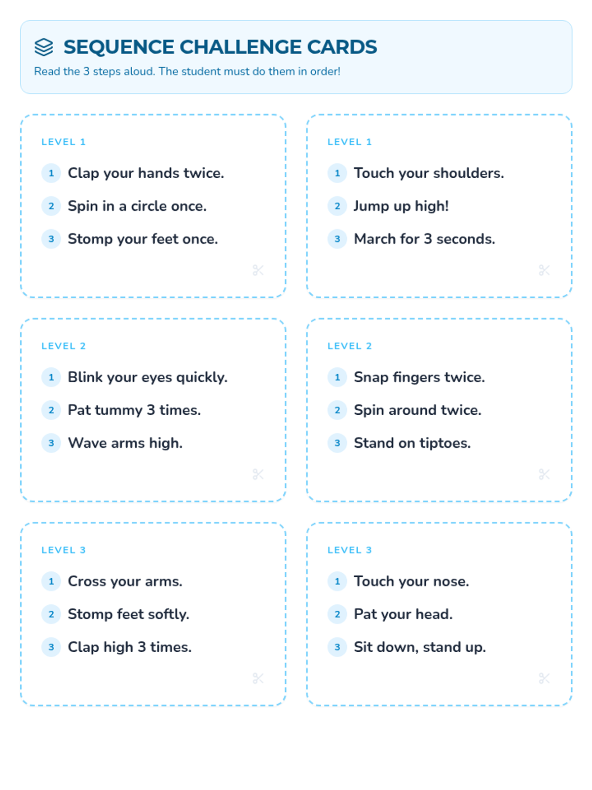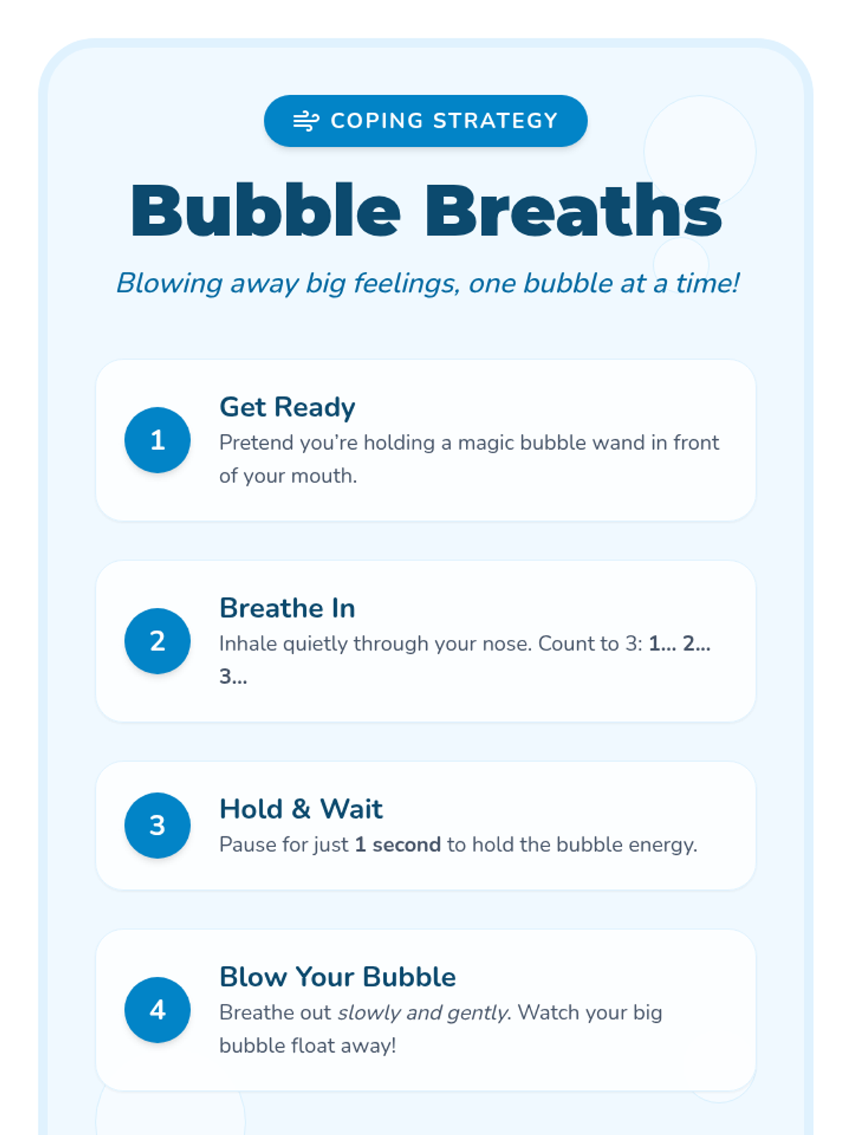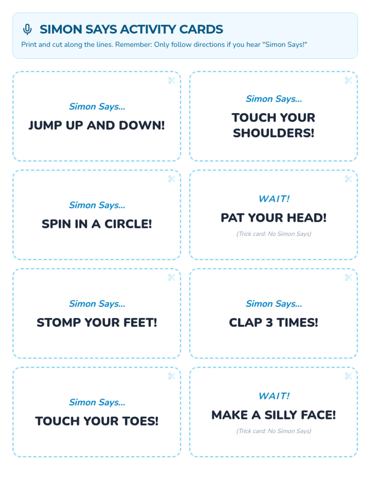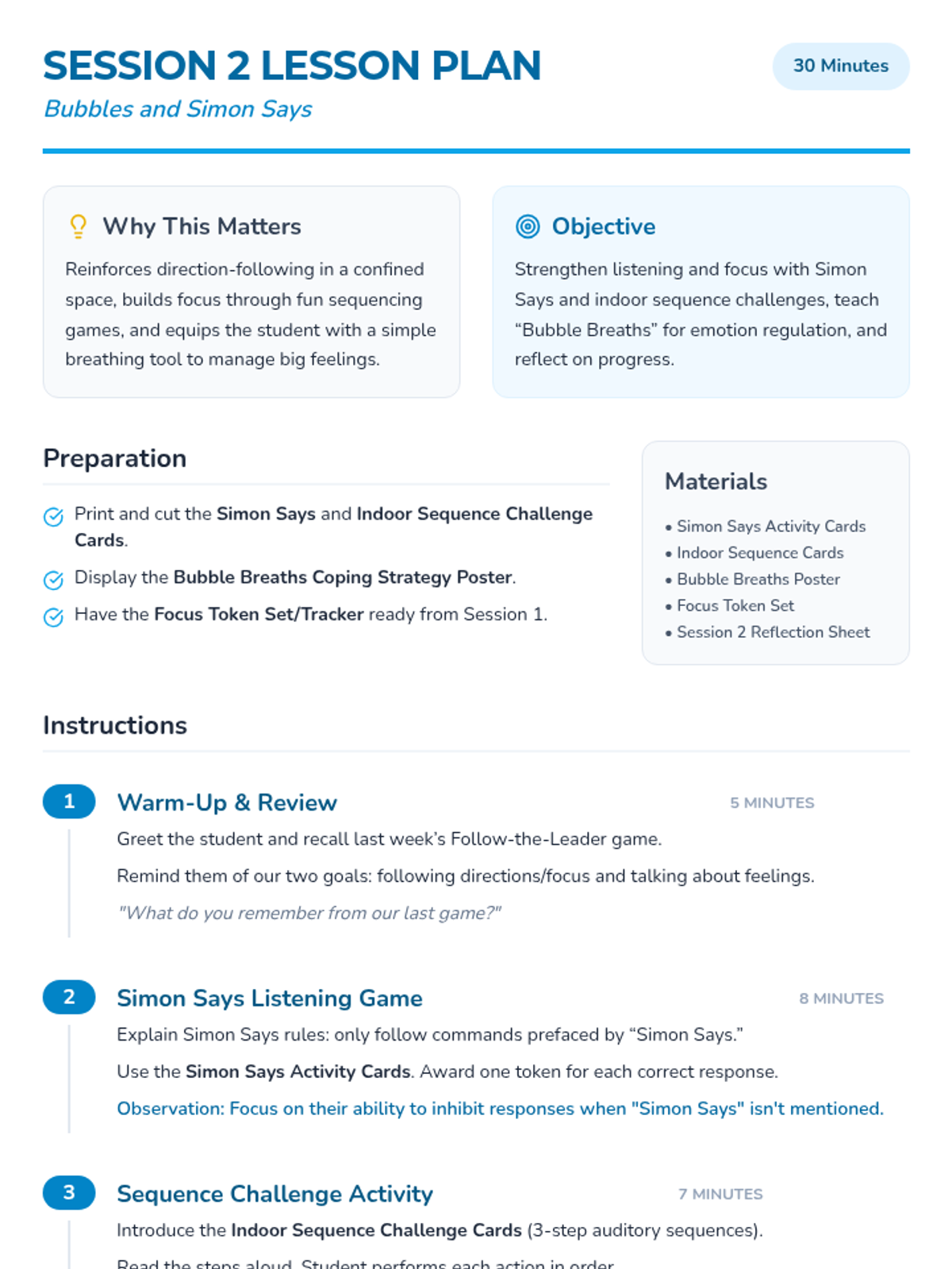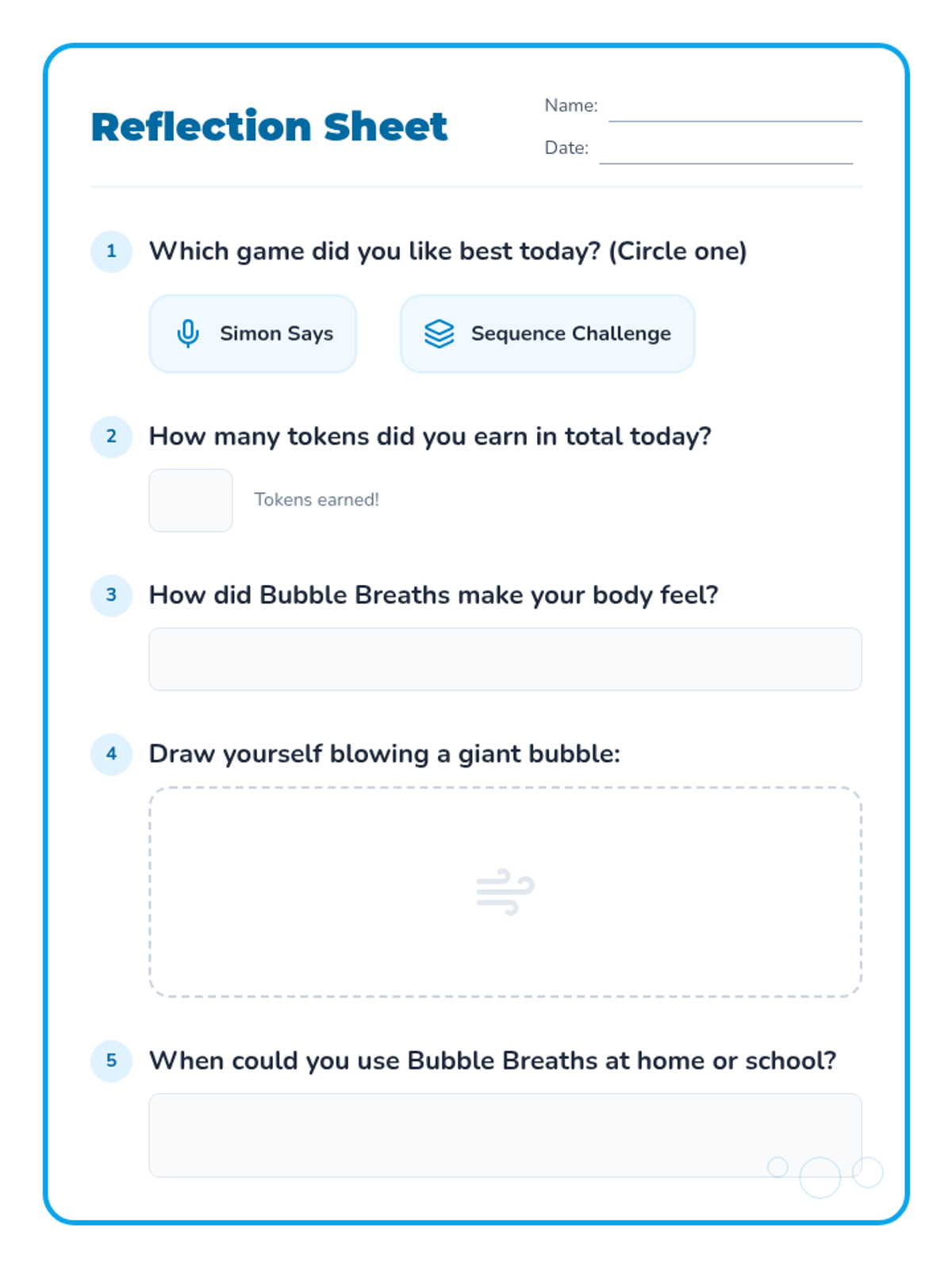Reinforces listening and sequencing skills through Simon Says and indoor challenges while introducing Bubble Breaths as a calming tool.