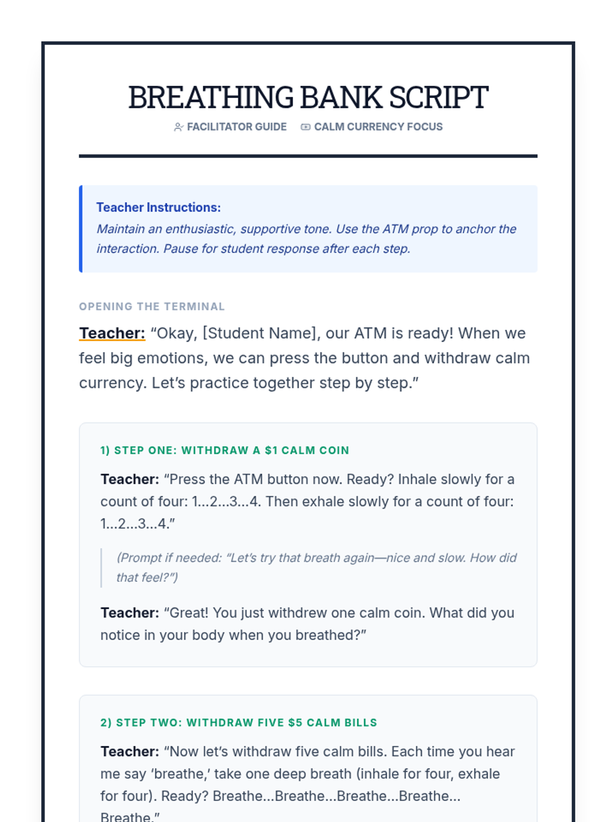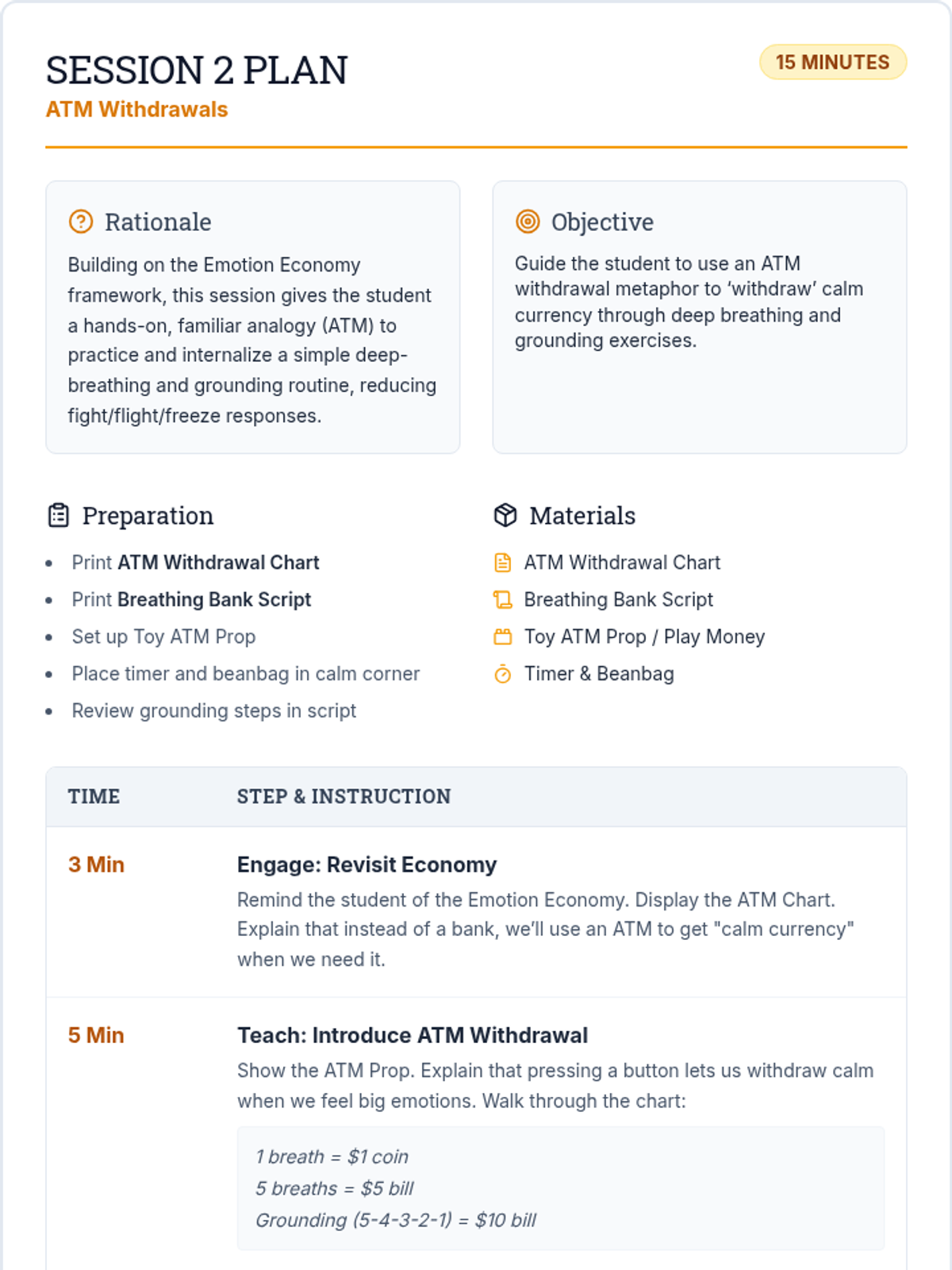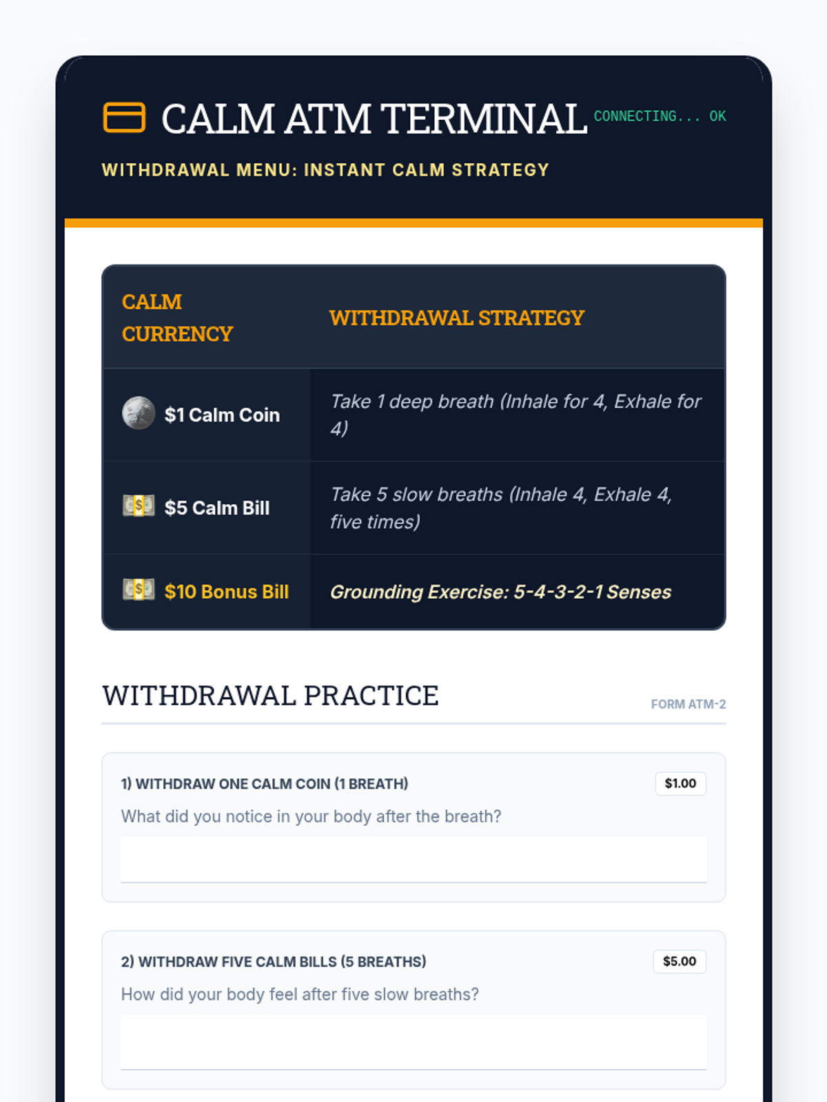 Focuses on immediate calming strategies using the ATM withdrawal metaphor for deep breathing and grounding.