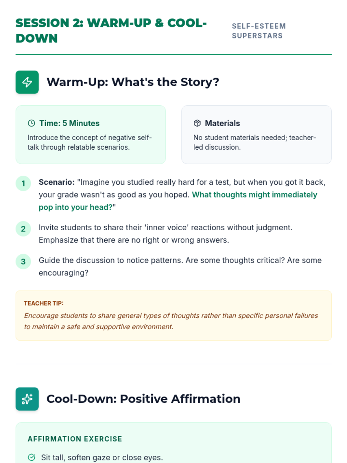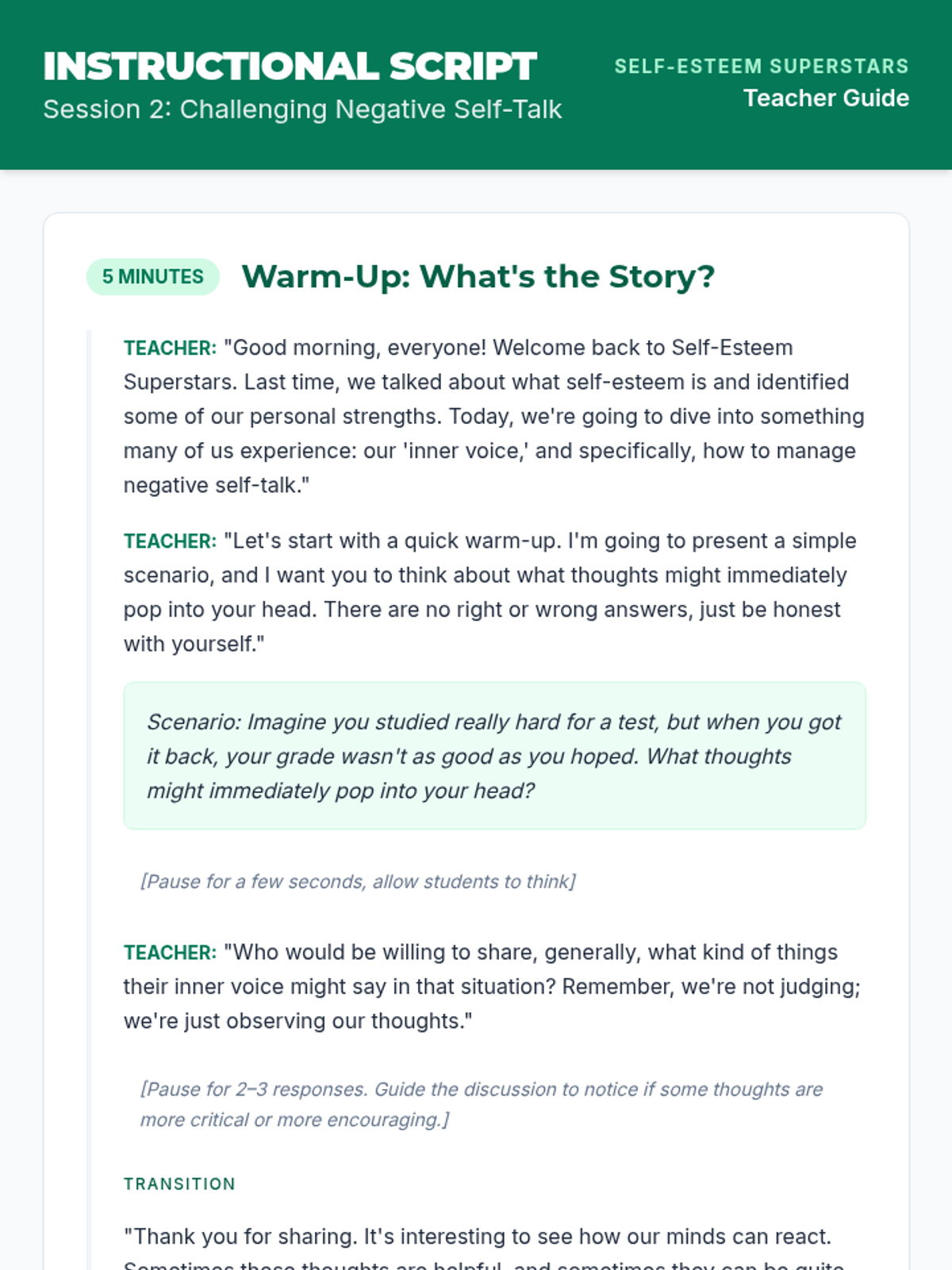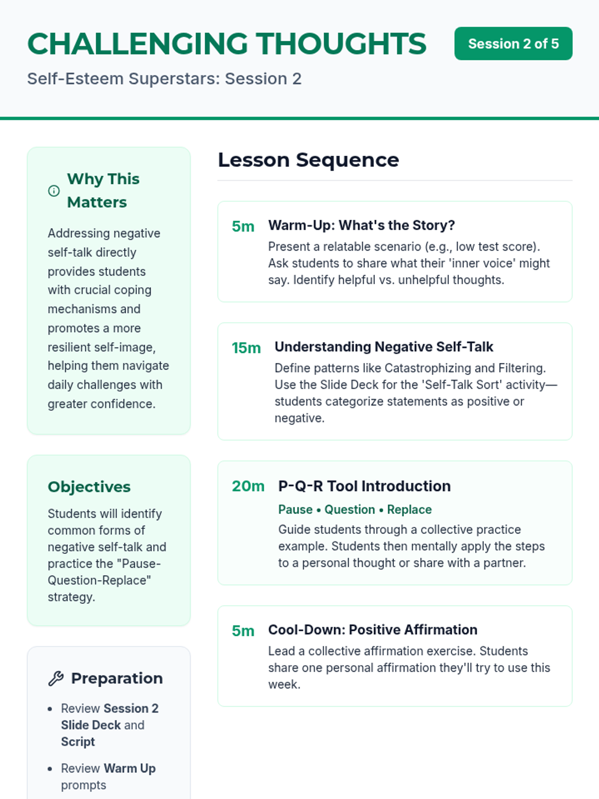 Students identify negative self-talk patterns and learn the "Pause-Question-Replace" tool to build resilience.