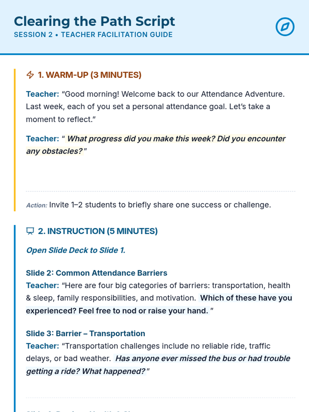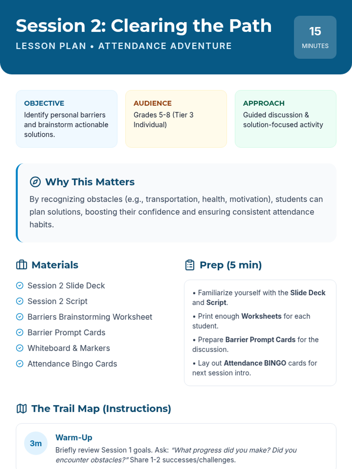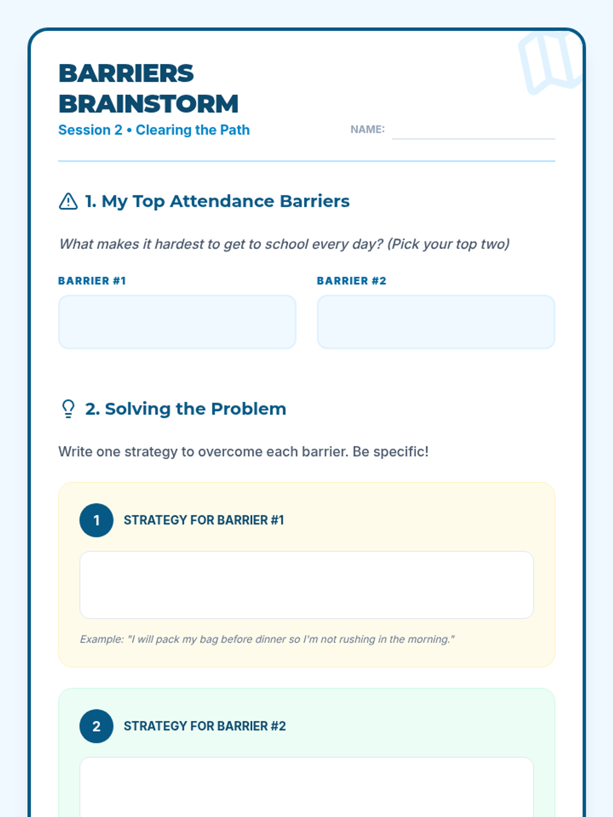 Focuses on identifying the specific obstacles that prevent regular attendance and brainstorming actionable solutions to clear the path to school.