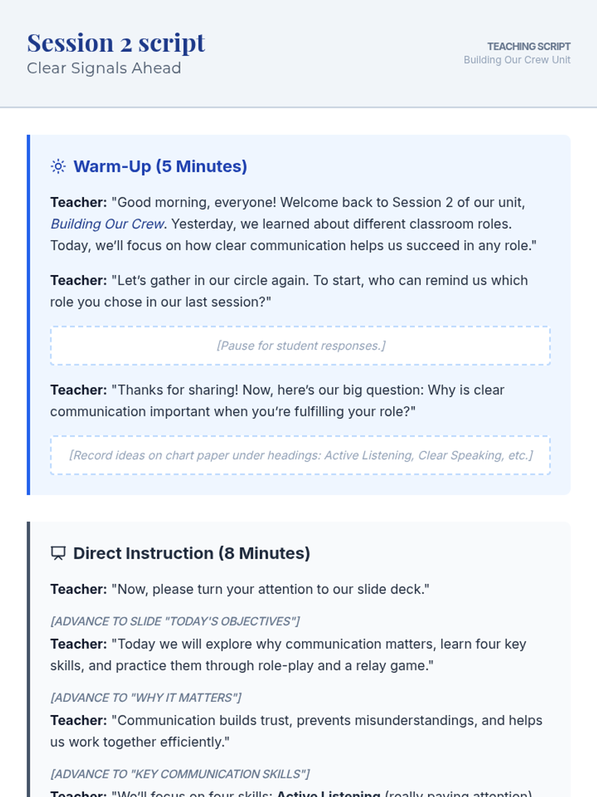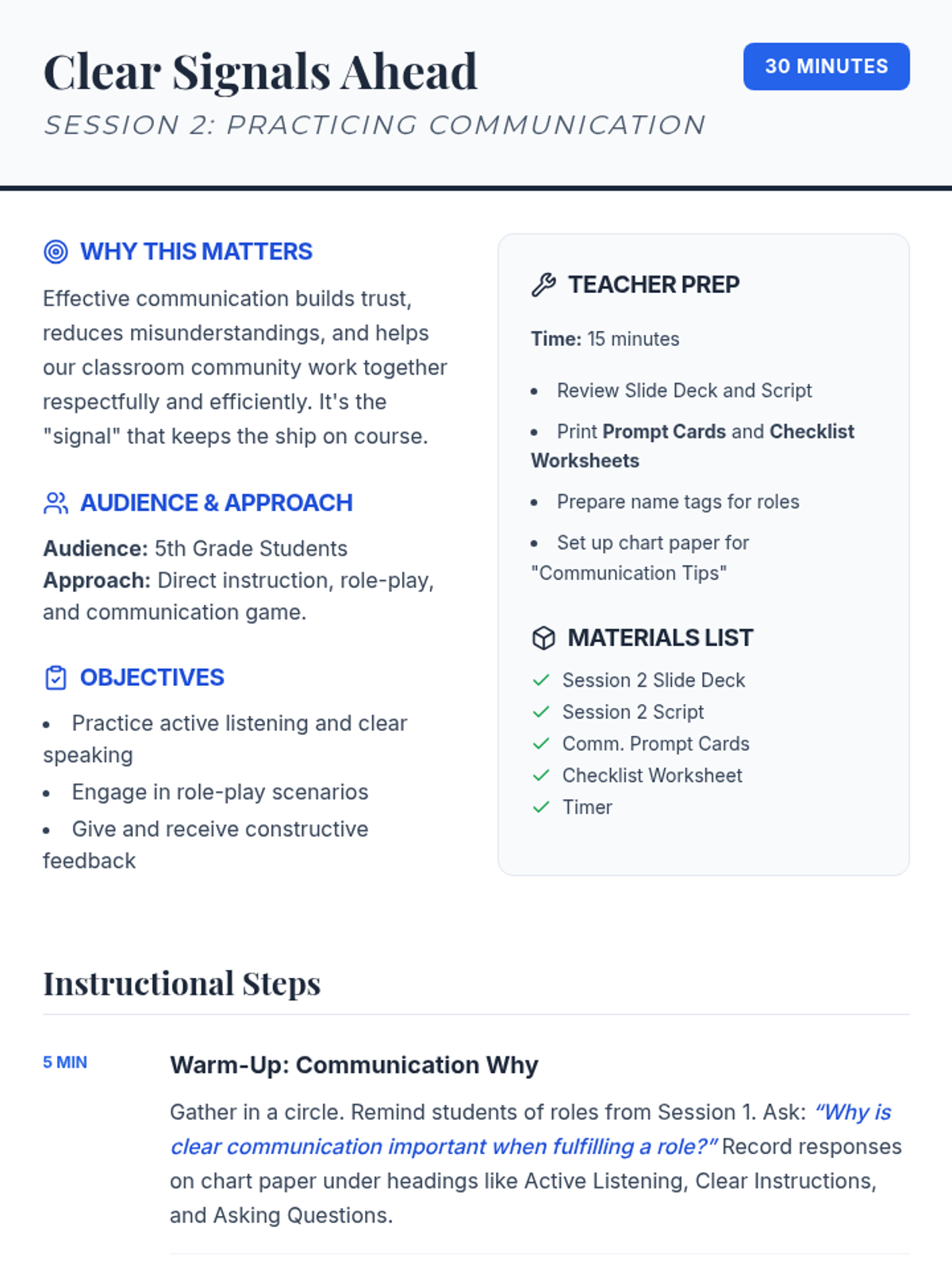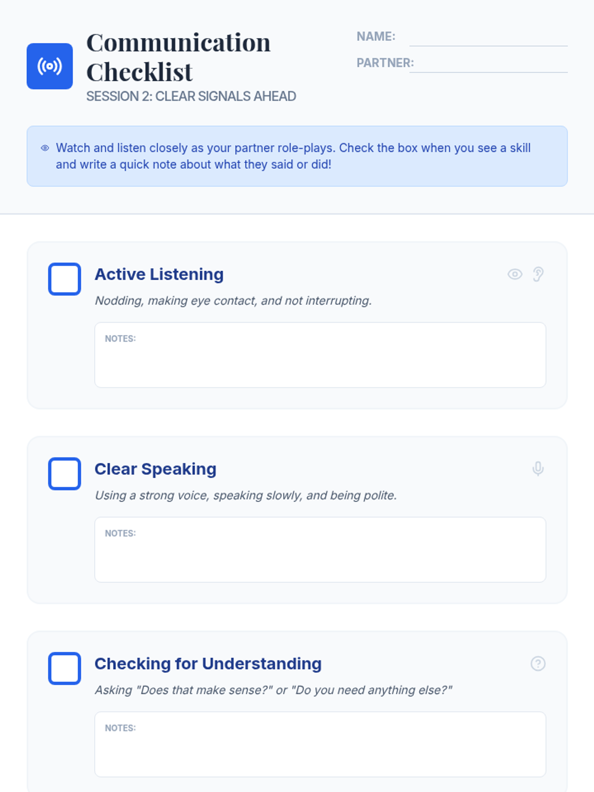 This session focuses on practical communication skills like active listening and clear speaking through role-play scenarios and a team-building communication relay.