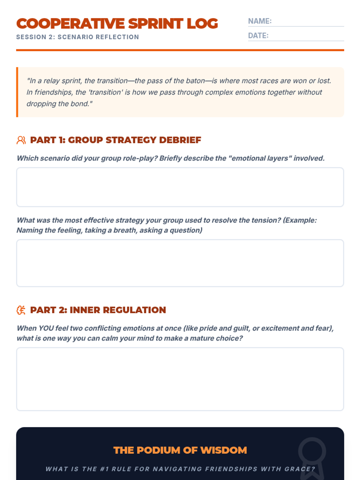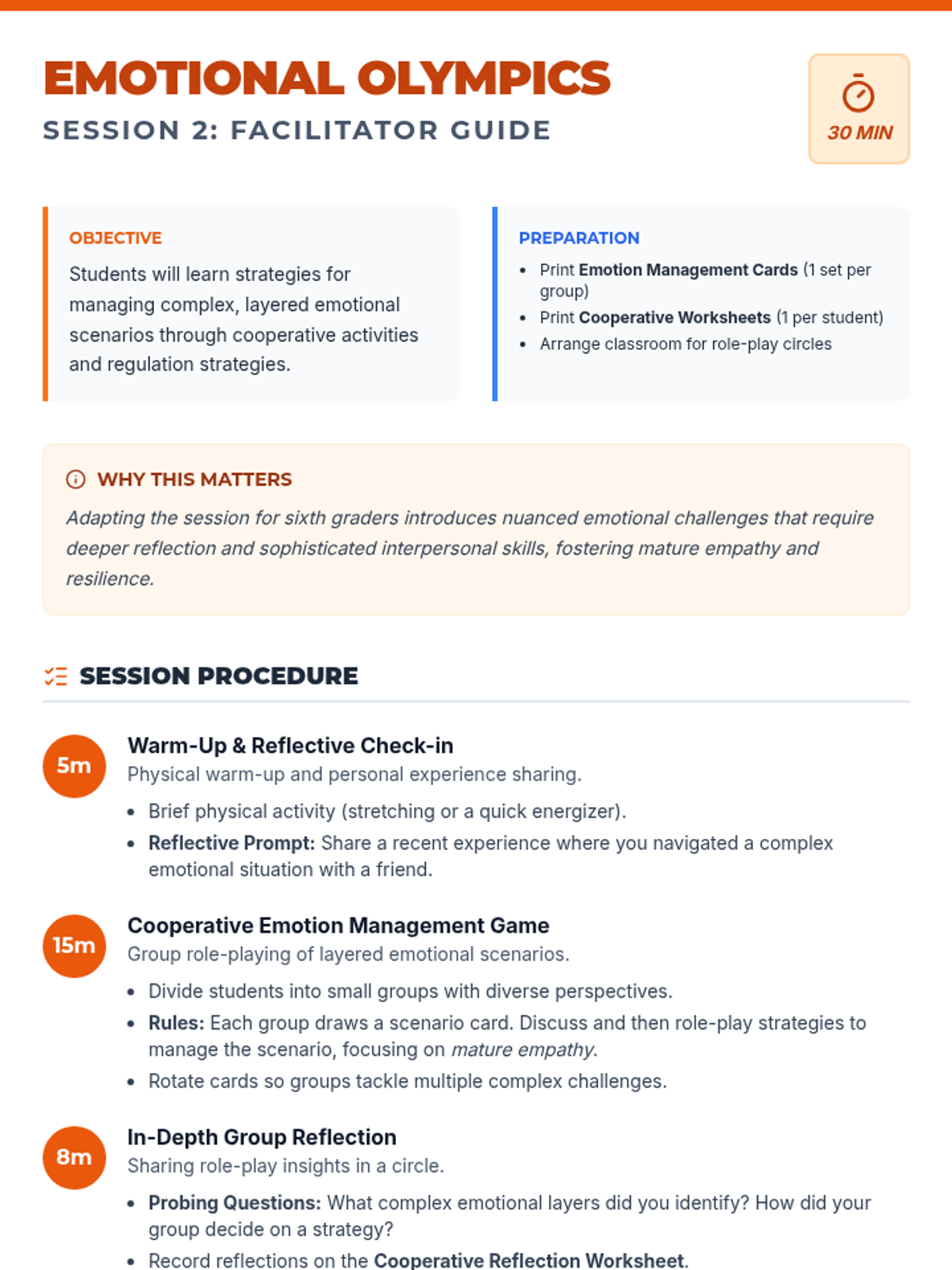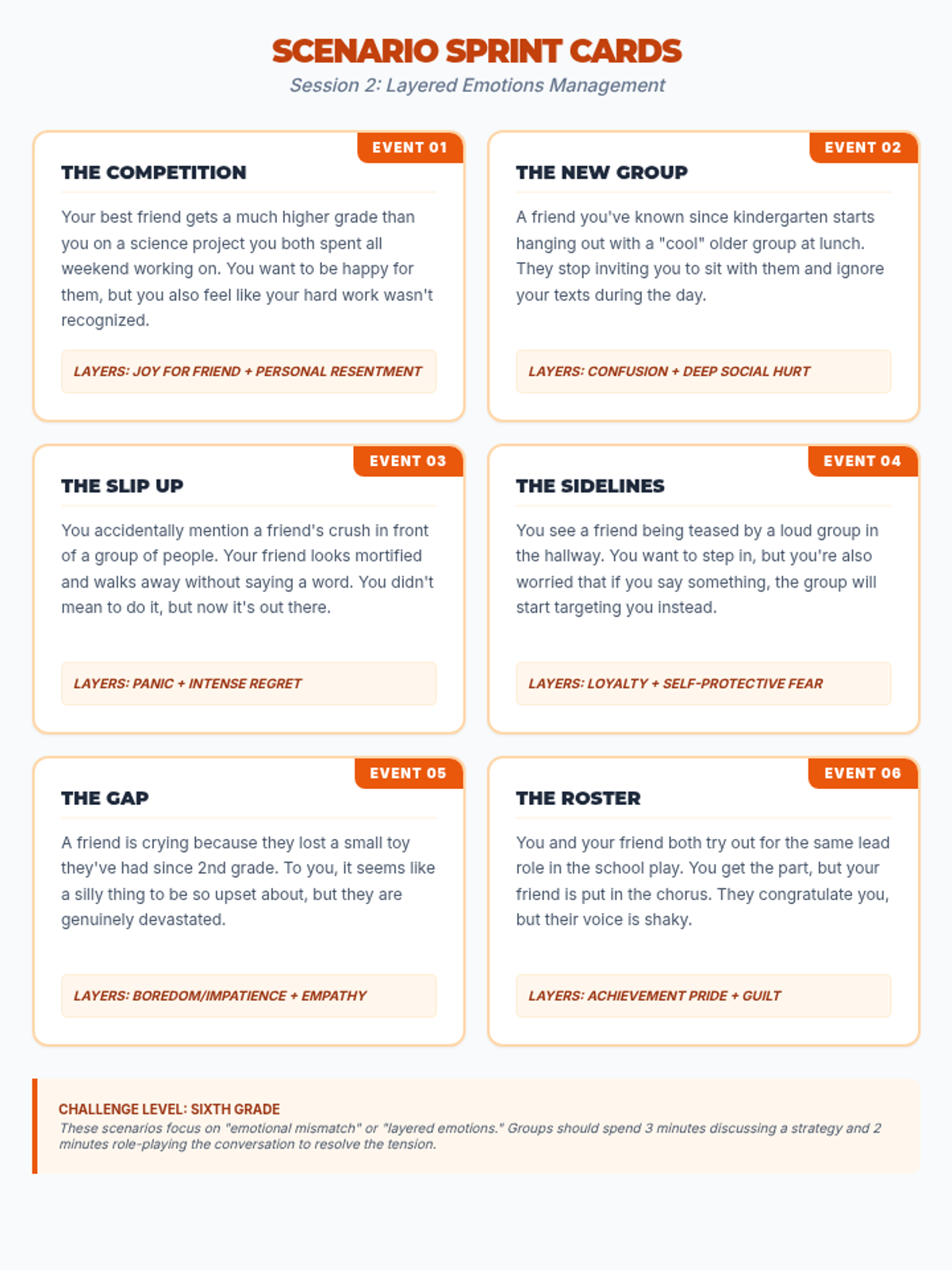Engages students in role-playing complex, layered emotional scenarios in friendships to practice advanced emotional regulation and cooperative problem-solving.