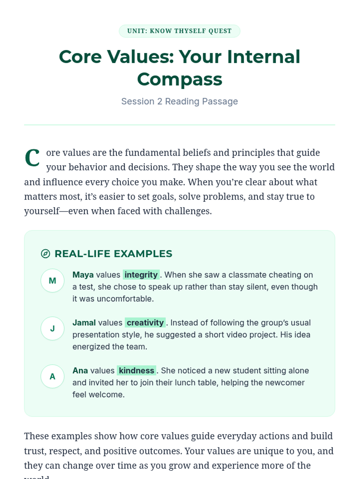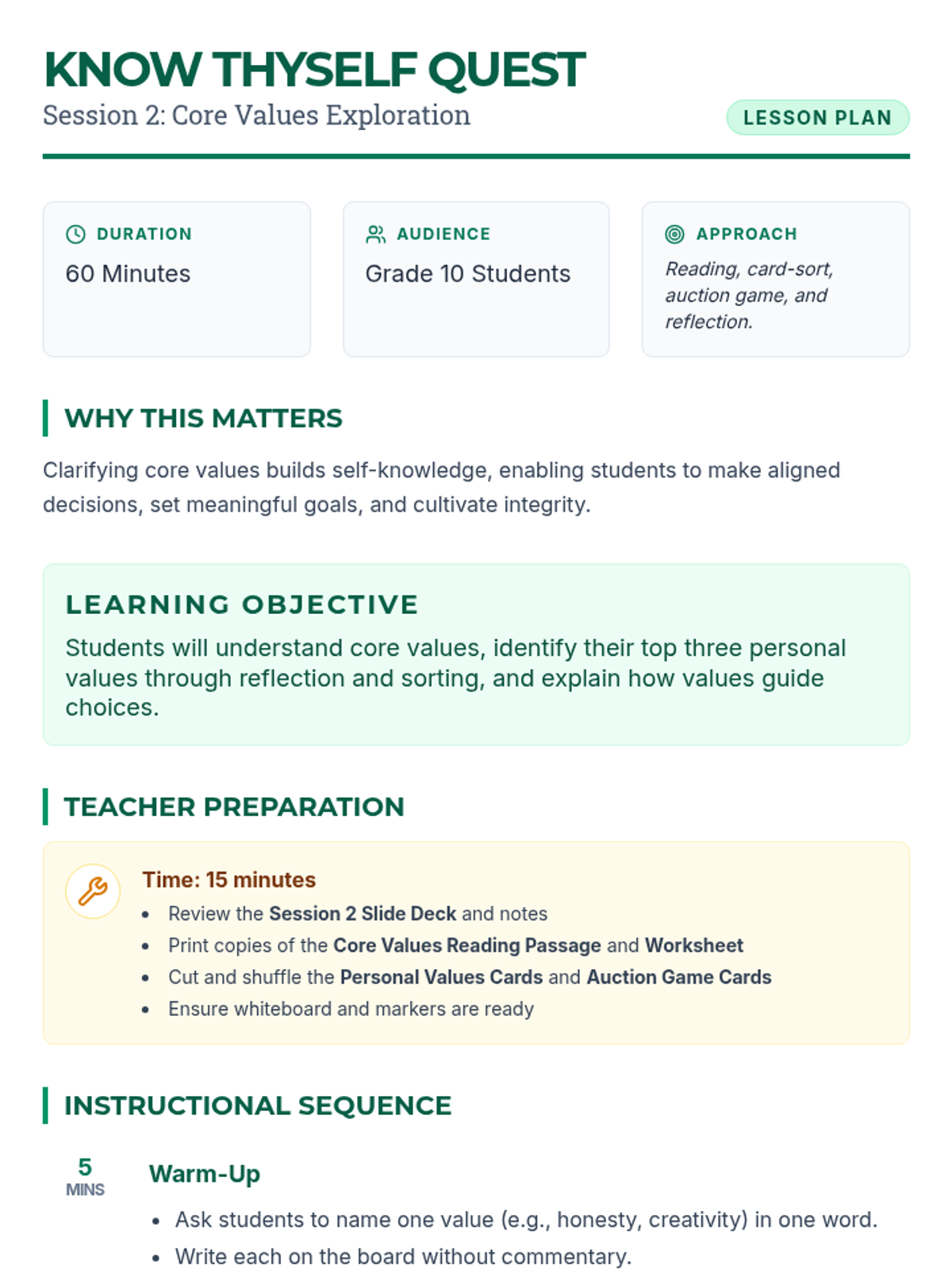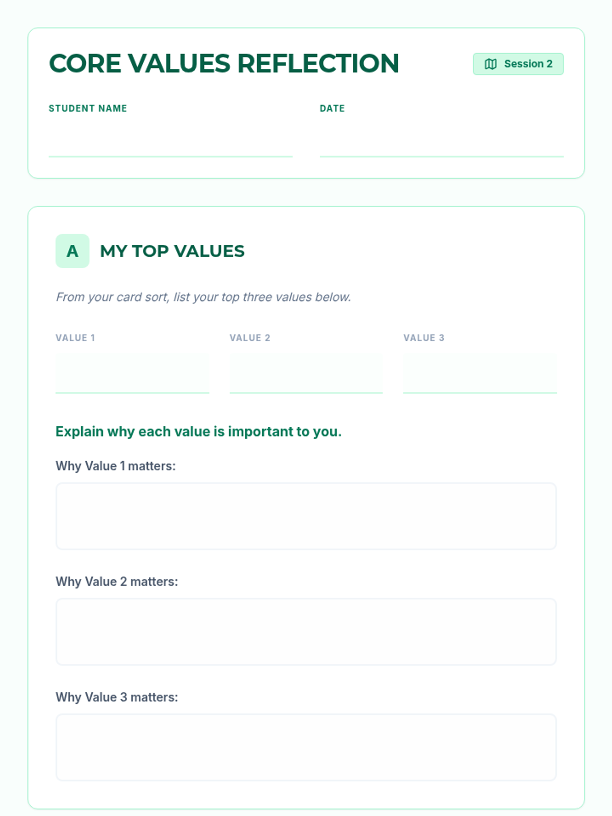 Students will understand the concept of core values, identify their top three personal values through reflection and sorting, and explain how these values guide choices.