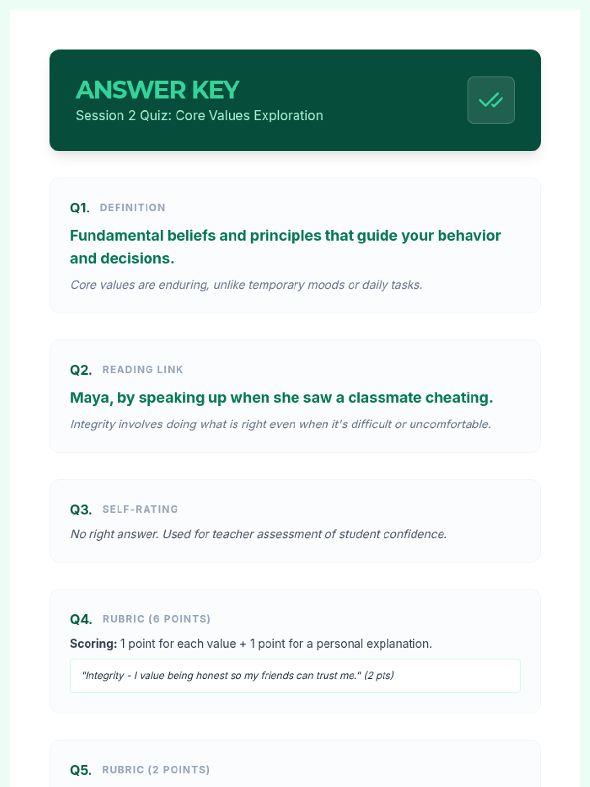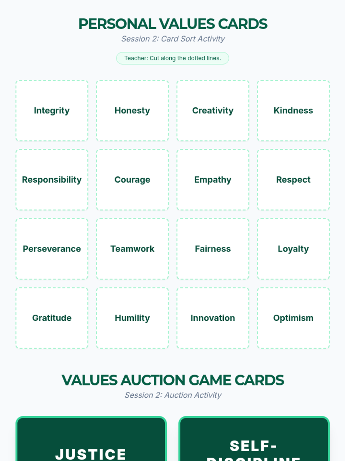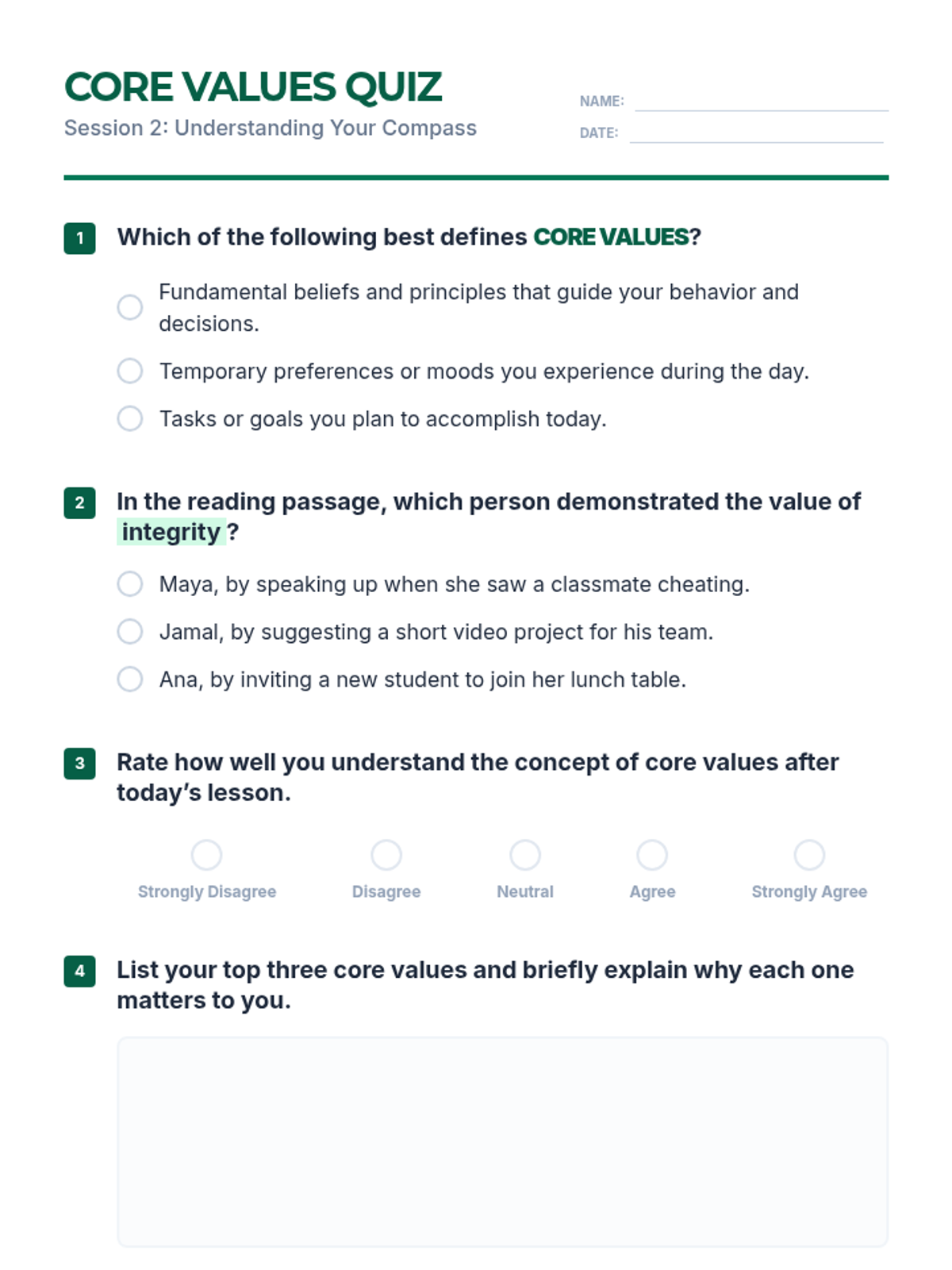 Students will understand the concept of core values, identify their top three personal values through reflection and sorting, and explain how these values guide choices.