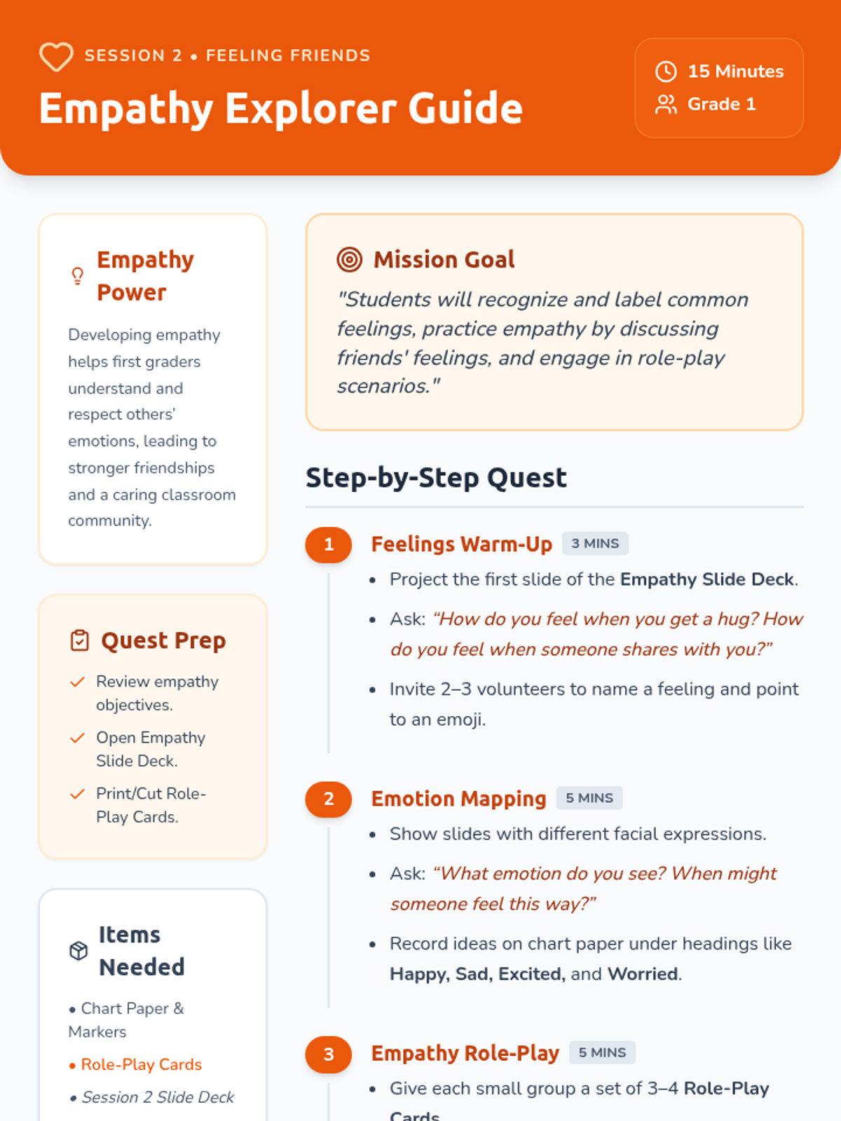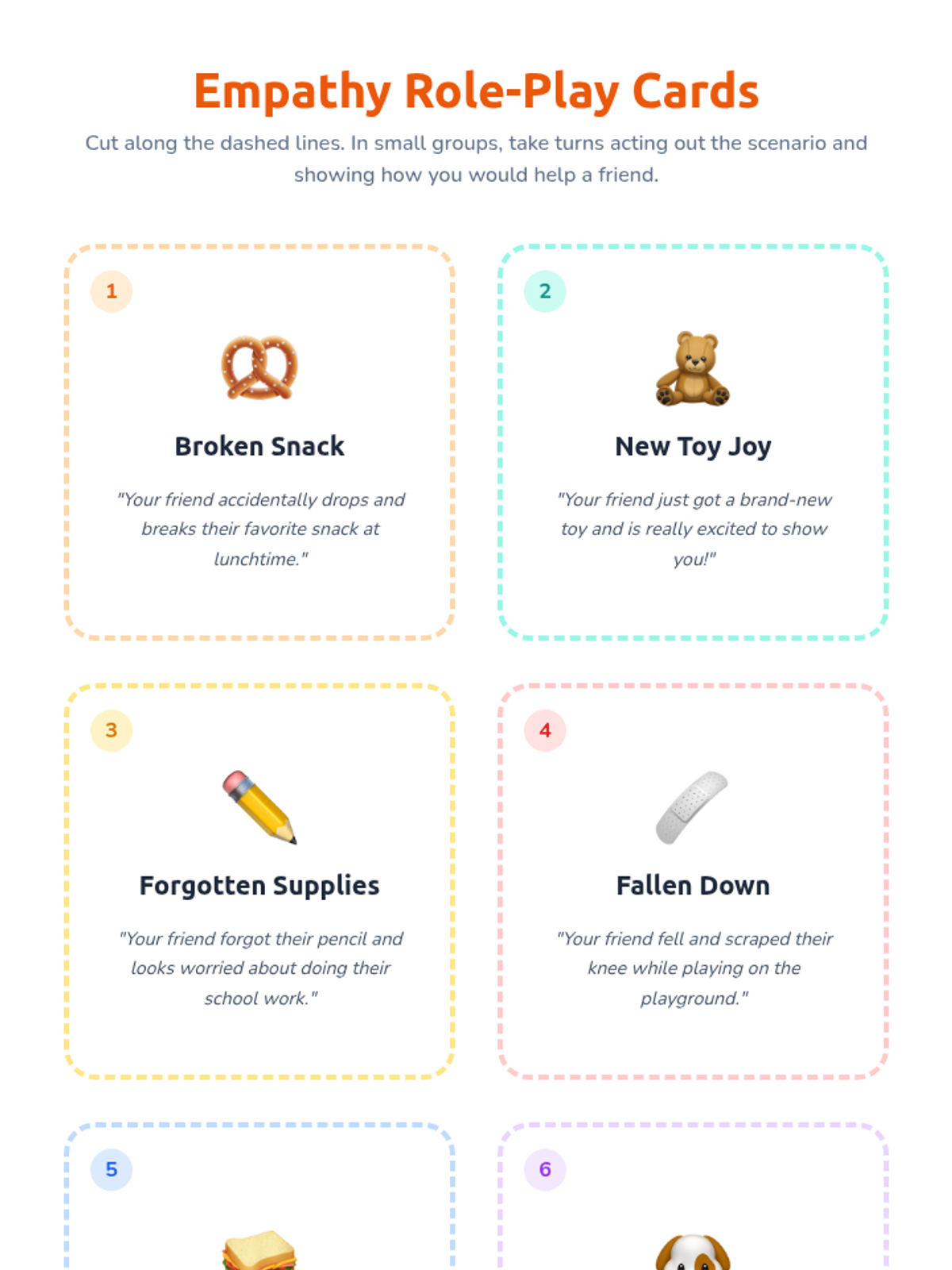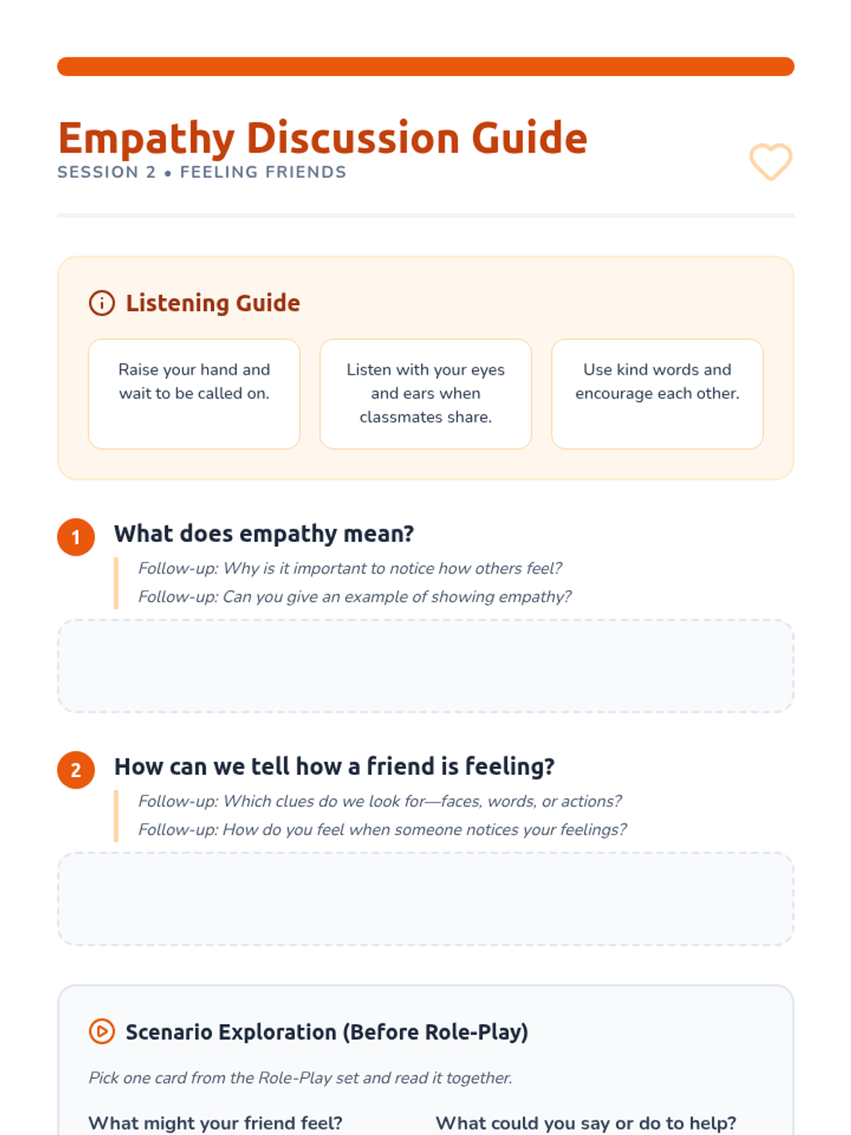 Students practice recognizing feelings and showing empathy through guided discussion and role-play scenarios.
