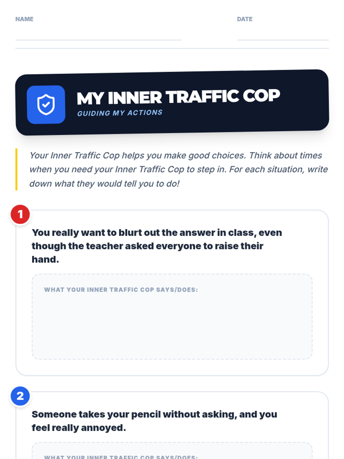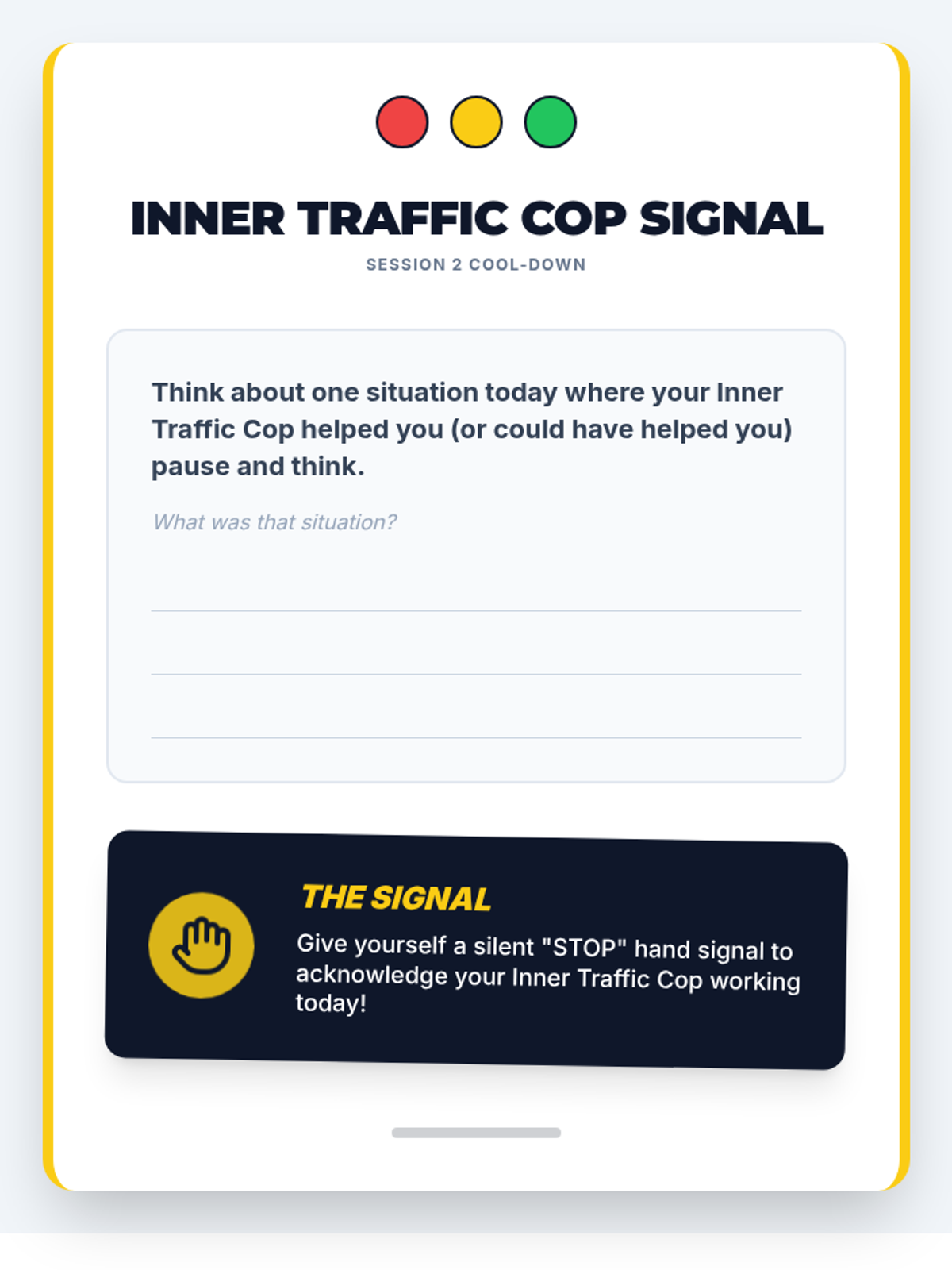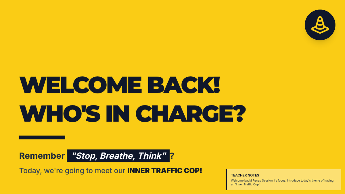 Students explore the 'Inner Traffic Cop' metaphor to understand how their brain can direct impulses and emotions to prevent 'crashes' in behavior.