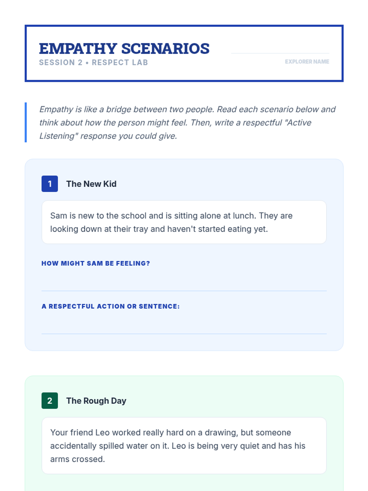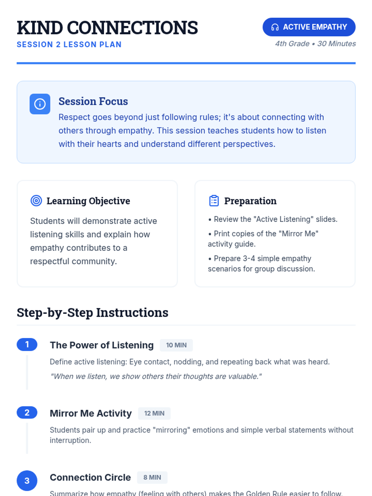 Focuses on active listening and empathy as key components of respect, teaching students how to understand and value the feelings and perspectives of others.