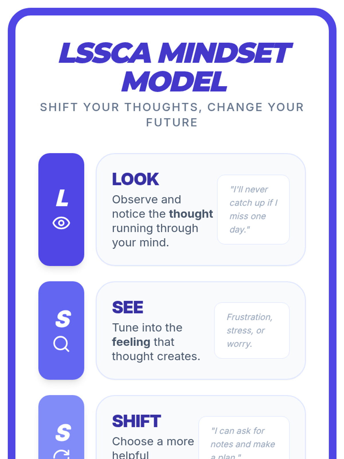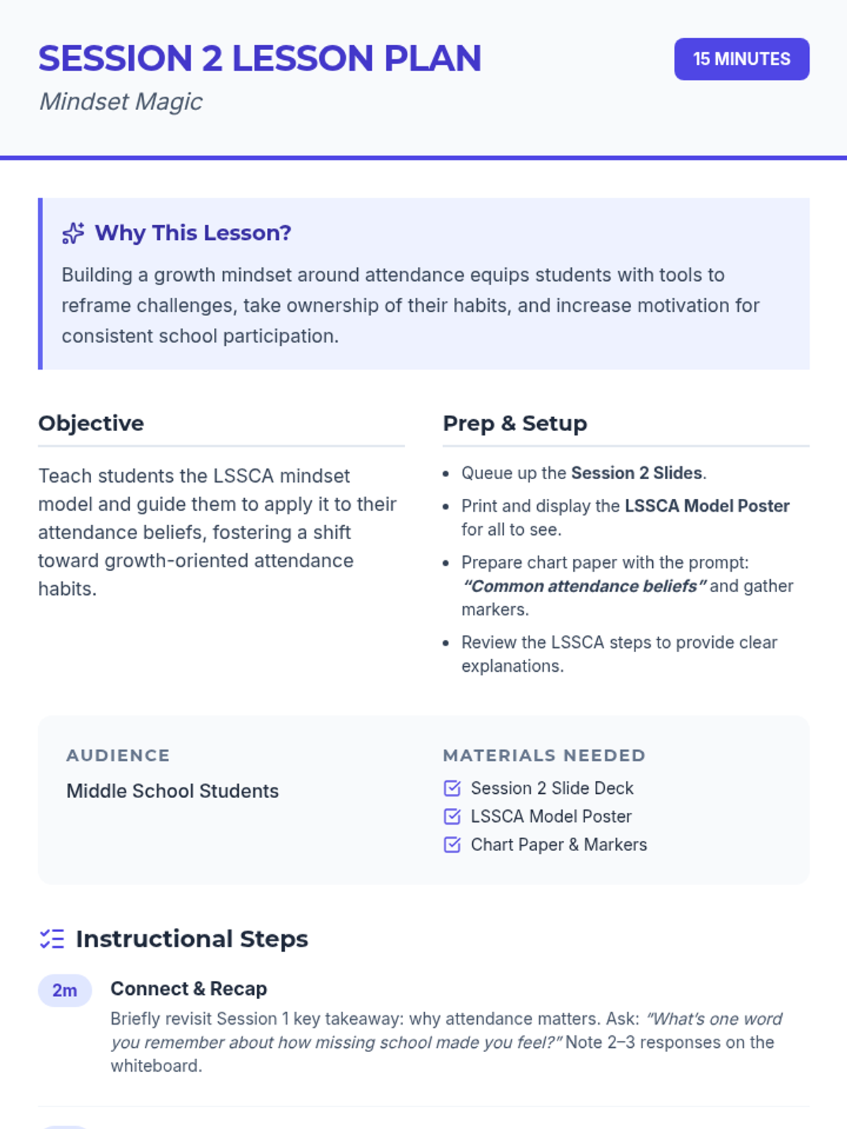 Teaches the LSSCA model to help students reframe negative thoughts about attendance.