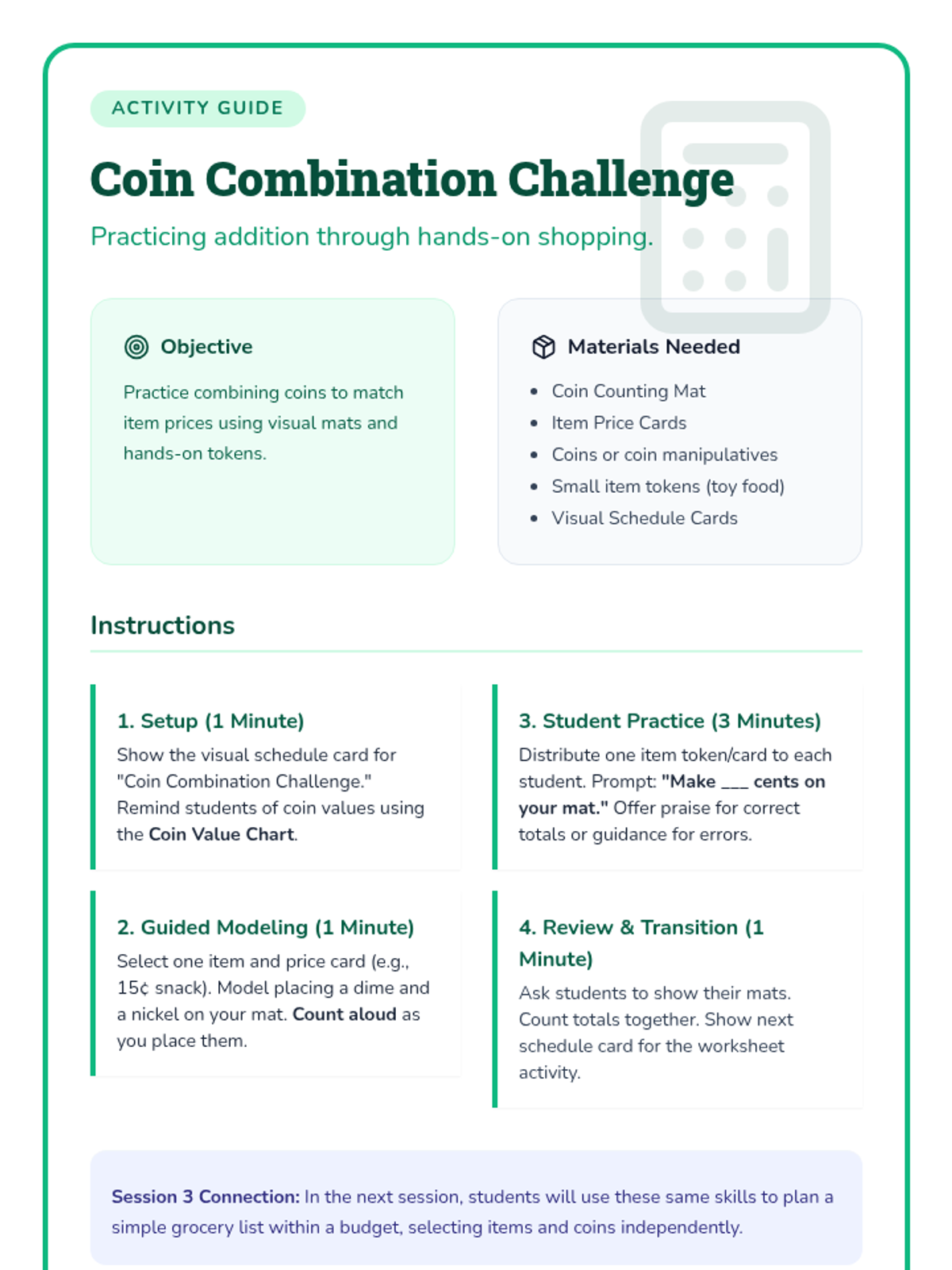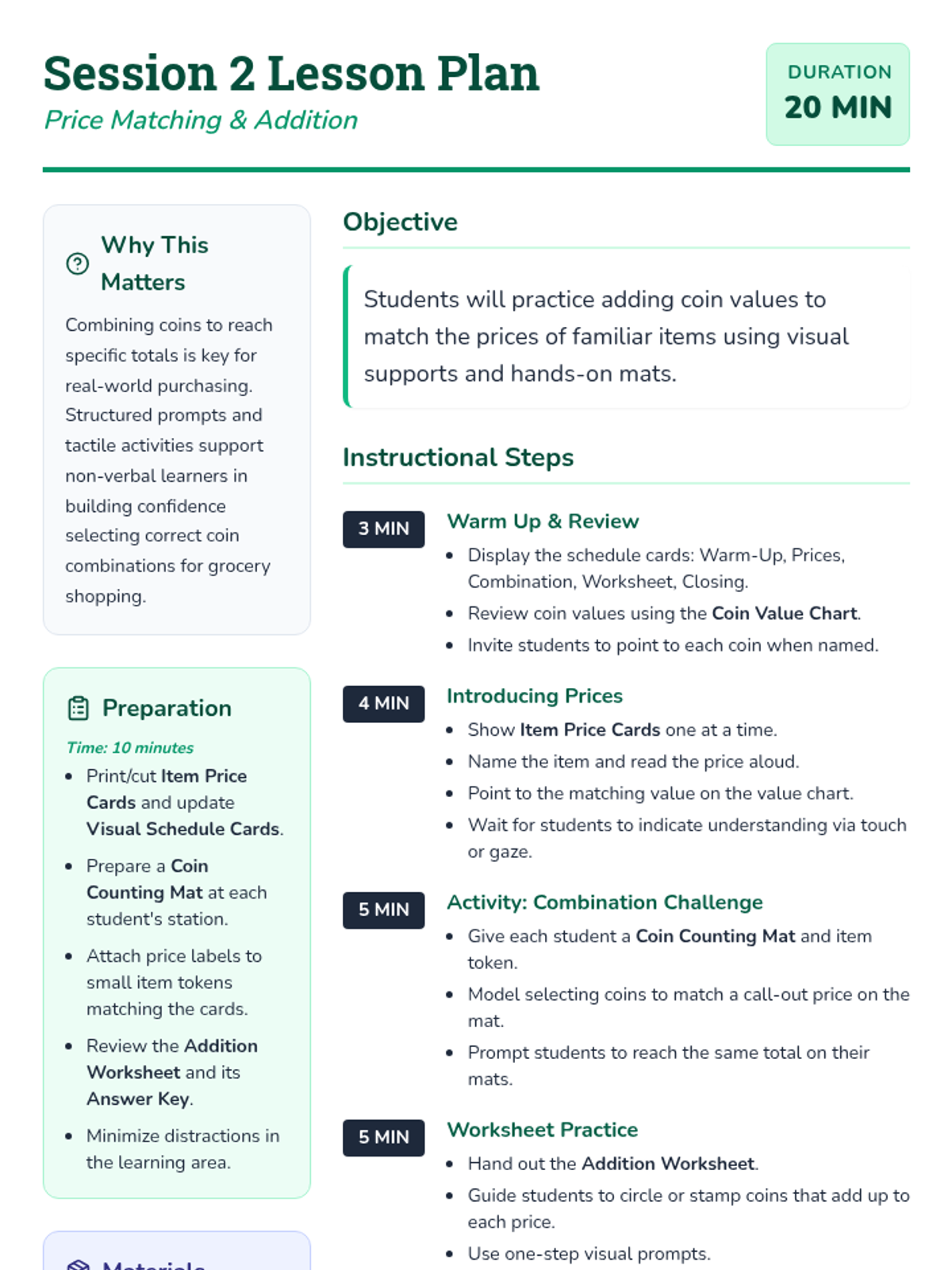 A comprehensive set of modified money skill resources focusing on coin/bill identification, same-denomination addition, price matching, and simple change making with visual prompts.