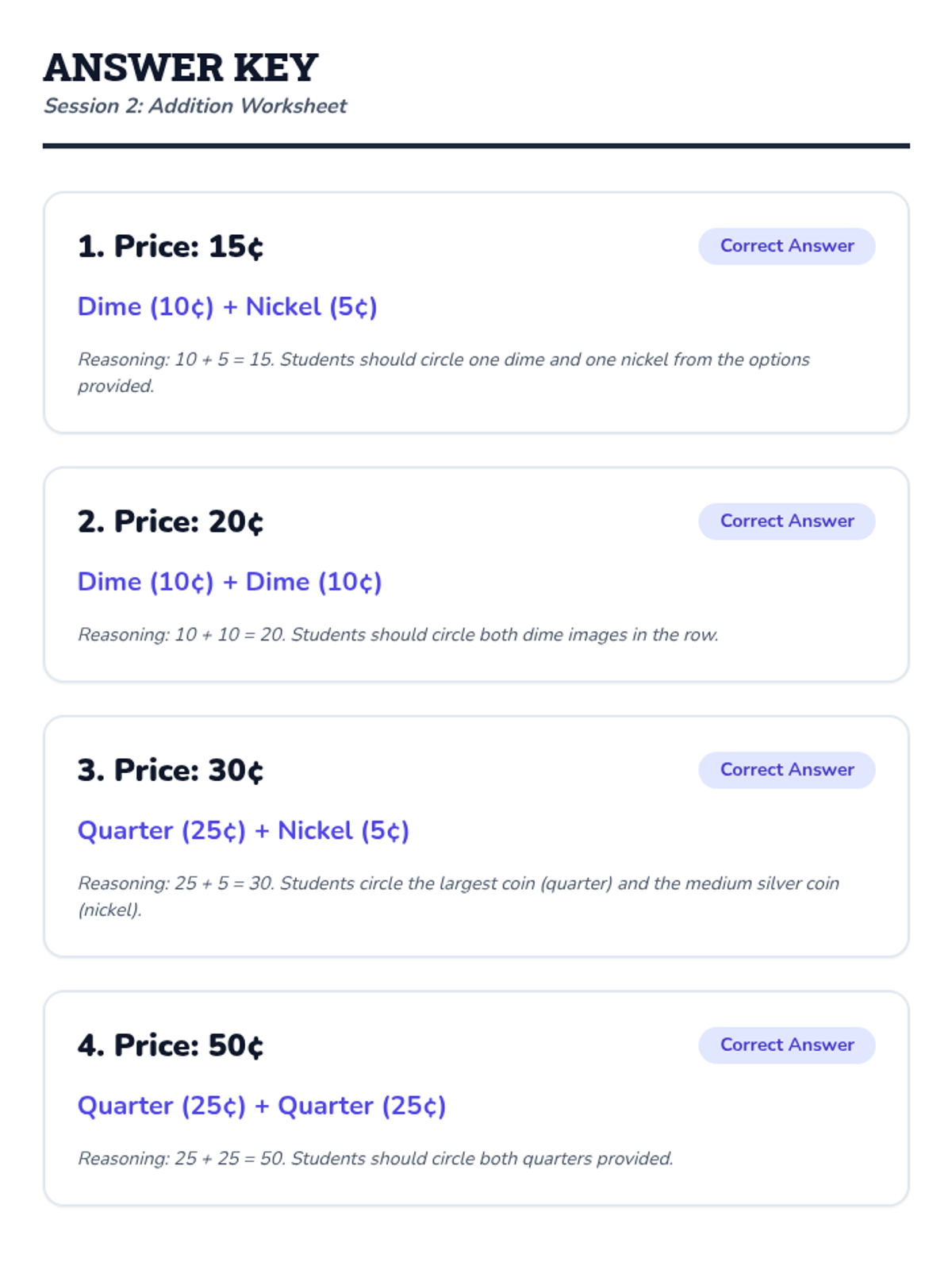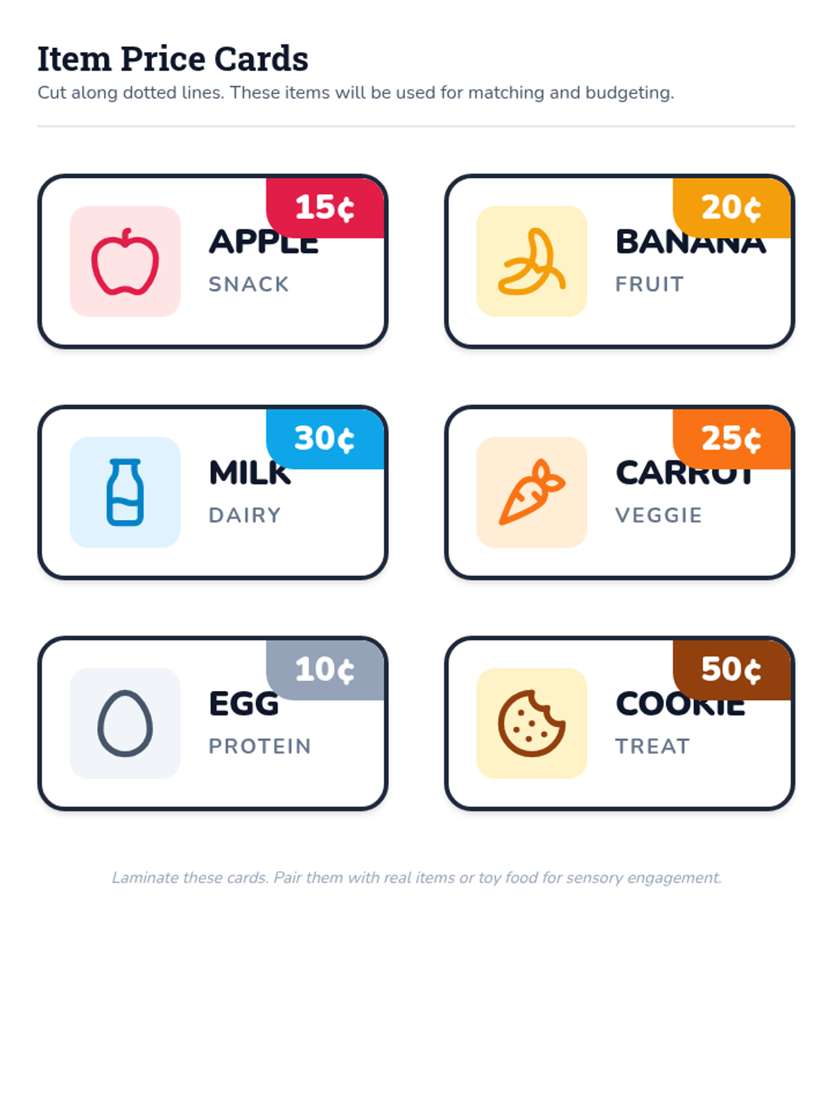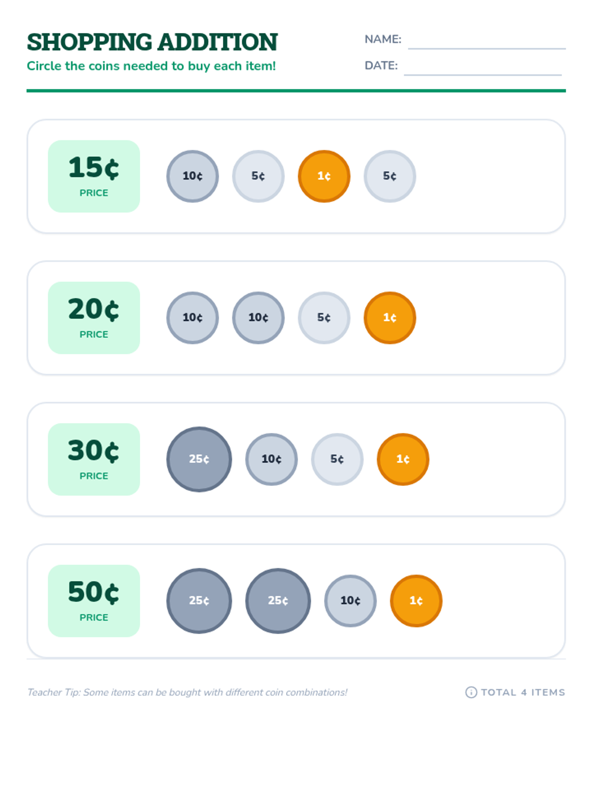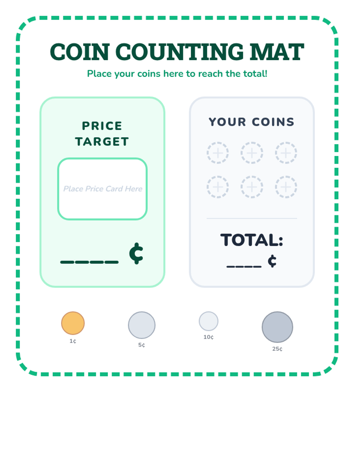 Students practice combining coins to reach specific totals for common grocery items using counting mats.