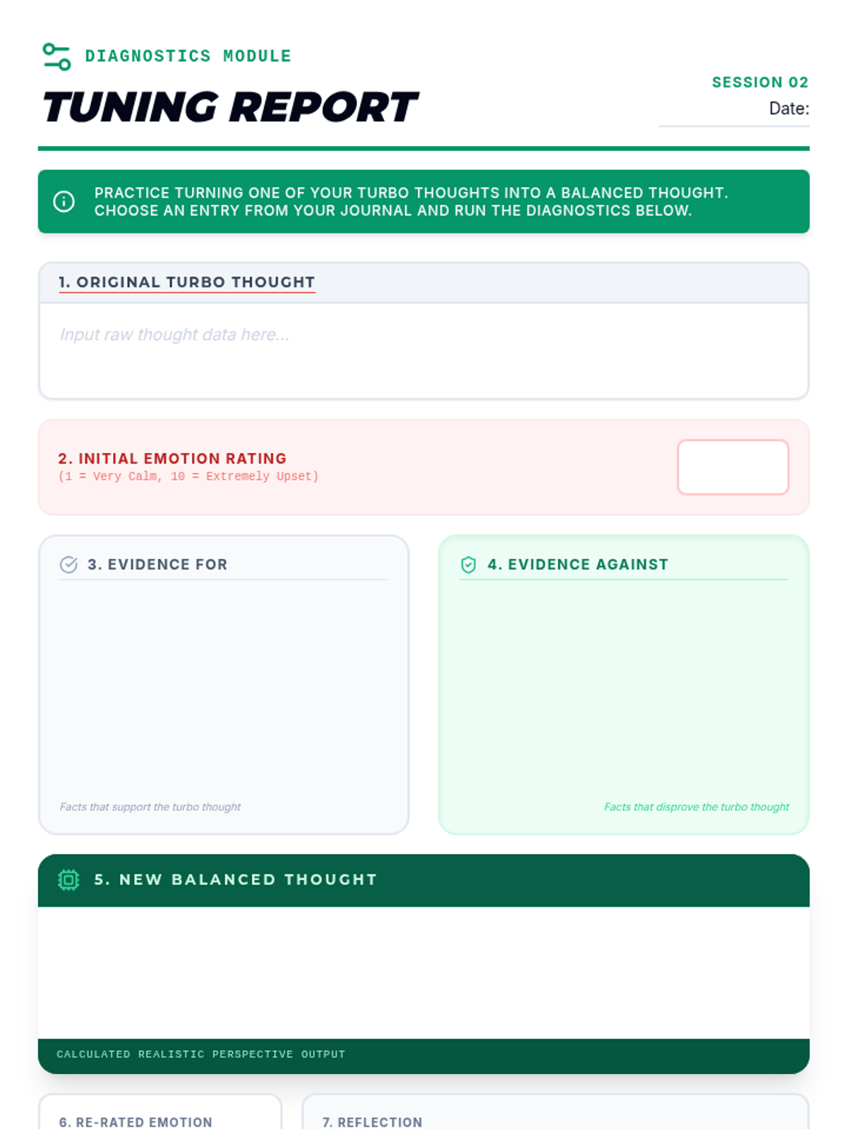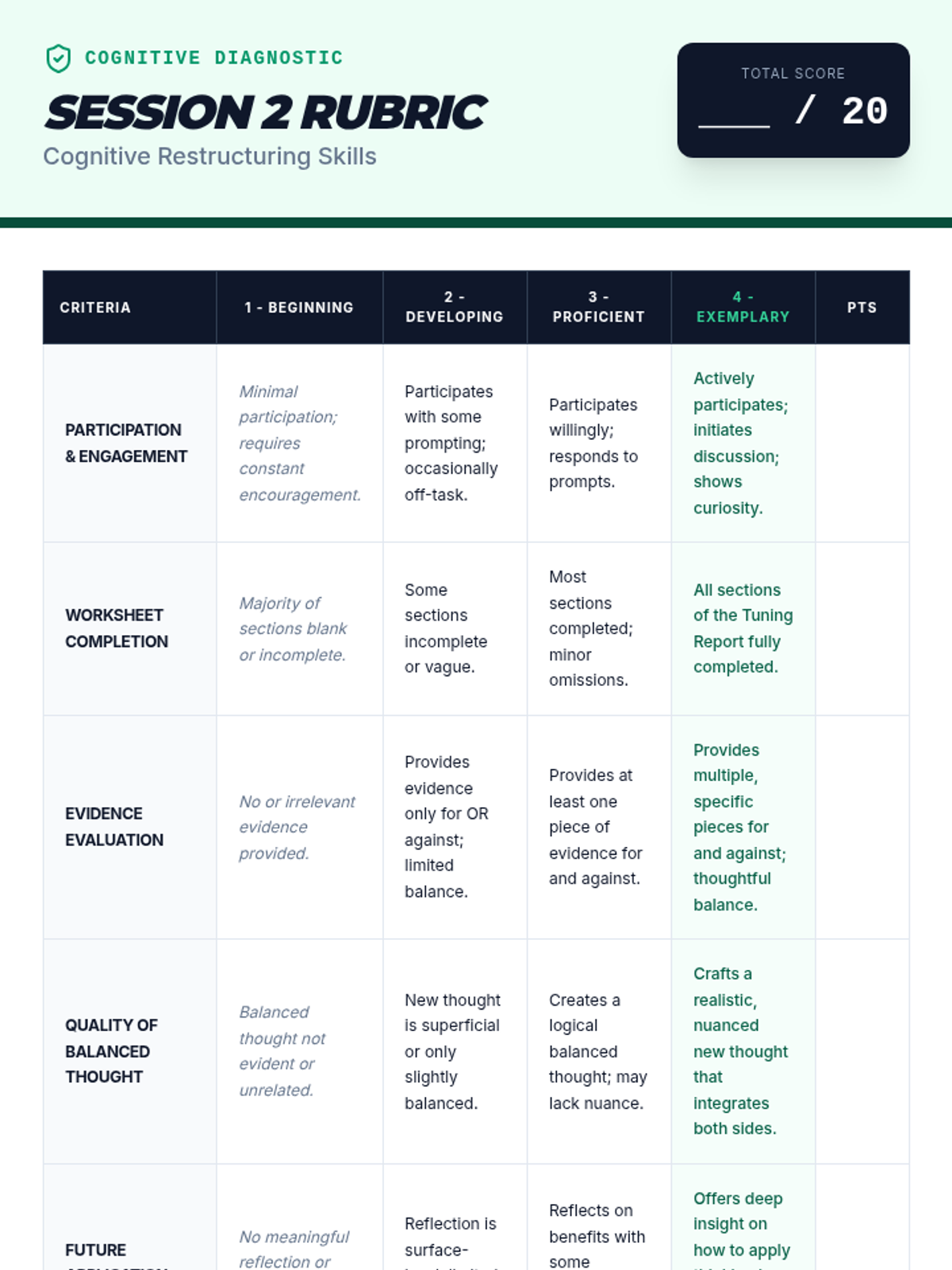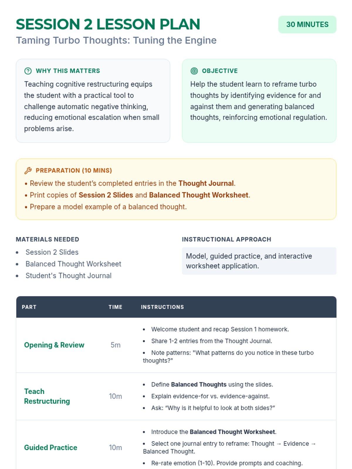 Introduces cognitive restructuring by teaching students to evaluate evidence for and against their negative thoughts and create more balanced perspectives.