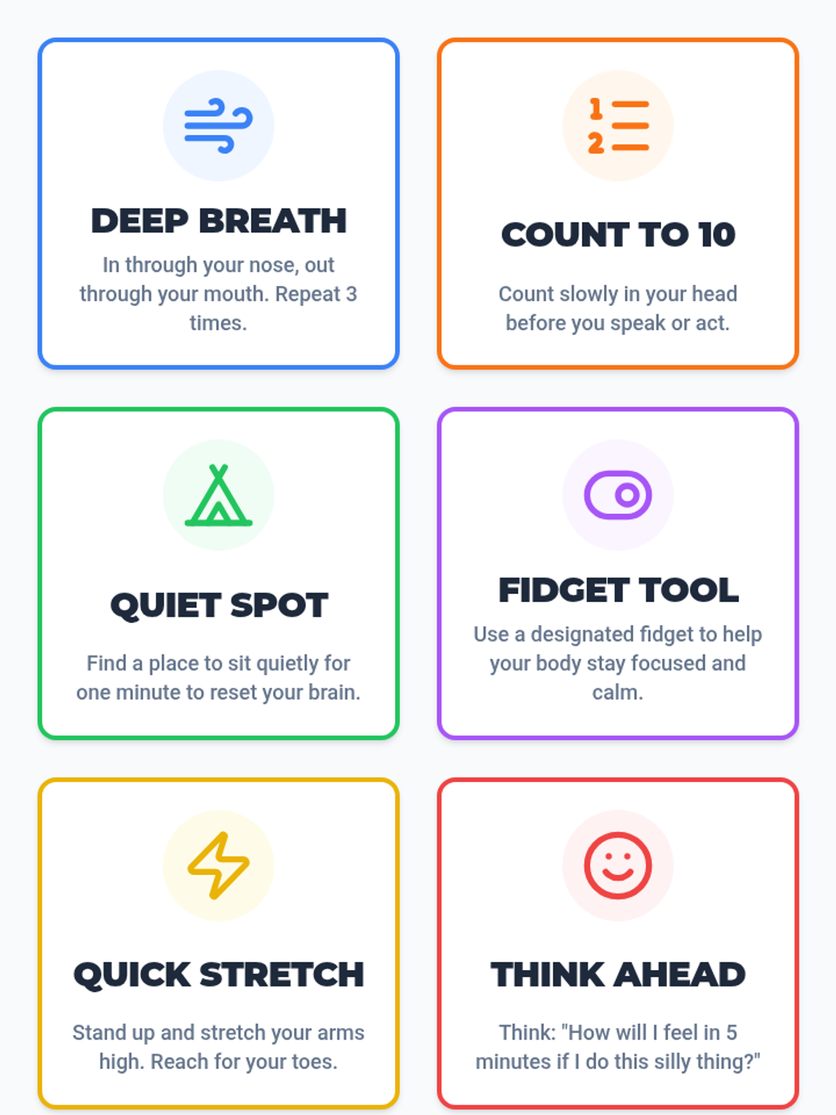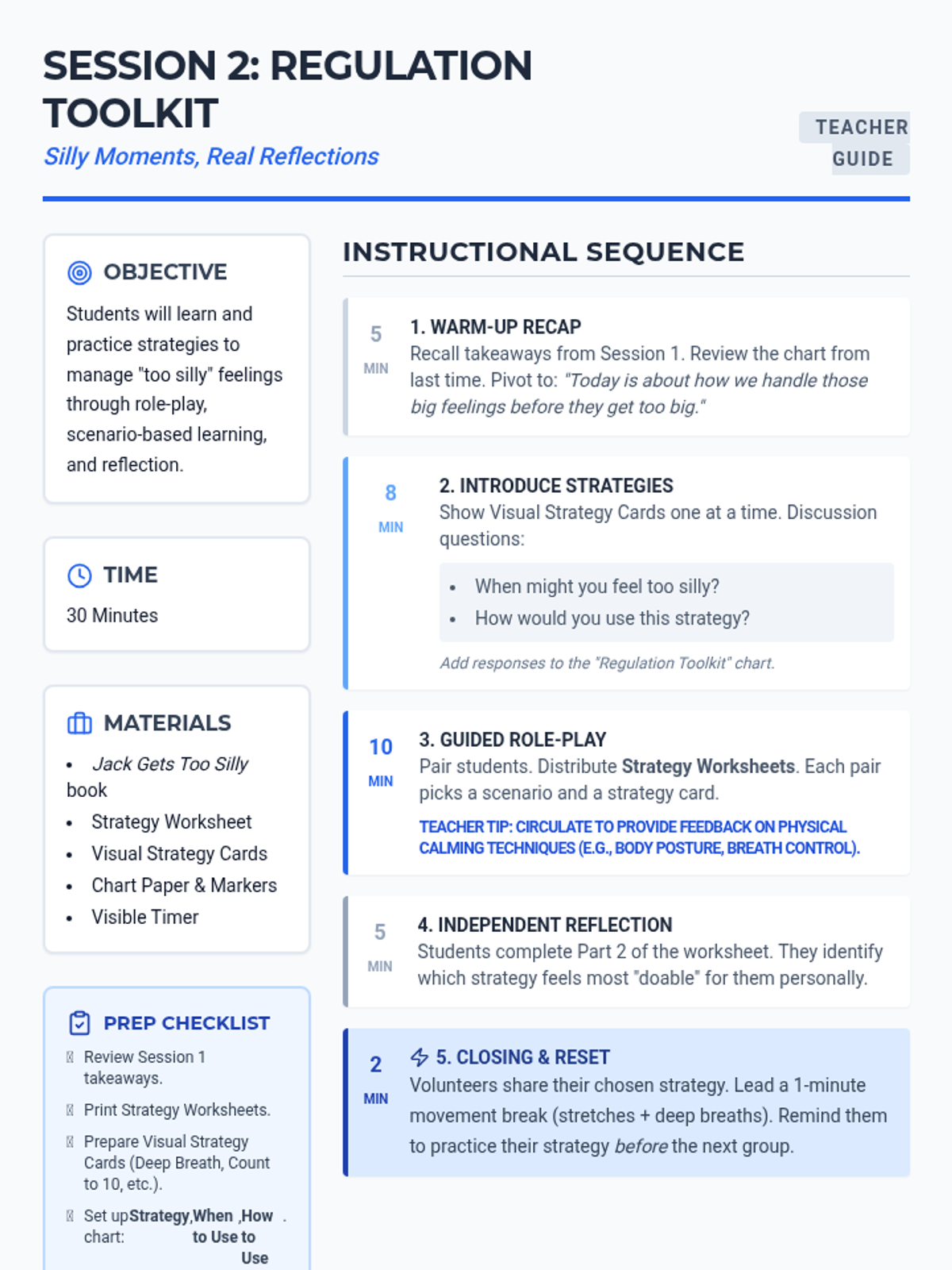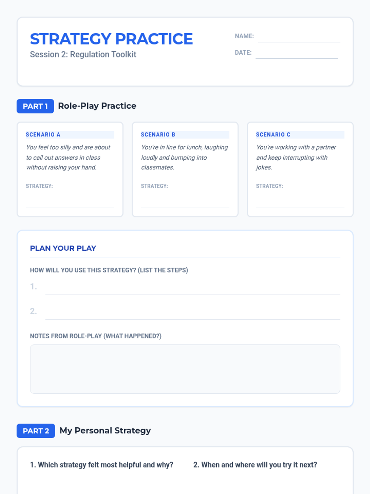Students identify and practice self-regulation strategies to manage 'too silly' moments using role-play and scenario-based learning.