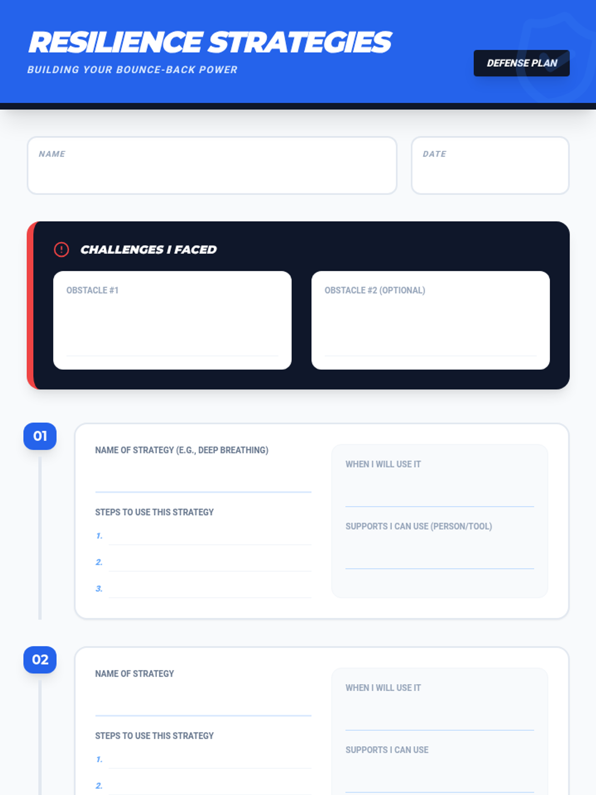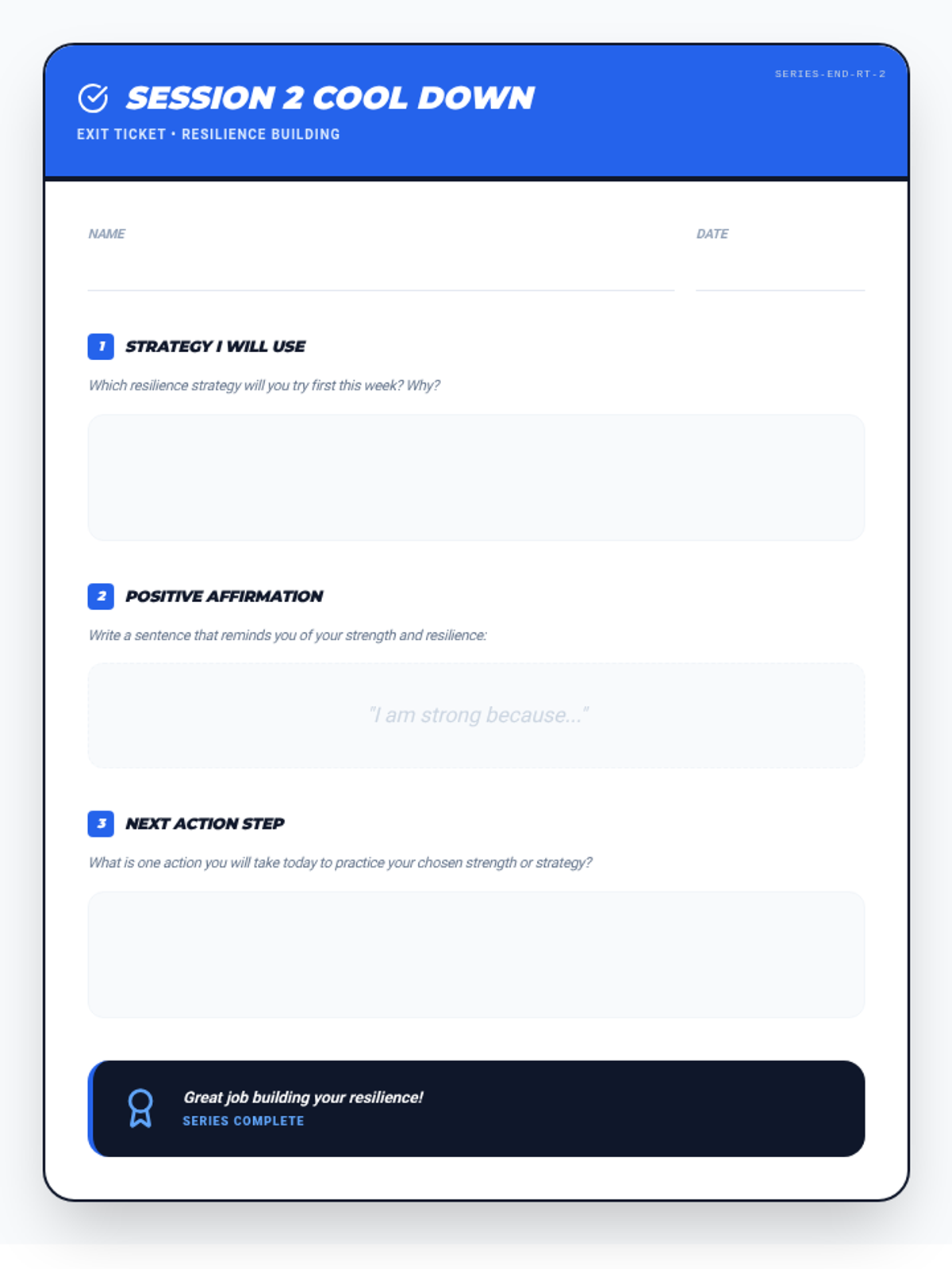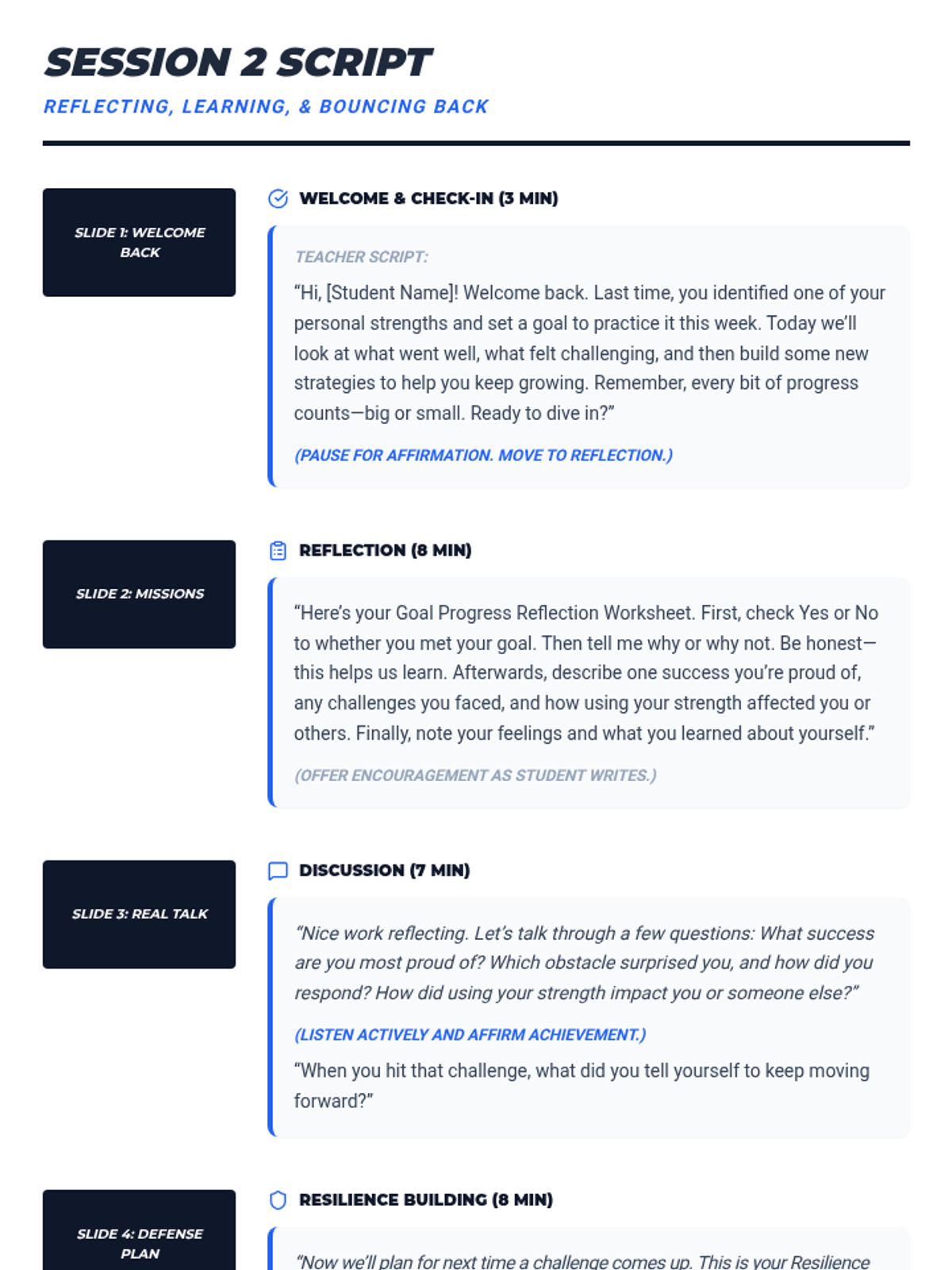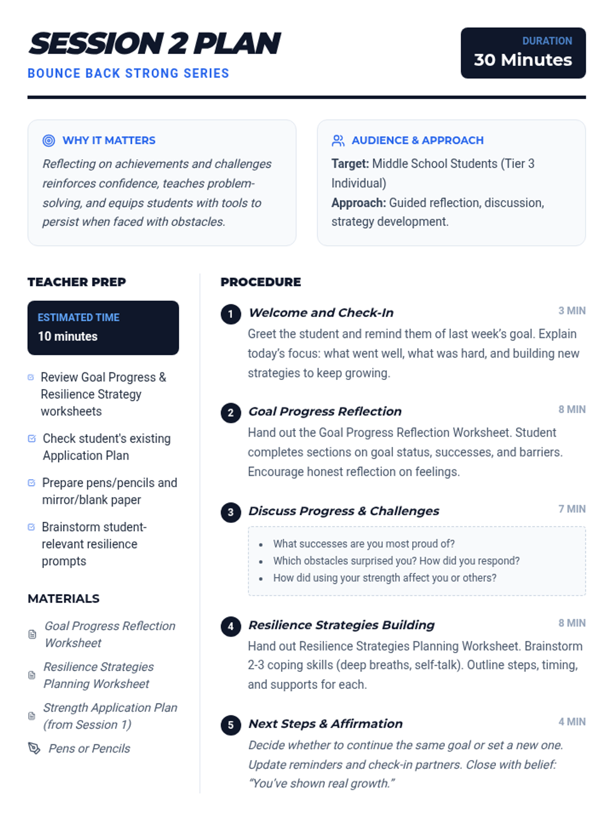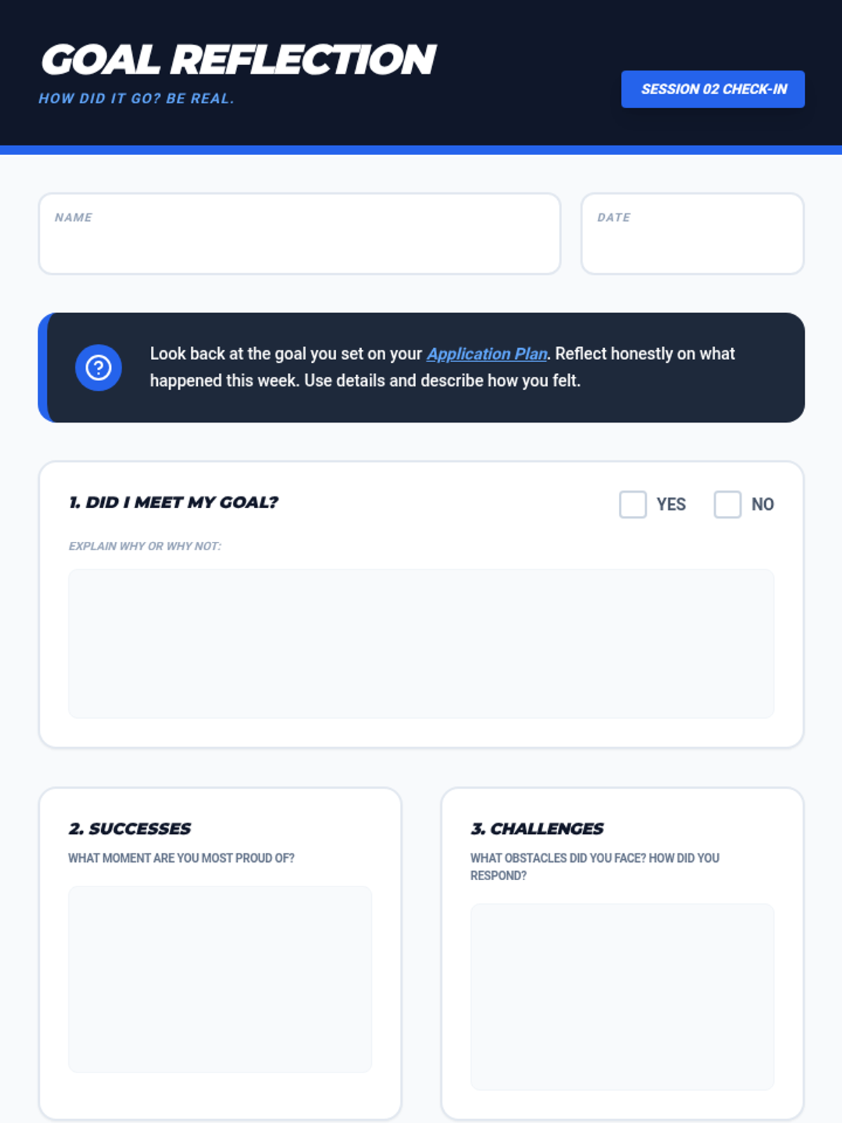 Focuses on reflecting on goal progress, identifying challenges, and developing resilience strategies.