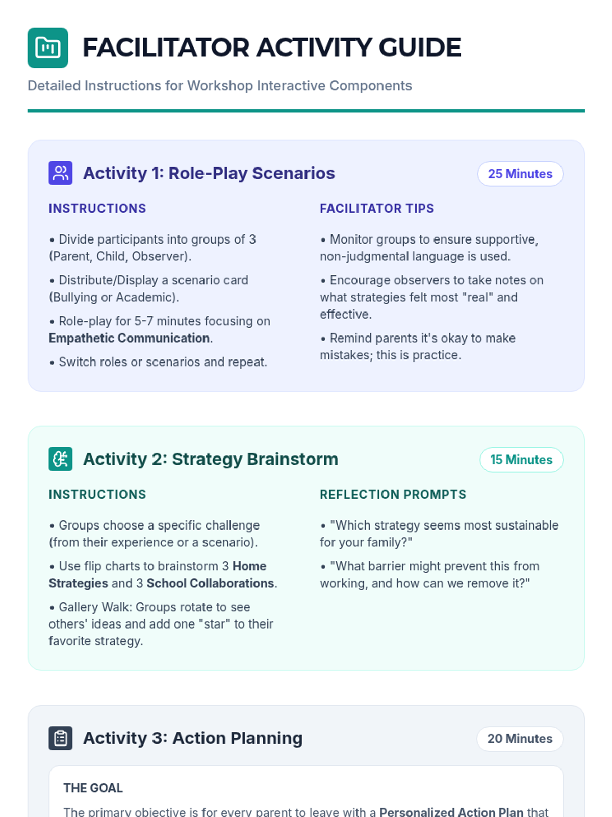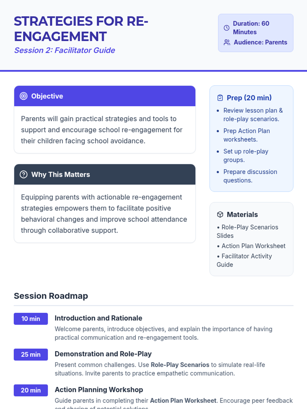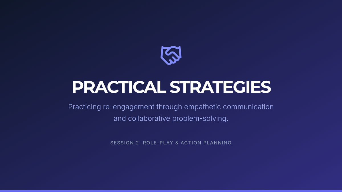 The second session provides parents with practical re-engagement strategies through role-play, communication techniques, and the development of personalized action plans.