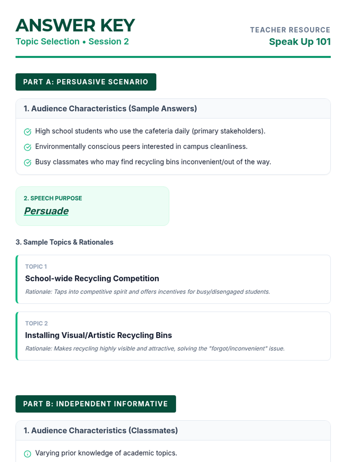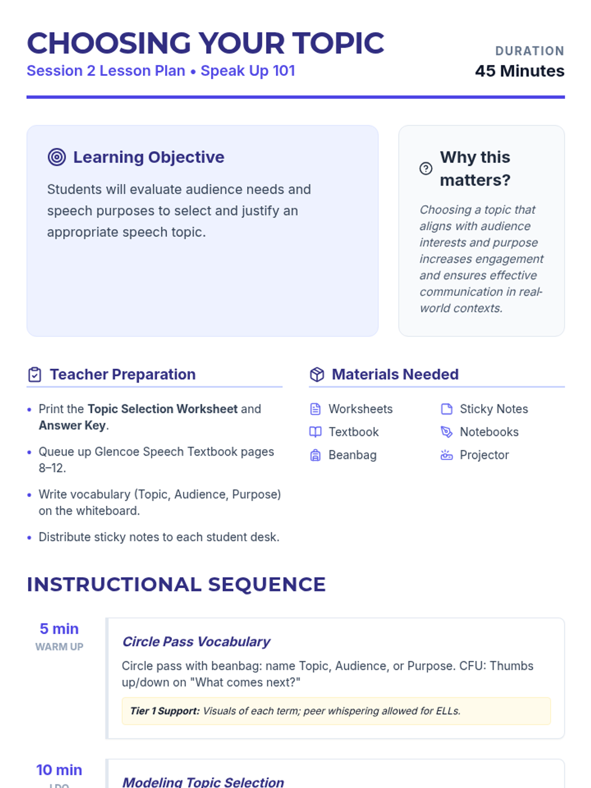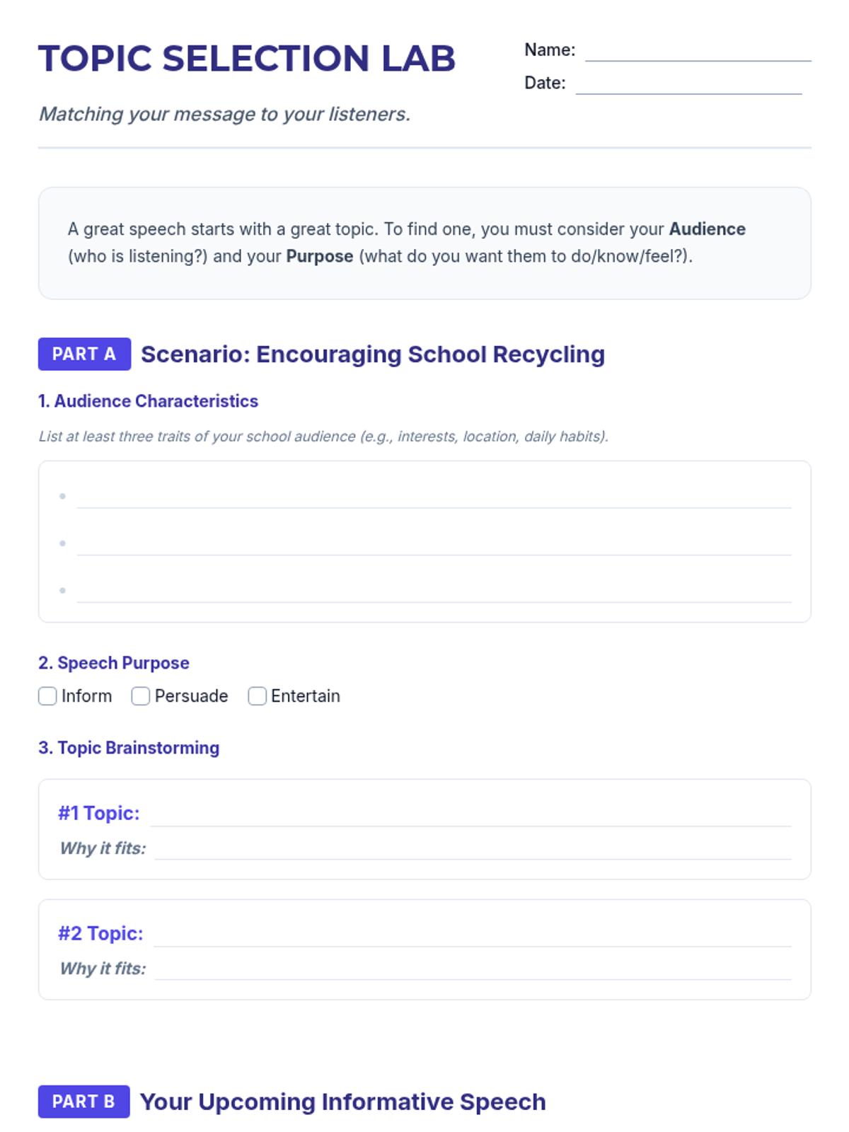 Students will evaluate audience needs and speech purposes to select and justify an appropriate speech topic.