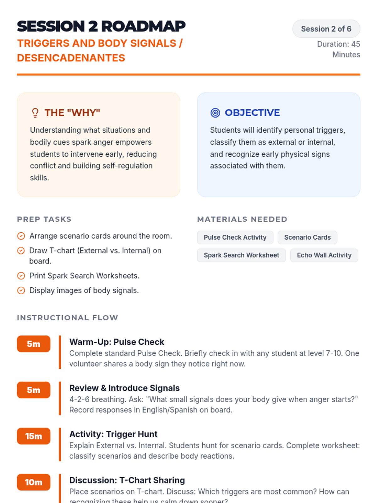 Focuses on identifying personal anger triggers, classifying them as external or internal, and recognizing early physical signs of anger.